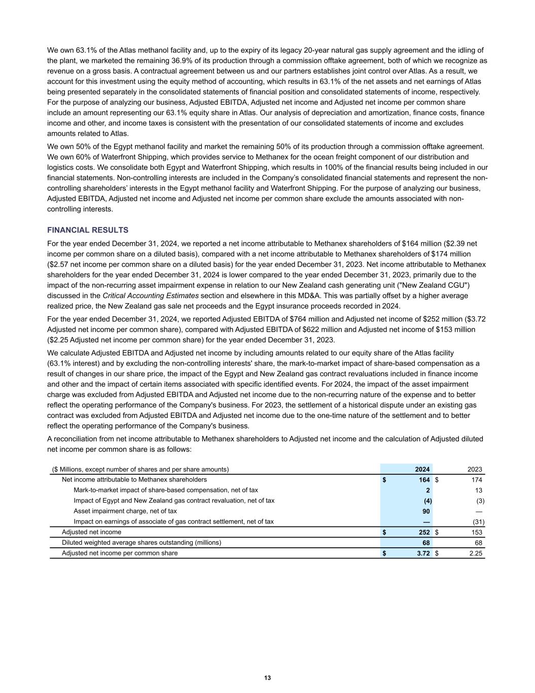 We own 63.1% of the Atlas methanol facility and, up to the expiry of its legacy 20-year natural gas supply agreement and the idling of the plant, we marketed the remaining 36.9% of its production through a commission offtake agreement, both of which we recognize as revenue on a gross basis. A contractual agreement between us and our partners establishes joint control over Atlas. As a result, we account for this investment using the equity method of accounting, which results in 63.1% of the net assets and net earnings of Atlas being presented separately in the consolidated statements of financial position and consolidated statements of income, respectively. For the purpose of analyzing our business, Adjusted EBITDA, Adjusted net income and Adjusted net income per common share include an amount representing our 63.1% equity share in Atlas. Our analysis of depreciation and amortization, finance costs, finance income and other, and income taxes is consistent with the presentation of our consolidated statements of income and excludes amounts related to Atlas. We own 50% of the Egypt methanol facility and market the remaining 50% of its production through a commission offtake agreement. We own 60% of Waterfront Shipping, which provides service to Methanex for the ocean freight component of our distribution and logistics costs. We consolidate both Egypt and Waterfront Shipping, which results in 100% of the financial results being included in our financial statements. Non-controlling interests are included in the Company’s consolidated financial statements and represent the non- controlling shareholders’ interests in the Egypt methanol facility and Waterfront Shipping. For the purpose of analyzing our business, Adjusted EBITDA, Adjusted net income and Adjusted net income per common share exclude the amounts associated with non- controlling interests. FINANCIAL RESULTS For the year ended December 31, 2024, we reported a net income attributable to Methanex shareholders of $164 million ($2.39 net income per common share on a diluted basis), compared with a net income attributable to Methanex shareholders of $174 million ($2.57 net income per common share on a diluted basis) for the year ended December 31, 2023. Net income attributable to Methanex shareholders for the year ended December 31, 2024 is lower compared to the year ended December 31, 2023, primarily due to the impact of the non-recurring asset impairment expense in relation to our New Zealand cash generating unit ("New Zealand CGU") discussed in the Critical Accounting Estimates section and elsewhere in this MD&A. This was partially offset by a higher average realized price, the New Zealand gas sale net proceeds and the Egypt insurance proceeds recorded in 2024. For the year ended December 31, 2024, we reported Adjusted EBITDA of $764 million and Adjusted net income of $252 million ($3.72 Adjusted net income per common share), compared with Adjusted EBITDA of $622 million and Adjusted net income of $153 million ($2.25 Adjusted net income per common share) for the year ended December 31, 2023. We calculate Adjusted EBITDA and Adjusted net income by including amounts related to our equity share of the Atlas facility (63.1% interest) and by excluding the non-controlling interests' share, the mark-to-market impact of share-based compensation as a result of changes in our share price, the impact of the Egypt and New Zealand gas contract revaluations included in finance income and other and the impact of certain items associated with specific identified events. For 2024, the impact of the asset impairment charge was excluded from Adjusted EBITDA and Adjusted net income due to the non-recurring nature of the expense and to better reflect the operating performance of the Company's business. For 2023, the settlement of a historical dispute under an existing gas contract was excluded from Adjusted EBITDA and Adjusted net income due to the one-time nature of the settlement and to better reflect the operating performance of the Company's business. A reconciliation from net income attributable to Methanex shareholders to Adjusted net income and the calculation of Adjusted diluted net income per common share is as follows: Net income attributable to Methanex shareholders $ 164 $ 174 Mark-to-market impact of share-based compensation, net of tax 2 13 Impact of Egypt and New Zealand gas contract revaluation, net of tax (4) (3) Asset impairment charge, net of tax 90 — Impact on earnings of associate of gas contract settlement, net of tax — (31) Adjusted net income $ 252 $ 153 Diluted weighted average shares outstanding (millions) 68 68 Adjusted net income per common share $ 3.72 $ 2.25 ($ Millions, except number of shares and per share amounts) 2024 2023 13