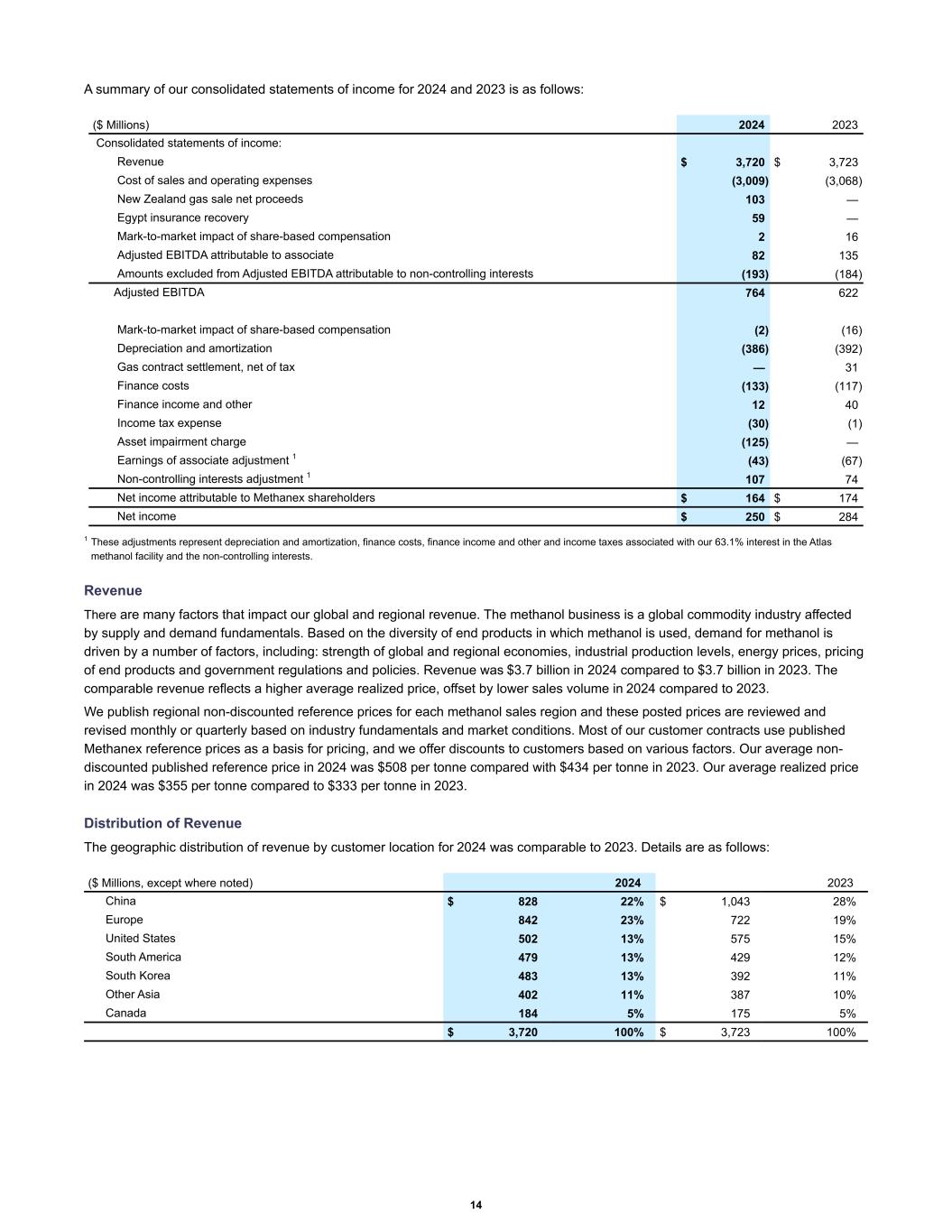 A summary of our consolidated statements of income for 2024 and 2023 is as follows: Consolidated statements of income: Revenue $ 3,720 $ 3,723 Cost of sales and operating expenses (3,009) (3,068) New Zealand gas sale net proceeds 103 — Egypt insurance recovery 59 — Mark-to-market impact of share-based compensation 2 16 Adjusted EBITDA attributable to associate 82 135 Amounts excluded from Adjusted EBITDA attributable to non-controlling interests (193) (184) Adjusted EBITDA 764 622 Mark-to-market impact of share-based compensation (2) (16) Depreciation and amortization (386) (392) Gas contract settlement, net of tax — 31 Finance costs (133) (117) Finance income and other 12 40 Income tax expense (30) (1) Asset impairment charge (125) — Earnings of associate adjustment 1 (43) (67) Non-controlling interests adjustment 1 107 74 Net income attributable to Methanex shareholders $ 164 $ 174 Net income $ 250 $ 284 ($ Millions) 2024 2023 1 These adjustments represent depreciation and amortization, finance costs, finance income and other and income taxes associated with our 63.1% interest in the Atlas methanol facility and the non-controlling interests. Revenue There are many factors that impact our global and regional revenue. The methanol business is a global commodity industry affected by supply and demand fundamentals. Based on the diversity of end products in which methanol is used, demand for methanol is driven by a number of factors, including: strength of global and regional economies, industrial production levels, energy prices, pricing of end products and government regulations and policies. Revenue was $3.7 billion in 2024 compared to $3.7 billion in 2023. The comparable revenue reflects a higher average realized price, offset by lower sales volume in 2024 compared to 2023. We publish regional non-discounted reference prices for each methanol sales region and these posted prices are reviewed and revised monthly or quarterly based on industry fundamentals and market conditions. Most of our customer contracts use published Methanex reference prices as a basis for pricing, and we offer discounts to customers based on various factors. Our average non- discounted published reference price in 2024 was $508 per tonne compared with $434 per tonne in 2023. Our average realized price in 2024 was $355 per tonne compared to $333 per tonne in 2023. Distribution of Revenue The geographic distribution of revenue by customer location for 2024 was comparable to 2023. Details are as follows: China $ 828 22 % $ 1,043 28 % Europe 842 23 % 722 19 % United States 502 13 % 575 15 % South America 479 13 % 429 12 % South Korea 483 13 % 392 11 % Other Asia 402 11 % 387 10 % Canada 184 5 % 175 5 % $ 3,720 100 % $ 3,723 100 % ($ Millions, except where noted) 2024 2023 14