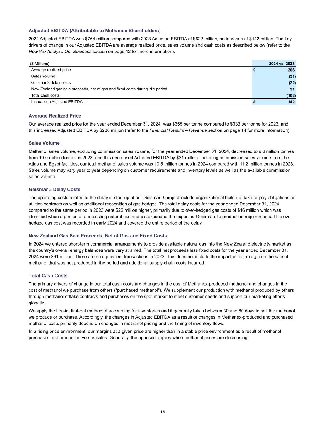 Adjusted EBITDA (Attributable to Methanex Shareholders) 2024 Adjusted EBITDA was $764 million compared with 2023 Adjusted EBITDA of $622 million, an increase of $142 million. The key drivers of change in our Adjusted EBITDA are average realized price, sales volume and cash costs as described below (refer to the How We Analyze Our Business section on page 12 for more information). Average realized price $ 206 Sales volume (31) Geismar 3 delay costs (22) New Zealand gas sale proceeds, net of gas and fixed costs during idle period 91 Total cash costs (102) Increase in Adjusted EBITDA $ 142 ($ Millions) 2024 vs. 2023 Average Realized Price Our average realized price for the year ended December 31, 2024, was $355 per tonne compared to $333 per tonne for 2023, and this increased Adjusted EBITDA by $206 million (refer to the Financial Results – Revenue section on page 14 for more information). Sales Volume Methanol sales volume, excluding commission sales volume, for the year ended December 31, 2024, decreased to 9.6 million tonnes from 10.0 million tonnes in 2023, and this decreased Adjusted EBITDA by $31 million. Including commission sales volume from the Atlas and Egypt facilities, our total methanol sales volume was 10.5 million tonnes in 2024 compared with 11.2 million tonnes in 2023. Sales volume may vary year to year depending on customer requirements and inventory levels as well as the available commission sales volume. Geismar 3 Delay Costs The operating costs related to the delay in start-up of our Geismar 3 project include organizational build-up, take-or-pay obligations on utilities contracts as well as additional recognition of gas hedges. The total delay costs for the year ended December 31, 2024 compared to the same period in 2023 were $22 million higher, primarily due to over-hedged gas costs of $16 million which was identified when a portion of our existing natural gas hedges exceeded the expected Geismar site production requirements. This over- hedged gas cost was recorded in early 2024 and covered the entire period of the delay. New Zealand Gas Sale Proceeds, Net of Gas and Fixed Costs In 2024 we entered short-term commercial arrangements to provide available natural gas into the New Zealand electricity market as the country’s overall energy balances were very strained. The total net proceeds less fixed costs for the year ended December 31, 2024 were $91 million. There are no equivalent transactions in 2023. This does not include the impact of lost margin on the sale of methanol that was not produced in the period and additional supply chain costs incurred. Total Cash Costs The primary drivers of change in our total cash costs are changes in the cost of Methanex-produced methanol and changes in the cost of methanol we purchase from others ("purchased methanol"). We supplement our production with methanol produced by others through methanol offtake contracts and purchases on the spot market to meet customer needs and support our marketing efforts globally. We apply the first-in, first-out method of accounting for inventories and it generally takes between 30 and 60 days to sell the methanol we produce or purchase. Accordingly, the changes in Adjusted EBITDA as a result of changes in Methanex-produced and purchased methanol costs primarily depend on changes in methanol pricing and the timing of inventory flows. In a rising price environment, our margins at a given price are higher than in a stable price environment as a result of methanol purchases and production versus sales. Generally, the opposite applies when methanol prices are decreasing. 15