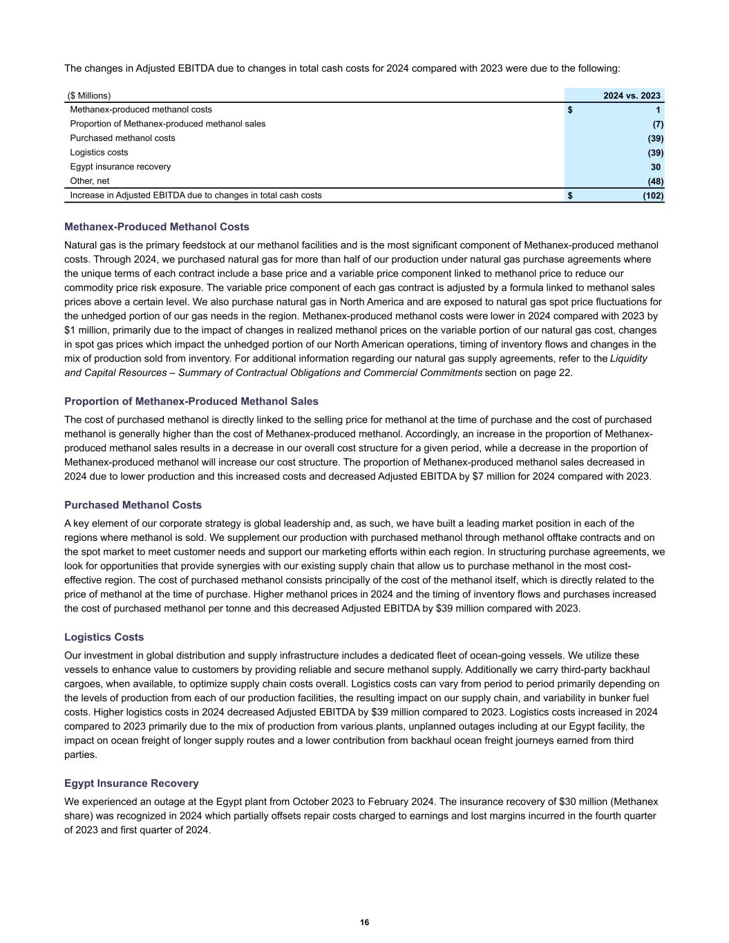 The changes in Adjusted EBITDA due to changes in total cash costs for 2024 compared with 2023 were due to the following: Methanex-produced methanol costs $ 1 Proportion of Methanex-produced methanol sales (7) Purchased methanol costs (39) Logistics costs (39) Egypt insurance recovery 30 Other, net (48) Increase in Adjusted EBITDA due to changes in total cash costs $ (102) ($ Millions) 2024 vs. 2023 Methanex-Produced Methanol Costs Natural gas is the primary feedstock at our methanol facilities and is the most significant component of Methanex-produced methanol costs. Through 2024, we purchased natural gas for more than half of our production under natural gas purchase agreements where the unique terms of each contract include a base price and a variable price component linked to methanol price to reduce our commodity price risk exposure. The variable price component of each gas contract is adjusted by a formula linked to methanol sales prices above a certain level. We also purchase natural gas in North America and are exposed to natural gas spot price fluctuations for the unhedged portion of our gas needs in the region. Methanex-produced methanol costs were lower in 2024 compared with 2023 by $1 million, primarily due to the impact of changes in realized methanol prices on the variable portion of our natural gas cost, changes in spot gas prices which impact the unhedged portion of our North American operations, timing of inventory flows and changes in the mix of production sold from inventory. For additional information regarding our natural gas supply agreements, refer to the Liquidity and Capital Resources – Summary of Contractual Obligations and Commercial Commitments section on page 22. Proportion of Methanex-Produced Methanol Sales The cost of purchased methanol is directly linked to the selling price for methanol at the time of purchase and the cost of purchased methanol is generally higher than the cost of Methanex-produced methanol. Accordingly, an increase in the proportion of Methanex- produced methanol sales results in a decrease in our overall cost structure for a given period, while a decrease in the proportion of Methanex-produced methanol will increase our cost structure. The proportion of Methanex-produced methanol sales decreased in 2024 due to lower production and this increased costs and decreased Adjusted EBITDA by $7 million for 2024 compared with 2023. Purchased Methanol Costs A key element of our corporate strategy is global leadership and, as such, we have built a leading market position in each of the regions where methanol is sold. We supplement our production with purchased methanol through methanol offtake contracts and on the spot market to meet customer needs and support our marketing efforts within each region. In structuring purchase agreements, we look for opportunities that provide synergies with our existing supply chain that allow us to purchase methanol in the most cost- effective region. The cost of purchased methanol consists principally of the cost of the methanol itself, which is directly related to the price of methanol at the time of purchase. Higher methanol prices in 2024 and the timing of inventory flows and purchases increased the cost of purchased methanol per tonne and this decreased Adjusted EBITDA by $39 million compared with 2023. Logistics Costs Our investment in global distribution and supply infrastructure includes a dedicated fleet of ocean-going vessels. We utilize these vessels to enhance value to customers by providing reliable and secure methanol supply. Additionally we carry third-party backhaul cargoes, when available, to optimize supply chain costs overall. Logistics costs can vary from period to period primarily depending on the levels of production from each of our production facilities, the resulting impact on our supply chain, and variability in bunker fuel costs. Higher logistics costs in 2024 decreased Adjusted EBITDA by $39 million compared to 2023. Logistics costs increased in 2024 compared to 2023 primarily due to the mix of production from various plants, unplanned outages including at our Egypt facility, the impact on ocean freight of longer supply routes and a lower contribution from backhaul ocean freight journeys earned from third parties. Egypt Insurance Recovery We experienced an outage at the Egypt plant from October 2023 to February 2024. The insurance recovery of $30 million (Methanex share) was recognized in 2024 which partially offsets repair costs charged to earnings and lost margins incurred in the fourth quarter of 2023 and first quarter of 2024. 16