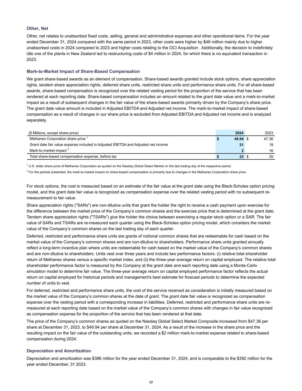 Other, Net Other, net relates to unabsorbed fixed costs, selling, general and administrative expenses and other operational items. For the year ended December 31, 2024 compared with the same period in 2023, other costs were higher by $48 million mainly due to higher unabsorbed costs in 2024 compared to 2023 and higher costs relating to the OCI Acquisition . Additionally, the decision to indefinitely idle one of the plants in New Zealand led to restructuring costs of $4 million in 2024, for which there is no equivalent transaction in 2023. Mark-to-Market Impact of Share-Based Compensation We grant share-based awards as an element of compensation. Share-based awards granted include stock options, share appreciation rights, tandem share appreciation rights, deferred share units, restricted share units and performance share units. For all share-based awards, share-based compensation is recognized over the related vesting period for the proportion of the service that has been rendered at each reporting date. Share-based compensation includes an amount related to the grant date value and a mark-to-market impact as a result of subsequent changes in the fair value of the share-based awards primarily driven by the Company’s share price. The grant date value amount is included in Adjusted EBITDA and Adjusted net income. The mark-to-market impact of share-based compensation as a result of changes in our share price is excluded from Adjusted EBITDA and Adjusted net income and is analyzed separately. Methanex Corporation share price 1 $ 49.94 $ 47.36 Grant date fair value expense included in Adjusted EBITDA and Adjusted net income 21 19 Mark-to-market impact 2 2 16 Total share-based compensation expense, before tax $ 23 $ 35 ($ Millions, except share price) 2024 2023 1 U.S. dollar share price of Methanex Corporation as quoted on the Nasdaq Global Select Market on the last trading day of the respective period. 2 For the periods presented, the mark-to-market impact on share-based compensation is primarily due to changes in the Methanex Corporation share price. For stock options, the cost is measured based on an estimate of the fair value at the grant date using the Black-Scholes option pricing model, and this grant date fair value is recognized as compensation expense over the related vesting period with no subsequent re- measurement to fair value. Share appreciation rights ("SARs") are non-dilutive units that grant the holder the right to receive a cash payment upon exercise for the difference between the market price of the Company’s common shares and the exercise price that is determined at the grant date. Tandem share appreciation rights ("TSARs") give the holder the choice between exercising a regular stock option or a SAR. The fair value of SARs and TSARs are re-measured each quarter using the Black-Scholes option pricing model, which considers the market value of the Company’s common shares on the last trading day of each quarter. Deferred, restricted and performance share units are grants of notional common shares that are redeemable for cash based on the market value of the Company’s common shares and are non-dilutive to shareholders. Performance share units granted annually reflect a long-term incentive plan where units are redeemable for cash based on the market value of the Company's common shares and are non-dilutive to shareholders. Units vest over three years and include two performance factors: (i) relative total shareholder return of Methanex shares versus a specific market index, and (ii) the three-year average return on capital employed. The relative total shareholder performance factor is measured by the Company at the grant date and each reporting date using a Monte-Carlo simulation model to determine fair value. The three-year average return on capital employed performance factor reflects the actual return on capital employed for historical periods and management's best estimate for forecast periods to determine the expected number of units to vest. For deferred, restricted and performance share units, the cost of the service received as consideration is initially measured based on the market value of the Company’s common shares at the date of grant. The grant date fair value is recognized as compensation expense over the vesting period with a corresponding increase in liabilities. Deferred, restricted and performance share units are re- measured at each reporting date based on the market value of the Company’s common shares with changes in fair value recognized as compensation expense for the proportion of the service that has been rendered at that date. The price of the Company’s common shares as quoted on the Nasdaq Global Select Market Composite increased from $47.36 per share at December 31, 2023, to $49.94 per share at December 31, 2024. As a result of the increase in the share price and the resulting impact on the fair value of the outstanding units, we recorded a $2 million mark-to-market expense related to share-based compensation during 2024. Depreciation and Amortization Depreciation and amortization was $386 million for the year ended December 31, 2024, and is comparable to the $392 million for the year ended December, 31 2023. 17