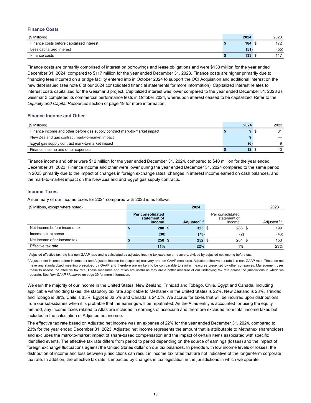 Finance Costs Finance costs before capitalized interest $ 184 $ 172 Less capitalized interest (51) (55) Finance costs $ 133 $ 117 ($ Millions) 2024 2023 Finance costs are primarily comprised of interest on borrowings and lease obligations and were $133 million for the year ended December 31, 2024, compared to $117 million for the year ended December 31, 2023. Finance costs are higher primarily due to financing fees incurred on a bridge facility entered into in October 2024 to support the OCI Acquisition and additional interest on the new debt issued (see note 8 of our 2024 consolidated financial statements for more information). Capitalized interest relates to interest costs capitalized for the Geismar 3 project. Capitalized interest was lower compared to the year ended December 31, 2023 as Geismar 3 completed its commercial performance tests in October 2024, whereupon interest ceased to be capitalized. Refer to the Liquidity and Capital Resources section of page 19 for more information. Finance Income and Other ($ Millions) 2024 2023 Finance income and other before gas supply contract mark-to-market impact $ 9 $ 31 New Zealand gas contract mark-to-market impact 9 — Egypt gas supply contract mark-to-market impact (6) 9 Finance income and other expenses $ 12 $ 40 Finance income and other were $12 million for the year ended December 31, 2024, compared to $40 million for the year ended December 31, 2023. Finance income and other were lower during the year ended December 31, 2024 compared to the same period in 2023 primarily due to the impact of changes in foreign exchange rates, changes in interest income earned on cash balances, and the mark-to-market impact on the New Zealand and Egypt gas supply contracts. Income Taxes A summary of our income taxes for 2024 compared with 2023 is as follows: Per consolidated statement of income Adjusted 1 2 Per consolidated statement of income Adjusted 1 2 Net income before income tax $ 280 $ 325 $ 286 $ 199 Income tax expense (30) (73) (2) (46) Net income after income tax $ 250 $ 252 $ 284 $ 153 Effective tax rate 11 % 22 % 1 % 23 % ($ Millions, except where noted) 2024 2023 1 Adjusted effective tax rate is a non-GAAP ratio and is calculated as adjusted income tax expense or recovery, divided by adjusted net income before tax. 2 Adjusted net income before income tax and Adjusted income tax (expense) recovery are non-GAAP measures. Adjusted effective tax rate is a non-GAAP ratio. These do not have any standardized meaning prescribed by GAAP and therefore are unlikely to be comparable to similar measures presented by other companies. Management uses these to assess the effective tax rate. These measures and ratios are useful as they are a better measure of our underlying tax rate across the jurisdictions in which we operate. See Non-GAAP Measures on page 39 for more information. We earn the majority of our income in the United States, New Zealand, Trinidad and Tobago, Chile, Egypt and Canada. Including applicable withholding taxes, the statutory tax rate applicable to Methanex in the United States is 22%, New Zealand is 28%, Trinidad and Tobago is 38%, Chile is 35%, Egypt is 32.5% and Canada is 24.5%. We accrue for taxes that will be incurred upon distributions from our subsidiaries when it is probable that the earnings will be repatriated. As the Atlas entity is accounted for using the equity method, any income taxes related to Atlas are included in earnings of associate and therefore excluded from total income taxes but included in the calculation of Adjusted net income. The effective tax rate based on Adjusted net income was an expense of 22% for the year ended December 31, 2024, compared to 23% for the year ended December 31, 2023. Adjusted net income represents the amount that is attributable to Methanex shareholders and excludes the mark-to-market impact of share-based compensation and the impact of certain items associated with specific identified events. The effective tax rate differs from period to period depending on the source of earnings (losses) and the impact of foreign exchange fluctuations against the United States dollar on our tax balances. In periods with low income levels or losses, the distribution of income and loss between jurisdictions can result in income tax rates that are not indicative of the longer-term corporate tax rate. In addition, the effective tax rate is impacted by changes in tax legislation in the jurisdictions in which we operate. 18
