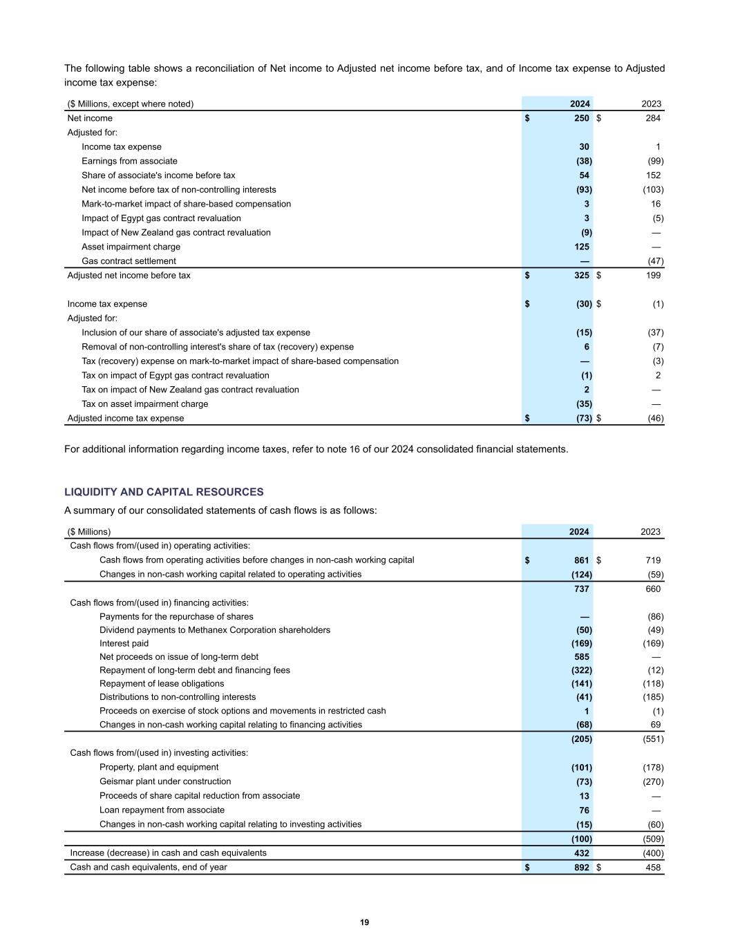The following table shows a reconciliation of Net income to Adjusted net income before tax, and of Income tax expense to Adjusted income tax expense: Net income $ 250 $ 284 Adjusted for: Income tax expense 30 1 Earnings from associate (38) (99) Share of associate's income before tax 54 152 Net income before tax of non-controlling interests (93) (103) Mark-to-market impact of share-based compensation 3 16 Impact of Egypt gas contract revaluation 3 (5) Impact of New Zealand gas contract revaluation (9) — Asset impairment charge 125 — Gas contract settlement — (47) Adjusted net income before tax $ 325 $ 199 Income tax expense $ (30) $ (1) Adjusted for: Inclusion of our share of associate's adjusted tax expense (15) (37) Removal of non-controlling interest's share of tax (recovery) expense 6 (7) Tax (recovery) expense on mark-to-market impact of share-based compensation — (3) Tax on impact of Egypt gas contract revaluation (1) 2 Tax on impact of New Zealand gas contract revaluation 2 — Tax on asset impairment charge (35) — Adjusted income tax expense $ (73) $ (46) ($ Millions, except where noted) 2024 2023 For additional information regarding income taxes, refer to note 16 of our 2024 consolidated financial statements. LIQUIDITY AND CAPITAL RESOURCES A summary of our consolidated statements of cash flows is as follows: Cash flows from/(used in) operating activities: Cash flows from operating activities before changes in non-cash working capital $ 861 $ 719 Changes in non-cash working capital related to operating activities (124) (59) 737 660 Cash flows from/(used in) financing activities: Payments for the repurchase of shares — (86) Dividend payments to Methanex Corporation shareholders (50) (49) Interest paid (169) (169) Net proceeds on issue of long-term debt 585 — Repayment of long-term debt and financing fees (322) (12) Repayment of lease obligations (141) (118) Distributions to non-controlling interests (41) (185) Proceeds on exercise of stock options and movements in restricted cash 1 (1) Changes in non-cash working capital relating to financing activities (68) 69 (205) (551) Cash flows from/(used in) investing activities: Property, plant and equipment (101) (178) Geismar plant under construction (73) (270) Proceeds of share capital reduction from associate 13 — Loan repayment from associate 76 — Changes in non-cash working capital relating to investing activities (15) (60) (100) (509) Increase (decrease) in cash and cash equivalents 432 (400) Cash and cash equivalents, end of year $ 892 $ 458 ($ Millions) 2024 2023 19