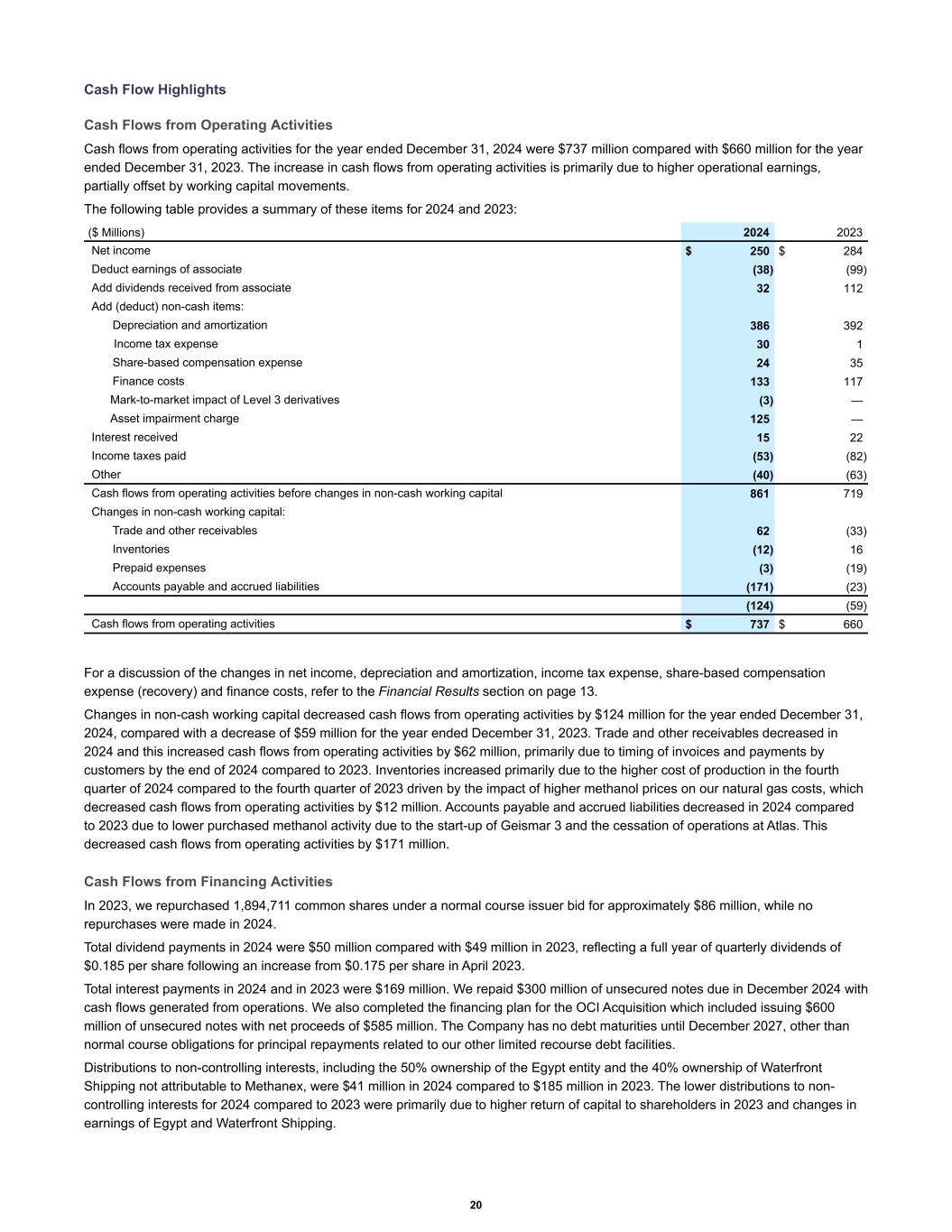 Cash Flow Highlights Cash Flows from Operating Activities Cash flows from operating activities for the year ended December 31, 2024 were $737 million compared with $660 million for the year ended December 31, 2023. The increase in cash flows from operating activities is primarily due to higher operational earnings, partially offset by working capital movements. The following table provides a summary of these items for 2024 and 2023: Net income $ 250 $ 284 Deduct earnings of associate (38) (99) Add dividends received from associate 32 112 Add (deduct) non-cash items: Depreciation and amortization 386 392 Income tax expense 30 1 Share-based compensation expense 24 35 Finance costs 133 117 Mark-to-market impact of Level 3 derivatives (3) — Asset impairment charge 125 — Interest received 15 22 Income taxes paid (53) (82) Other (40) (63) Cash flows from operating activities before changes in non-cash working capital 861 719 Changes in non-cash working capital: Trade and other receivables 62 (33) Inventories (12) 16 Prepaid expenses (3) (19) Accounts payable and accrued liabilities (171) (23) (124) (59) Cash flows from operating activities $ 737 $ 660 ($ Millions) 2024 2023 For a discussion of the changes in net income, depreciation and amortization, income tax expense, share-based compensation expense (recovery) and finance costs, refer to the Financial Results section on page 13. Changes in non-cash working capital decreased cash flows from operating activities by $124 million for the year ended December 31, 2024, compared with a decrease of $59 million for the year ended December 31, 2023. Trade and other receivables decreased in 2024 and this increased cash flows from operating activities by $62 million, primarily due to timing of invoices and payments by customers by the end of 2024 compared to 2023. Inventories increased primarily due to the higher cost of production in the fourth quarter of 2024 compared to the fourth quarter of 2023 driven by the impact of higher methanol prices on our natural gas costs, which decreased cash flows from operating activities by $12 million. Accounts payable and accrued liabilities decreased in 2024 compared to 2023 due to lower purchased methanol activity due to the start-up of Geismar 3 and the cessation of operations at Atlas. This decreased cash flows from operating activities by $171 million. Cash Flows from Financing Activities In 2023, we repurchased 1,894,711 common shares under a normal course issuer bid for approximately $86 million, while no repurchases were made in 2024. Total dividend payments in 2024 were $50 million compared with $49 million in 2023, reflecting a full year of quarterly dividends of $0.185 per share following an increase from $0.175 per share in April 2023. Total interest payments in 2024 and in 2023 were $169 million. We repaid $300 million of unsecured notes due in December 2024 with cash flows generated from operations. We also completed the financing plan for the OCI Acquisition which included issuing $600 million of unsecured notes with net proceeds of $585 million. The Company has no debt maturities until December 2027, other than normal course obligations for principal repayments related to our other limited recourse debt facilities. Distributions to non-controlling interests, including the 50% ownership of the Egypt entity and the 40% ownership of Waterfront Shipping not attributable to Methanex, were $41 million in 2024 compared to $185 million in 2023. The lower distributions to non- controlling interests for 2024 compared to 2023 were primarily due to higher return of capital to shareholders in 2023 and changes in earnings of Egypt and Waterfront Shipping. 20