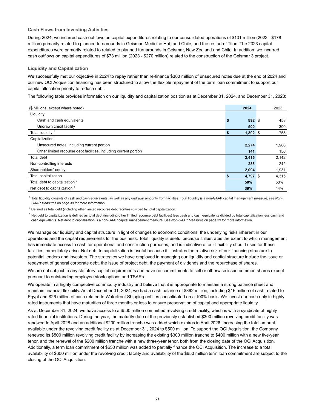 Cash Flows from Investing Activities During 2024, we incurred cash outflows on capital expenditures relating to our consolidated operations of $101 million (2023 - $178 million) primarily related to planned turnarounds in Geismar, Medicine Hat, and Chile, and the restart of Titan. The 2023 capital expenditures were primarily related to related to planned turnarounds in Geismar, New Zealand and Chile. In addition, we incurred cash outflows on capital expenditures of $73 million (2023 - $270 million) related to the construction of the Geismar 3 project. Liquidity and Capitalization We successfully met our objective in 2024 to repay rather than re-finance $300 million of unsecured notes due at the end of 2024 and our new OCI Acquisition financing has been structured to allow the flexible repayment of the term loan commitment to support our capital allocation priority to reduce debt. The following table provides information on our liquidity and capitalization position as at December 31, 2024, and December 31, 2023: Liquidity: Cash and cash equivalents $ 892 $ 458 Undrawn credit facility 500 300 Total liquidity 1 $ 1,392 $ 758 Capitalization: Unsecured notes, including current portion 2,274 1,986 Other limited recourse debt facilities, including current portion 141 156 Total debt 2,415 2,142 Non-controlling interests 288 242 Shareholders’ equity 2,094 1,931 Total capitalization $ 4,797 $ 4,315 Total debt to capitalization 2 50 % 50 % Net debt to capitalization 3 39 % 44 % ($ Millions, except where noted) 2024 2023 1 Total liquidity consists of cash and cash equivalents, as well as any undrawn amounts from facilities. Total liquidity is a non-GAAP capital management measure, see Non- GAAP Measures on page 39 for more information. 2 Defined as total debt (including other limited recourse debt facilities) divided by total capitalization. 3 Net debt to capitalization is defined as total debt (including other limited recourse debt facilities) less cash and cash equivalents divided by total capitalization less cash and cash equivalents. Net debt to capitalization is a non-GAAP capital management measure. See Non-GAAP Measures on page 39 for more information. We manage our liquidity and capital structure in light of changes to economic conditions, the underlying risks inherent in our operations and the capital requirements for the business. Total liquidity is useful because it illustrates the extent to which management has immediate access to cash for operational and construction purposes, and is indicative of our flexibility should uses for these facilities immediately arise. Net debt to capitalization is useful because it illustrates the relative risk of our financing structure to potential lenders and investors. The strategies we have employed in managing our liquidity and capital structure include the issue or repayment of general corporate debt, the issue of project debt, the payment of dividends and the repurchase of shares. We are not subject to any statutory capital requirements and have no commitments to sell or otherwise issue common shares except pursuant to outstanding employee stock options and TSARs. We operate in a highly competitive commodity industry and believe that it is appropriate to maintain a strong balance sheet and maintain financial flexibility. As at December 31, 2024, we had a cash balance of $892 million, including $16 million of cash related to Egypt and $26 million of cash related to Waterfront Shipping entities consolidated on a 100% basis. We invest our cash only in highly rated instruments that have maturities of three months or less to ensure preservation of capital and appropriate liquidity. As at December 31, 2024, we have access to a $500 million committed revolving credit facility, which is with a syndicate of highly rated financial institutions. During the year, the maturity date of the previously established $300 million revolving credit facility was renewed to April 2028 and an additional $200 million tranche was added which expires in April 2026, increasing the total amount available under the revolving credit facility as at December 31, 2024 to $500 million. To support the OCI Acquisition, the Company renewed its $500 million revolving credit facility by increasing the existing $300 million tranche to $400 million with a new five-year tenor, and the renewal of the $200 million tranche with a new three-year tenor, both from the closing date of the OCI Acquisition. Additionally, a term loan commitment of $650 million was added to partially finance the OCI Acquisition. The increase to a total availability of $600 million under the revolving credit facility and availability of the $650 million term loan commitment are subject to the closing of the OCI Acquisition. 21