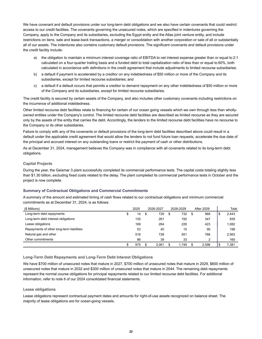 We have covenant and default provisions under our long-term debt obligations and we also have certain covenants that could restrict access to our credit facilities. The covenants governing the unsecured notes, which are specified in indentures governing the Company, apply to the Company and its subsidiaries, excluding the Egypt entity and the Atlas joint venture entity, and include restrictions on liens, sale and lease-back transactions, a merger or consolidation with another corporation or sale of all or substantially all of our assets. The indentures also contains customary default provisions. The significant covenants and default provisions under the credit facility include: a) the obligation to maintain a minimum interest coverage ratio of EBITDA to net interest expense greater than or equal to 2:1 calculated on a four-quarter trailing basis and a funded debt to total capitalization ratio of less than or equal to 60%, both calculated in accordance with definitions in the credit agreement that include adjustments to limited recourse subsidiaries; b) a default if payment is accelerated by a creditor on any indebtedness of $50 million or more of the Company and its subsidiaries, except for limited recourse subsidiaries; and c) a default if a default occurs that permits a creditor to demand repayment on any other indebtedness of $50 million or more of the Company and its subsidiaries, except for limited recourse subsidiaries. The credit facility is secured by certain assets of the Company, and also includes other customary covenants including restrictions on the incurrence of additional indebtedness. Other limited recourse debt facilities relate to financing for certain of our ocean going vessels which we own through less than wholly- owned entities under the Company's control. The limited recourse debt facilities are described as limited recourse as they are secured only by the assets of the entity that carries the debt. Accordingly, the lenders to the limited recourse debt facilities have no recourse to the Company or its other subsidiaries. Failure to comply with any of the covenants or default provisions of the long-term debt facilities described above could result in a default under the applicable credit agreement that would allow the lenders to not fund future loan requests, accelerate the due date of the principal and accrued interest on any outstanding loans or restrict the payment of cash or other distributions. As at December 31, 2024, management believes the Company was in compliance with all covenants related to its long-term debt obligations. Capital Projects During the year, the Geismar 3 plant successfully completed its commercial performance tests. The capital costs totaling slightly less than $1.30 billion, excluding fixed costs related to the delay. The plant completed its commercial performance tests in October and the project is now complete. Summary of Contractual Obligations and Commercial Commitments A summary of the amount and estimated timing of cash flows related to our contractual obligations and minimum commercial commitments as at December 31, 2024, is as follows: Long-term debt repayments $ 14 $ 729 $ 732 $ 968 $ 2,443 Long-term debt interest obligations 135 261 192 347 935 Lease obligations 169 264 226 423 1,082 Repayments of other long-term liabilities 53 40 15 90 198 Natural gas and other 518 728 551 766 2,563 Other commitments 86 39 33 2 160 $ 975 $ 2,061 $ 1,749 $ 2,596 $ 7,381 ($ Millions) 2025 2026-2027 2028-2029 After 2029 Total Long-Term Debt Repayments and Long-Term Debt Interest Obligations We have $700 million of unsecured notes that mature in 2027, $700 million of unsecured notes that mature in 2029, $600 million of unsecured notes that mature in 2032 and $300 million of unsecured notes that mature in 2044. The remaining debt repayments represent the normal course obligations for principal repayments related to our limited recourse debt facilities. For additional information, refer to note 8 of our 2024 consolidated financial statements. Lease obligations Lease obligations represent contractual payment dates and amounts for right-of-use assets recognized on balance sheet. The majority of lease obligations are for ocean-going vessels. 22