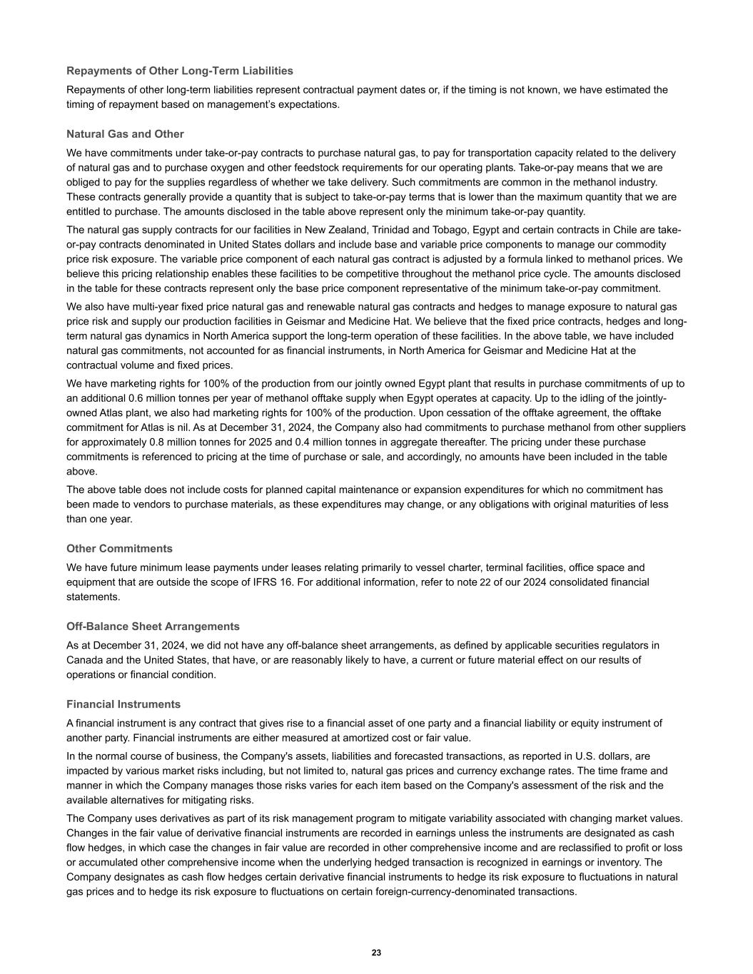 Repayments of Other Long-Term Liabilities Repayments of other long-term liabilities represent contractual payment dates or, if the timing is not known, we have estimated the timing of repayment based on management’s expectations. Natural Gas and Other We have commitments under take-or-pay contracts to purchase natural gas, to pay for transportation capacity related to the delivery of natural gas and to purchase oxygen and other feedstock requirements for our operating plants. Take-or-pay means that we are obliged to pay for the supplies regardless of whether we take delivery. Such commitments are common in the methanol industry. These contracts generally provide a quantity that is subject to take-or-pay terms that is lower than the maximum quantity that we are entitled to purchase. The amounts disclosed in the table above represent only the minimum take-or-pay quantity. The natural gas supply contracts for our facilities in New Zealand, Trinidad and Tobago, Egypt and certain contracts in Chile are take- or-pay contracts denominated in United States dollars and include base and variable price components to manage our commodity price risk exposure. The variable price component of each natural gas contract is adjusted by a formula linked to methanol prices. We believe this pricing relationship enables these facilities to be competitive throughout the methanol price cycle. The amounts disclosed in the table for these contracts represent only the base price component representative of the minimum take-or-pay commitment. We also have multi-year fixed price natural gas and renewable natural gas contracts and hedges to manage exposure to natural gas price risk and supply our production facilities in Geismar and Medicine Hat. We believe that the fixed price contracts, hedges and long- term natural gas dynamics in North America support the long-term operation of these facilities. In the above table, we have included natural gas commitments, not accounted for as financial instruments, in North America for Geismar and Medicine Hat at the contractual volume and fixed prices. We have marketing rights for 100% of the production from our jointly owned Egypt plant that results in purchase commitments of up to an additional 0.6 million tonnes per year of methanol offtake supply when Egypt operates at capacity. Up to the idling of the jointly- owned Atlas plant, we also had marketing rights for 100% of the production. Upon cessation of the offtake agreement, the offtake commitment for Atlas is nil. As at December 31, 2024, the Company also had commitments to purchase methanol from other suppliers for approximately 0.8 million tonnes for 2025 and 0.4 million tonnes in aggregate thereafter. The pricing under these purchase commitments is referenced to pricing at the time of purchase or sale, and accordingly, no amounts have been included in the table above. The above table does not include costs for planned capital maintenance or expansion expenditures for which no commitment has been made to vendors to purchase materials, as these expenditures may change, or any obligations with original maturities of less than one year. Other Commitments We have future minimum lease payments under leases relating primarily to vessel charter, terminal facilities, office space and equipment that are outside the scope of IFRS 16. For additional information, refer to note 22 of our 2024 consolidated financial statements. Off-Balance Sheet Arrangements As at December 31, 2024, we did not have any off-balance sheet arrangements, as defined by applicable securities regulators in Canada and the United States, that have, or are reasonably likely to have, a current or future material effect on our results of operations or financial condition. Financial Instruments A financial instrument is any contract that gives rise to a financial asset of one party and a financial liability or equity instrument of another party. Financial instruments are either measured at amortized cost or fair value. In the normal course of business, the Company's assets, liabilities and forecasted transactions, as reported in U.S. dollars, are impacted by various market risks including, but not limited to, natural gas prices and currency exchange rates. The time frame and manner in which the Company manages those risks varies for each item based on the Company's assessment of the risk and the available alternatives for mitigating risks. The Company uses derivatives as part of its risk management program to mitigate variability associated with changing market values. Changes in the fair value of derivative financial instruments are recorded in earnings unless the instruments are designated as cash flow hedges, in which case the changes in fair value are recorded in other comprehensive income and are reclassified to profit or loss or accumulated other comprehensive income when the underlying hedged transaction is recognized in earnings or inventory. The Company designates as cash flow hedges certain derivative financial instruments to hedge its risk exposure to fluctuations in natural gas prices and to hedge its risk exposure to fluctuations on certain foreign-currency-denominated transactions. 23