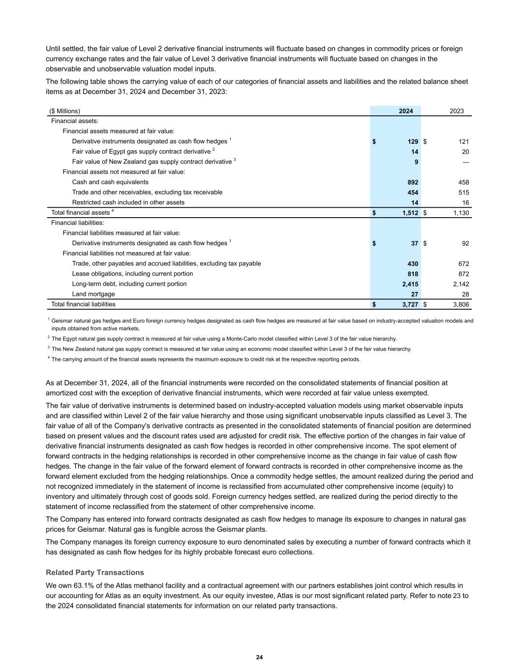 Until settled, the fair value of Level 2 derivative financial instruments will fluctuate based on changes in commodity prices or foreign currency exchange rates and the fair value of Level 3 derivative financial instruments will fluctuate based on changes in the observable and unobservable valuation model inputs. The following table shows the carrying value of each of our categories of financial assets and liabilities and the related balance sheet items as at December 31, 2024 and December 31, 2023: Financial assets: Financial assets measured at fair value: Derivative instruments designated as cash flow hedges 1 $ 129 $ 121 Fair value of Egypt gas supply contract derivative 2 14 20 Fair value of New Zealand gas supply contract derivative 3 9 — Financial assets not measured at fair value: Cash and cash equivalents 892 458 Trade and other receivables, excluding tax receivable 454 515 Restricted cash included in other assets 14 16 Total financial assets 4 $ 1,512 $ 1,130 Financial liabilities: Financial liabilities measured at fair value: Derivative instruments designated as cash flow hedges 1 $ 37 $ 92 Financial liabilities not measured at fair value: Trade, other payables and accrued liabilities, excluding tax payable 430 672 Lease obligations, including current portion 818 872 Long-term debt, including current portion 2,415 2,142 Land mortgage 27 28 Total financial liabilities $ 3,727 $ 3,806 ($ Millions) 2024 2023 1 Geismar natural gas hedges and Euro foreign currency hedges designated as cash flow hedges are measured at fair value based on industry-accepted valuation models and inputs obtained from active markets. 2 The Egypt natural gas supply contract is measured at fair value using a Monte-Carlo model classified within Level 3 of the fair value hierarchy. 3 The New Zealand natural gas supply contract is measured at fair value using an economic model classified within Level 3 of the fair value hierarchy. 4 The carrying amount of the financial assets represents the maximum exposure to credit risk at the respective reporting periods. As at December 31, 2024, all of the financial instruments were recorded on the consolidated statements of financial position at amortized cost with the exception of derivative financial instruments, which were recorded at fair value unless exempted. The fair value of derivative instruments is determined based on industry-accepted valuation models using market observable inputs and are classified within Level 2 of the fair value hierarchy and those using significant unobservable inputs classified as Level 3. The fair value of all of the Company's derivative contracts as presented in the consolidated statements of financial position are determined based on present values and the discount rates used are adjusted for credit risk. The effective portion of the changes in fair value of derivative financial instruments designated as cash flow hedges is recorded in other comprehensive income. The spot element of forward contracts in the hedging relationships is recorded in other comprehensive income as the change in fair value of cash flow hedges. The change in the fair value of the forward element of forward contracts is recorded in other comprehensive income as the forward element excluded from the hedging relationships. Once a commodity hedge settles, the amount realized during the period and not recognized immediately in the statement of income is reclassified from accumulated other comprehensive income (equity) to inventory and ultimately through cost of goods sold. Foreign currency hedges settled, are realized during the period directly to the statement of income reclassified from the statement of other comprehensive income. The Company has entered into forward contracts designated as cash flow hedges to manage its exposure to changes in natural gas prices for Geismar. Natural gas is fungible across the Geismar plants. The Company manages its foreign currency exposure to euro denominated sales by executing a number of forward contracts which it has designated as cash flow hedges for its highly probable forecast euro collections. Related Party Transactions We own 63.1% of the Atlas methanol facility and a contractual agreement with our partners establishes joint control which results in our accounting for Atlas as an equity investment. As our equity investee, Atlas is our most significant related party. Refer to note 23 to the 2024 consolidated financial statements for information on our related party transactions. 24