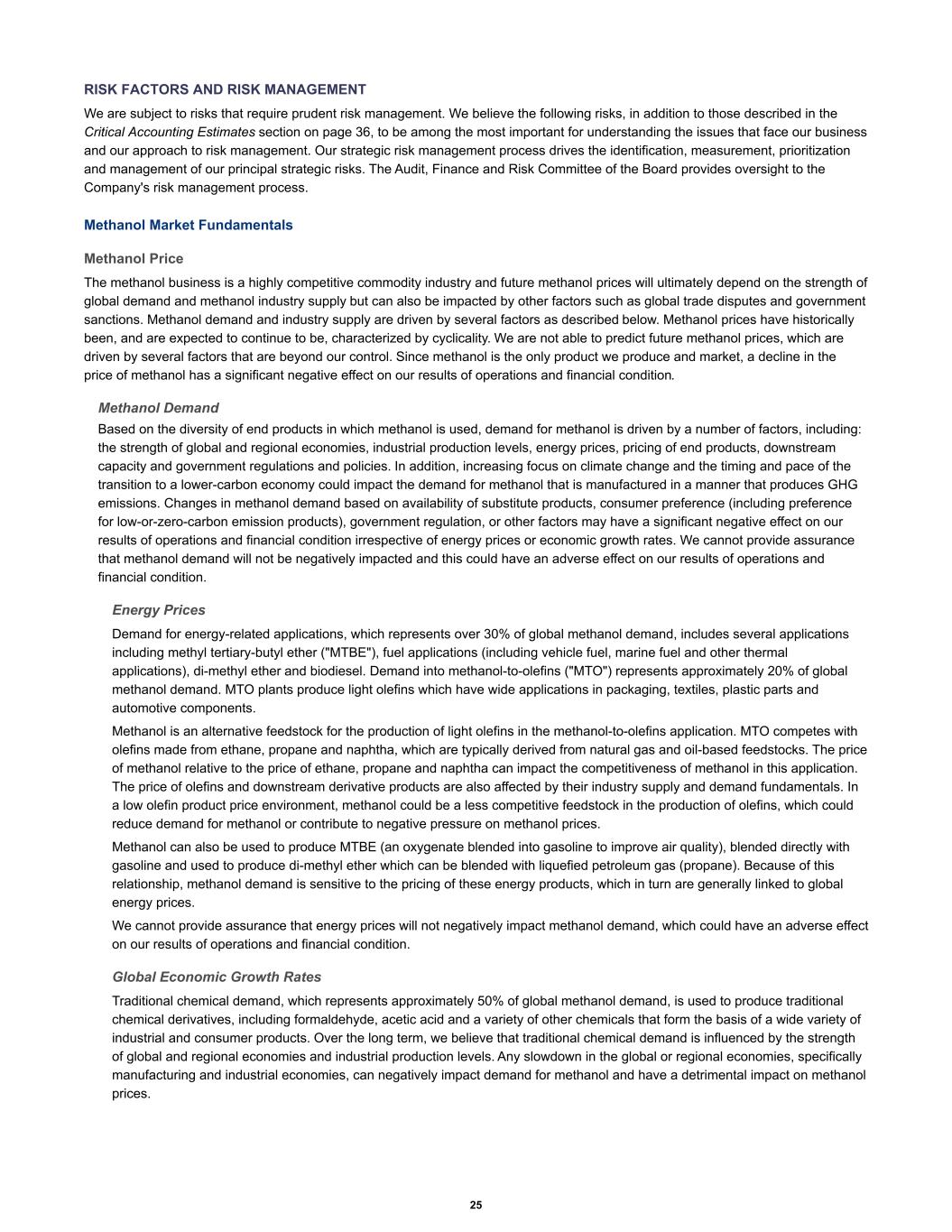 RISK FACTORS AND RISK MANAGEMENT We are subject to risks that require prudent risk management. We believe the following risks, in addition to those described in the Critical Accounting Estimates section on page 36, to be among the most important for understanding the issues that face our business and our approach to risk management. Our strategic risk management process drives the identification, measurement, prioritization and management of our principal strategic risks. The Audit, Finance and Risk Committee of the Board provides oversight to the Company's risk management process. Methanol Market Fundamentals Methanol Price The methanol business is a highly competitive commodity industry and future methanol prices will ultimately depend on the strength of global demand and methanol industry supply but can also be impacted by other factors such as global trade disputes and government sanctions. Methanol demand and industry supply are driven by several factors as described below. Methanol prices have historically been, and are expected to continue to be, characterized by cyclicality. We are not able to predict future methanol prices, which are driven by several factors that are beyond our control. Since methanol is the only product we produce and market, a decline in the price of methanol has a significant negative effect on our results of operations and financial condition. Methanol Demand Based on the diversity of end products in which methanol is used, demand for methanol is driven by a number of factors, including: the strength of global and regional economies, industrial production levels, energy prices, pricing of end products, downstream capacity and government regulations and policies. In addition, increasing focus on climate change and the timing and pace of the transition to a lower-carbon economy could impact the demand for methanol that is manufactured in a manner that produces GHG emissions. Changes in methanol demand based on availability of substitute products, consumer preference (including preference for low-or-zero-carbon emission products), government regulation, or other factors may have a significant negative effect on our results of operations and financial condition irrespective of energy prices or economic growth rates. We cannot provide assurance that methanol demand will not be negatively impacted and this could have an adverse effect on our results of operations and financial condition. Energy Prices Demand for energy-related applications, which represents over 30% of global methanol demand, includes several applications including methyl tertiary-butyl ether ("MTBE"), fuel applications (including vehicle fuel, marine fuel and other thermal applications), di-methyl ether and biodiesel. Demand into methanol-to-olefins ("MTO") represents approximately 20% of global methanol demand. MTO plants produce light olefins which have wide applications in packaging, textiles, plastic parts and automotive components. Methanol is an alternative feedstock for the production of light olefins in the methanol-to-olefins application. MTO competes with olefins made from ethane, propane and naphtha, which are typically derived from natural gas and oil-based feedstocks. The price of methanol relative to the price of ethane, propane and naphtha can impact the competitiveness of methanol in this application. The price of olefins and downstream derivative products are also affected by their industry supply and demand fundamentals. In a low olefin product price environment, methanol could be a less competitive feedstock in the production of olefins, which could reduce demand for methanol or contribute to negative pressure on methanol prices. Methanol can also be used to produce MTBE (an oxygenate blended into gasoline to improve air quality), blended directly with gasoline and used to produce di-methyl ether which can be blended with liquefied petroleum gas (propane). Because of this relationship, methanol demand is sensitive to the pricing of these energy products, which in turn are generally linked to global energy prices. We cannot provide assurance that energy prices will not negatively impact methanol demand, which could have an adverse effect on our results of operations and financial condition. Global Economic Growth Rates Traditional chemical demand, which represents approximately 50% of global methanol demand, is used to produce traditional chemical derivatives, including formaldehyde, acetic acid and a variety of other chemicals that form the basis of a wide variety of industrial and consumer products. Over the long term, we believe that traditional chemical demand is influenced by the strength of global and regional economies and industrial production levels. Any slowdown in the global or regional economies, specifically manufacturing and industrial economies, can negatively impact demand for methanol and have a detrimental impact on methanol prices. 25