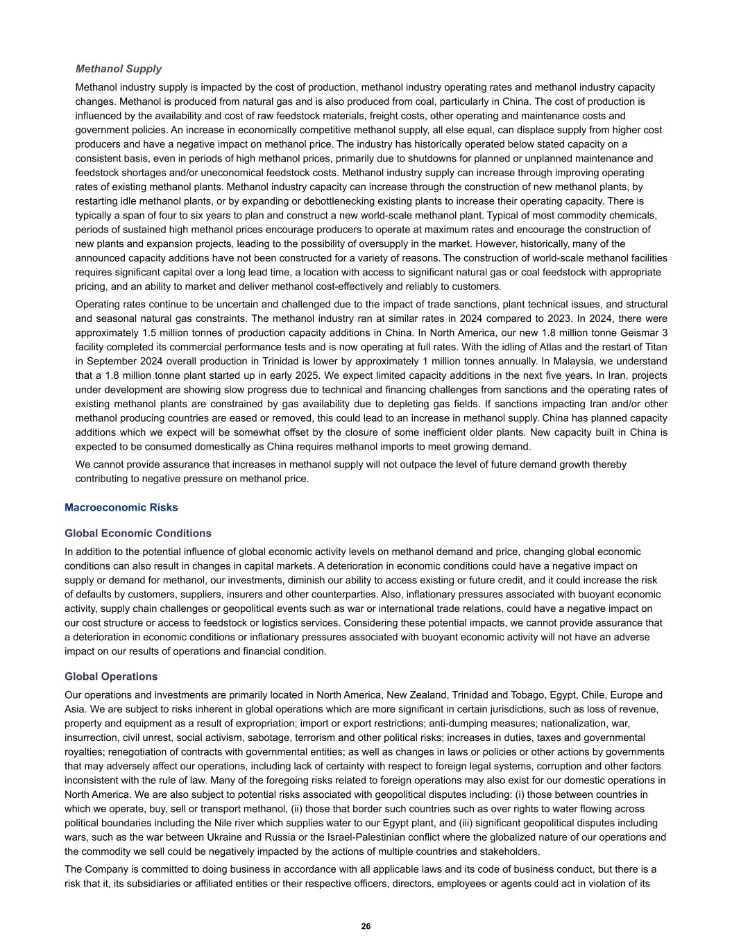 Methanol Supply Methanol industry supply is impacted by the cost of production, methanol industry operating rates and methanol industry capacity changes. Methanol is produced from natural gas and is also produced from coal, particularly in China. The cost of production is influenced by the availability and cost of raw feedstock materials, freight costs, other operating and maintenance costs and government policies. An increase in economically competitive methanol supply, all else equal, can displace supply from higher cost producers and have a negative impact on methanol price. The industry has historically operated below stated capacity on a consistent basis, even in periods of high methanol prices, primarily due to shutdowns for planned or unplanned maintenance and feedstock shortages and/or uneconomical feedstock costs. Methanol industry supply can increase through improving operating rates of existing methanol plants. Methanol industry capacity can increase through the construction of new methanol plants, by restarting idle methanol plants, or by expanding or debottlenecking existing plants to increase their operating capacity. There is typically a span of four to six years to plan and construct a new world-scale methanol plant. Typical of most commodity chemicals, periods of sustained high methanol prices encourage producers to operate at maximum rates and encourage the construction of new plants and expansion projects, leading to the possibility of oversupply in the market. However, historically, many of the announced capacity additions have not been constructed for a variety of reasons. The construction of world-scale methanol facilities requires significant capital over a long lead time, a location with access to significant natural gas or coal feedstock with appropriate pricing, and an ability to market and deliver methanol cost-effectively and reliably to customers. Operating rates continue to be uncertain and challenged due to the impact of trade sanctions, plant technical issues, and structural and seasonal natural gas constraints. The methanol industry ran at similar rates in 2024 compared to 2023. In 2024, there were approximately 1.5 million tonnes of production capacity additions in China. In North America, our new 1.8 million tonne Geismar 3 facility completed its commercial performance tests and is now operating at full rates. With the idling of Atlas and the restart of Titan in September 2024 overall production in Trinidad is lower by approximately 1 million tonnes annually. In Malaysia, we understand that a 1.8 million tonne plant started up in early 2025. We expect limited capacity additions in the next five years. In Iran, projects under development are showing slow progress due to technical and financing challenges from sanctions and the operating rates of existing methanol plants are constrained by gas availability due to depleting gas fields. If sanctions impacting Iran and/or other methanol producing countries are eased or removed, this could lead to an increase in methanol supply. China has planned capacity additions which we expect will be somewhat offset by the closure of some inefficient older plants. New capacity built in China is expected to be consumed domestically as China requires methanol imports to meet growing demand. We cannot provide assurance that increases in methanol supply will not outpace the level of future demand growth thereby contributing to negative pressure on methanol price. Macroeconomic Risks Global Economic Conditions In addition to the potential influence of global economic activity levels on methanol demand and price, changing global economic conditions can also result in changes in capital markets. A deterioration in economic conditions could have a negative impact on supply or demand for methanol, our investments, diminish our ability to access existing or future credit, and it could increase the risk of defaults by customers, suppliers, insurers and other counterparties. Also, inflationary pressures associated with buoyant economic activity, supply chain challenges or geopolitical events such as war or international trade relations, could have a negative impact on our cost structure or access to feedstock or logistics services. Considering these potential impacts, we cannot provide assurance that a deterioration in economic conditions or inflationary pressures associated with buoyant economic activity will not have an adverse impact on our results of operations and financial condition. Global Operations Our operations and investments are primarily located in North America, New Zealand, Trinidad and Tobago, Egypt, Chile, Europe and Asia. We are subject to risks inherent in global operations which are more significant in certain jurisdictions, such as loss of revenue, property and equipment as a result of expropriation; import or export restrictions; anti-dumping measures; nationalization, war, insurrection, civil unrest, social activism, sabotage, terrorism and other political risks; increases in duties, taxes and governmental royalties; renegotiation of contracts with governmental entities; as well as changes in laws or policies or other actions by governments that may adversely affect our operations, including lack of certainty with respect to foreign legal systems, corruption and other factors inconsistent with the rule of law. Many of the foregoing risks related to foreign operations may also exist for our domestic operations in North America. We are also subject to potential risks associated with geopolitical disputes including: (i) those between countries in which we operate, buy, sell or transport methanol, (ii) those that border such countries such as over rights to water flowing across political boundaries including the Nile river which supplies water to our Egypt plant, and (iii) significant geopolitical disputes including wars, such as the war between Ukraine and Russia or the Israel-Palestinian conflict where the glob