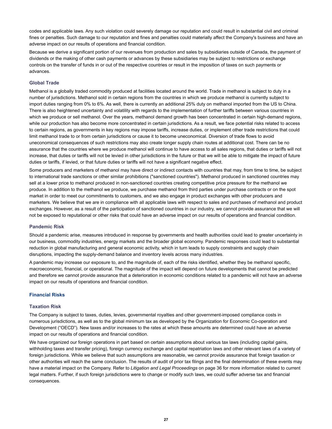 codes and applicable laws. Any such violation could severely damage our reputation and could result in substantial civil and criminal fines or penalties. Such damage to our reputation and fines and penalties could materially affect the Company's business and have an adverse impact on our results of operations and financial condition. Because we derive a significant portion of our revenues from production and sales by subsidiaries outside of Canada, the payment of dividends or the making of other cash payments or advances by these subsidiaries may be subject to restrictions or exchange controls on the transfer of funds in or out of the respective countries or result in the imposition of taxes on such payments or advances. Global Trade Methanol is a globally traded commodity produced at facilities located around the world. Trade in methanol is subject to duty in a number of jurisdictions. Methanol sold in certain regions from the countries in which we produce methanol is currently subject to import duties ranging from 0% to 6%. As well, there is currently an additional 25% duty on methanol imported from the US to China. There is also heightened uncertainty and volatility with regards to the implementation of further tariffs between various countries in which we produce or sell methanol. Over the years, methanol demand growth has been concentrated in certain high-demand regions, while our production has also become more concentrated in certain jurisdictions. As a result, we face potential risks related to access to certain regions, as governments in key regions may impose tariffs, increase duties, or implement other trade restrictions that could limit methanol trade to or from certain jurisdictions or cause it to become uneconomical. Diversion of trade flows to avoid uneconomical consequences of such restrictions may also create longer supply chain routes at additional cost. There can be no assurance that the countries where we produce methanol will continue to have access to all sales regions, that duties or tariffs will not increase, that duties or tariffs will not be levied in other jurisdictions in the future or that we will be able to mitigate the impact of future duties or tariffs, if levied, or that future duties or tariffs will not have a significant negative effect. Some producers and marketers of methanol may have direct or indirect contacts with countries that may, from time to time, be subject to international trade sanctions or other similar prohibitions ("sanctioned countries"). Methanol produced in sanctioned countries may sell at a lower price to methanol produced in non-sanctioned countries creating competitive price pressure for the methanol we produce. In addition to the methanol we produce, we purchase methanol from third parties under purchase contracts or on the spot market in order to meet our commitments to customers, and we also engage in product exchanges with other producers and marketers. We believe that we are in compliance with all applicable laws with respect to sales and purchases of methanol and product exchanges. However, as a result of the participation of sanctioned countries in our industry, we cannot provide assurance that we will not be exposed to reputational or other risks that could have an adverse impact on our results of operations and financial condition. Pandemic Risk Should a pandemic arise, measures introduced in response by governments and health authorities could lead to greater uncertainty in our business, commodity industries, energy markets and the broader global economy. Pandemic responses could lead to substantial reduction in global manufacturing and general economic activity, which in turn leads to supply constraints and supply chain disruptions, impacting the supply-demand balance and inventory levels across many industries. A pandemic may increase our exposure to, and the magnitude of, each of the risks identified, whether they be methanol specific, macroeconomic, financial, or operational. The magnitude of the impact will depend on future developments that cannot be predicted and therefore we cannot provide assurance that a deterioration in economic conditions related to a pandemic will not have an adverse impact on our results of operations and financial condition. Financial Risks Taxation Risk The Company is subject to taxes, duties, levies, governmental royalties and other government-imposed compliance costs in numerous jurisdictions, as well as to the global minimum tax as developed by the Organization for Economic Co-operation and Development (“OECD”). New taxes and/or increases to the rates at which these amounts are determined could have an adverse impact on our results of operations and financial condition. We have organized our foreign operations in part based on certain assumptions about various tax laws (including capital gains, withholding taxes and transfer pricing), foreign currency exchange and capital repatriation laws and other relevant laws of a variety of foreign jurisdictions. While we believe that such assumptions are reasonable, we cannot provide assurance that foreign taxation or other authorities will reach the same conclusion. The results of audit of prior tax filings and the final determination of these events may have a material impact on the Company. Refer to Litigation and Legal Proceedings on page 36 for more information related to current legal matters. Further, if such foreign jurisdictions were to change or modify such laws, we could suffer adverse tax and financial consequences. 27