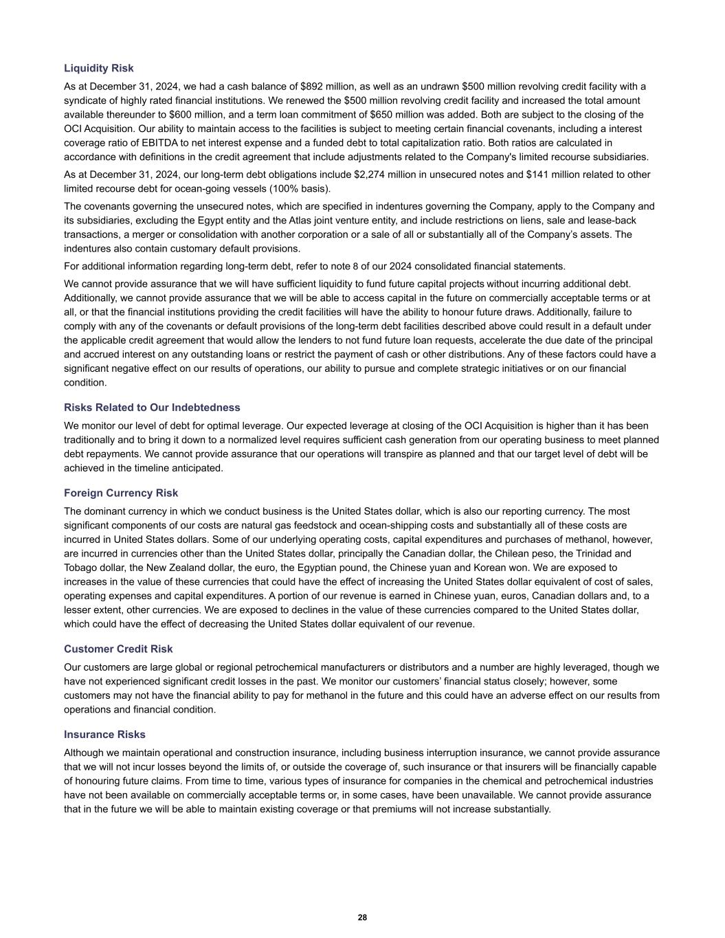 Liquidity Risk As at December 31, 2024, we had a cash balance of $892 million, as well as an undrawn $500 million revolving credit facility with a syndicate of highly rated financial institutions. We renewed the $500 million revolving credit facility and increased the total amount available thereunder to $600 million, and a term loan commitment of $650 million was added. Both are subject to the closing of the OCI Acquisition. Our ability to maintain access to the facilities is subject to meeting certain financial covenants, including a interest coverage ratio of EBITDA to net interest expense and a funded debt to total capitalization ratio. Both ratios are calculated in accordance with definitions in the credit agreement that include adjustments related to the Company's limited recourse subsidiaries. As at December 31, 2024, our long-term debt obligations include $2,274 million in unsecured notes and $141 million related to other limited recourse debt for ocean-going vessels (100% basis). The covenants governing the unsecured notes, which are specified in indentures governing the Company, apply to the Company and its subsidiaries, excluding the Egypt entity and the Atlas joint venture entity, and include restrictions on liens, sale and lease-back transactions, a merger or consolidation with another corporation or a sale of all or substantially all of the Company’s assets. The indentures also contain customary default provisions. For additional information regarding long-term debt, refer to note 8 of our 2024 consolidated financial statements. We cannot provide assurance that we will have sufficient liquidity to fund future capital projects without incurring additional debt. Additionally, we cannot provide assurance that we will be able to access capital in the future on commercially acceptable terms or at all, or that the financial institutions providing the credit facilities will have the ability to honour future draws. Additionally, failure to comply with any of the covenants or default provisions of the long-term debt facilities described above could result in a default under the applicable credit agreement that would allow the lenders to not fund future loan requests, accelerate the due date of the principal and accrued interest on any outstanding loans or restrict the payment of cash or other distributions. Any of these factors could have a significant negative effect on our results of operations, our ability to pursue and complete strategic initiatives or on our financial condition. Risks Related to Our Indebtedness We monitor our level of debt for optimal leverage. Our expected leverage at closing of the OCI Acquisition is higher than it has been traditionally and to bring it down to a normalized level requires sufficient cash generation from our operating business to meet planned debt repayments. We cannot provide assurance that our operations will transpire as planned and that our target level of debt will be achieved in the timeline anticipated. Foreign Currency Risk The dominant currency in which we conduct business is the United States dollar, which is also our reporting currency. The most significant components of our costs are natural gas feedstock and ocean-shipping costs and substantially all of these costs are incurred in United States dollars. Some of our underlying operating costs, capital expenditures and purchases of methanol, however, are incurred in currencies other than the United States dollar, principally the Canadian dollar, the Chilean peso, the Trinidad and Tobago dollar, the New Zealand dollar, the euro, the Egyptian pound, the Chinese yuan and Korean won. We are exposed to increases in the value of these currencies that could have the effect of increasing the United States dollar equivalent of cost of sales, operating expenses and capital expenditures. A portion of our revenue is earned in Chinese yuan, euros, Canadian dollars and, to a lesser extent, other currencies. We are exposed to declines in the value of these currencies compared to the United States dollar, which could have the effect of decreasing the United States dollar equivalent of our revenue. Customer Credit Risk Our customers are large global or regional petrochemical manufacturers or distributors and a number are highly leveraged, though we have not experienced significant credit losses in the past. We monitor our customers’ financial status closely; however, some customers may not have the financial ability to pay for methanol in the future and this could have an adverse effect on our results from operations and financial condition. Insurance Risks Although we maintain operational and construction insurance, including business interruption insurance, we cannot provide assurance that we will not incur losses beyond the limits of, or outside the coverage of, such insurance or that insurers will be financially capable of honouring future claims. From time to time, various types of insurance for companies in the chemical and petrochemical industries have not been available on commercially acceptable terms or, in some cases, have been unavailable. We cannot provide assurance that in the future we will be able to maintain existing coverage or that premiums will not increase substantially. 28