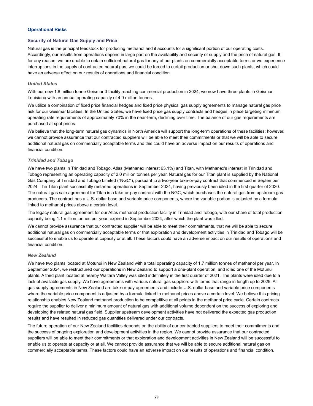 Operational Risks Security of Natural Gas Supply and Price Natural gas is the principal feedstock for producing methanol and it accounts for a significant portion of our operating costs. Accordingly, our results from operations depend in large part on the availability and security of supply and the price of natural gas. If, for any reason, we are unable to obtain sufficient natural gas for any of our plants on commercially acceptable terms or we experience interruptions in the supply of contracted natural gas, we could be forced to curtail production or shut down such plants, which could have an adverse effect on our results of operations and financial condition. United States With our new 1.8 million tonne Geismar 3 facility reaching commercial production in 2024, we now have three plants in Geismar, Louisiana with an annual operating capacity of 4.0 million tonnes. We utilize a combination of fixed price financial hedges and fixed price physical gas supply agreements to manage natural gas price risk for our Geismar facilities. In the United States, we have fixed price gas supply contracts and hedges in place targeting minimum operating rate requirements of approximately 70% in the near-term, declining over time. The balance of our gas requirements are purchased at spot prices. We believe that the long-term natural gas dynamics in North America will support the long-term operations of these facilities; however, we cannot provide assurance that our contracted suppliers will be able to meet their commitments or that we will be able to secure additional natural gas on commercially acceptable terms and this could have an adverse impact on our results of operations and financial condition. Trinidad and Tobago We have two plants in Trinidad and Tobago, Atlas (Methanex interest 63.1%) and Titan, with Methanex's interest in Trinidad and Tobago representing an operating capacity of 2.0 million tonnes per year. Natural gas for our Titan plant is supplied by the National Gas Company of Trinidad and Tobago Limited ("NGC"), pursuant to a two-year take-or-pay contract that commenced in September 2024. The Titan plant successfully restarted operations in September 2024, having previously been idled in the first quarter of 2020. The natural gas sale agreement for Titan is a take-or-pay contract with the NGC, which purchases the natural gas from upstream gas producers. The contract has a U.S. dollar base and variable price components, where the variable portion is adjusted by a formula linked to methanol prices above a certain level. The legacy natural gas agreement for our Atlas methanol production facility in Trinidad and Tobago, with our share of total production capacity being 1.1 million tonnes per year, expired in September 2024, after which the plant was idled. We cannot provide assurance that our contracted supplier will be able to meet their commitments, that we will be able to secure additional natural gas on commercially acceptable terms or that exploration and development activities in Trinidad and Tobago will be successful to enable us to operate at capacity or at all. These factors could have an adverse impact on our results of operations and financial condition. New Zealand We have two plants located at Motunui in New Zealand with a total operating capacity of 1.7 million tonnes of methanol per year. In September 2024, we restructured our operations in New Zealand to support a one-plant operation, and idled one of the Motunui plants. A third plant located at nearby Waitara Valley was idled indefinitely in the first quarter of 2021. The plants were idled due to a lack of available gas supply. We have agreements with various natural gas suppliers with terms that range in length up to 2029. All gas supply agreements in New Zealand are take-or-pay agreements and include U.S. dollar base and variable price components where the variable price component is adjusted by a formula linked to methanol prices above a certain level. We believe this pricing relationship enables New Zealand methanol production to be competitive at all points in the methanol price cycle. Certain contracts require the supplier to deliver a minimum amount of natural gas with additional volume dependent on the success of exploring and developing the related natural gas field. Supplier upstream development activities have not delivered the expected gas production results and have resulted in reduced gas quantities delivered under our contracts. The future operation of our New Zealand facilities depends on the ability of our contracted suppliers to meet their commitments and the success of ongoing exploration and development activities in the region. We cannot provide assurance that our contracted suppliers will be able to meet their commitments or that exploration and development activities in New Zealand will be successful to enable us to operate at capacity or at all. We cannot provide assurance that we will be able to secure additional natural gas on commercially acceptable terms. These factors could have an adverse impact on our results of operations and financial condition. 29