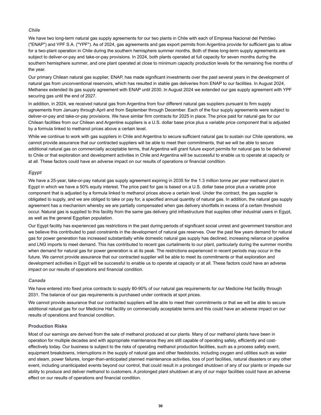 Chile We have two long-term natural gas supply agreements for our two plants in Chile with each of Empresa Nacional del Petróleo ("ENAP") and YPF S.A. ("YPF"). As of 2024, gas agreements and gas export permits from Argentina provide for sufficient gas to allow for a two-plant operation in Chile during the southern hemisphere summer months. Both of these long-term supply agreements are subject to deliver-or-pay and take-or-pay provisions. In 2024, both plants operated at full capacity for seven months during the southern hemisphere summer, and one plant operated at close to minimum capacity production levels for the remaining five months of the year. Our primary Chilean natural gas supplier, ENAP, has made significant investments over the past several years in the development of natural gas from unconventional reservoirs, which has resulted in stable gas deliveries from ENAP to our facilities. In August 2024, Methanex extended its gas supply agreement with ENAP until 2030. In August 2024 we extended our gas supply agreement with YPF securing gas until the end of 2027. In addition, in 2024, we received natural gas from Argentina from four different natural gas suppliers pursuant to firm supply agreements from January through April and from September through December. Each of the four supply agreements were subject to deliver-or-pay and take-or-pay provisions. We have similar firm contracts for 2025 in place. The price paid for natural gas for our Chilean facilities from our Chilean and Argentine suppliers is a U.S. dollar base price plus a variable price component that is adjusted by a formula linked to methanol prices above a certain level. While we continue to work with gas suppliers in Chile and Argentina to secure sufficient natural gas to sustain our Chile operations, we cannot provide assurance that our contracted suppliers will be able to meet their commitments, that we will be able to secure additional natural gas on commercially acceptable terms, that Argentina will grant future export permits for natural gas to be delivered to Chile or that exploration and development activities in Chile and Argentina will be successful to enable us to operate at capacity or at all. These factors could have an adverse impact on our results of operations or financial condition. Egypt We have a 25-year, take-or-pay natural gas supply agreement expiring in 2035 for the 1.3 million tonne per year methanol plant in Egypt in which we have a 50% equity interest. The price paid for gas is based on a U.S. dollar base price plus a variable price component that is adjusted by a formula linked to methanol prices above a certain level. Under the contract, the gas supplier is obligated to supply, and we are obliged to take or pay for, a specified annual quantity of natural gas. In addition, the natural gas supply agreement has a mechanism whereby we are partially compensated when gas delivery shortfalls in excess of a certain threshold occur. Natural gas is supplied to this facility from the same gas delivery grid infrastructure that supplies other industrial users in Egypt, as well as the general Egyptian population. Our Egypt facility has experienced gas restrictions in the past during periods of significant social unrest and government transition and we believe this contributed to past constraints in the development of natural gas reserves. Over the past few years demand for natural gas for power generation has increased substantially while domestic natural gas supply has declined, increasing reliance on pipeline and LNG imports to meet demand. This has contributed to recent gas curtailments to our plant, particularly during the summer months when demand for natural gas for power generation is at its peak. The restrictions experienced in recent periods may occur in the future. We cannot provide assurance that our contracted supplier will be able to meet its commitments or that exploration and development activities in Egypt will be successful to enable us to operate at capacity or at all. These factors could have an adverse impact on our results of operations and financial condition. Canada We have entered into fixed price contracts to supply 80-90% of our natural gas requirements for our Medicine Hat facility through 2031. The balance of our gas requirements is purchased under contracts at spot prices. We cannot provide assurance that our contracted suppliers will be able to meet their commitments or that we will be able to secure additional natural gas for our Medicine Hat facility on commercially acceptable terms and this could have an adverse impact on our results of operations and financial condition. Production Risks Most of our earnings are derived from the sale of methanol produced at our plants. Many of our methanol plants have been in operation for multiple decades and with appropriate maintenance they are still capable of operating safely, efficiently and cost- effectively today. Our business is subject to the risks of operating methanol production facilities, such as a process safety event, equipment breakdowns, interruptions in the supply of natural gas and other feedstocks, including oxygen and utilities such as water and steam, power failures, longer-than-anticipated planned maintenance activities, loss of port facilities, natural disasters or any other event, including unanticipated events beyond our control, that could result in a prolonged shutdown of any of our plants or impede our ability to produce and deliver methanol to customers. A prolonged plant shutdown at any of our major facilities could have an adverse effect on our results of operations and financial condition. 30