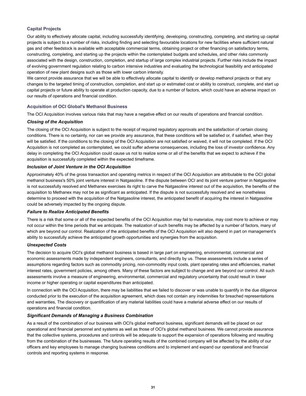 Capital Projects Our ability to effectively allocate capital, including successfully identifying, developing, constructing, completing, and starting up capital projects is subject to a number of risks, including finding and selecting favourable locations for new facilities where sufficient natural gas and other feedstock is available with acceptable commercial terms, obtaining project or other financing on satisfactory terms, constructing, completing, and starting up the projects within the contemplated budgets and schedules, and other risks commonly associated with the design, construction, completion, and startup of large complex industrial projects. Further risks include the impact of evolving government regulation relating to carbon intensive industries and evaluating the technological feasibility and anticipated operation of new plant designs such as those with lower carbon intensity. We cannot provide assurance that we will be able to effectively allocate capital to identify or develop methanol projects or that any changes to the targeted timing of construction, completion, and start up or estimated cost or ability to construct, complete, and start up capital projects or future ability to operate at production capacity, due to a number of factors, which could have an adverse impact on our results of operations and financial condition. Acquisition of OCI Global's Methanol Business The OCI Acquisition involves various risks that may have a negative effect on our results of operations and financial condition. Closing of the Acquisition The closing of the OCI Acquisition is subject to the receipt of required regulatory approvals and the satisfaction of certain closing conditions. There is no certainty, nor can we provide any assurance, that these conditions will be satisfied or, if satisfied, when they will be satisfied. If the conditions to the closing of the OCI Acquisition are not satisfied or waived, it will not be completed. If the OCI Acquisition is not completed as contemplated, we could suffer adverse consequences, including the loss of investor confidence. Any delay in completing the OCI Acquisition could cause us not to realize some or all of the benefits that we expect to achieve if the acquisition is successfully completed within the expected timeframe. Inclusion of Joint Venture in the OCI Acquisition Approximately 40% of the gross transaction and operating metrics in respect of the OCI Acquisition are attributable to the OCI global methanol business's 50% joint venture interest in Natgasoline. If the dispute between OCI and its joint venture partner in Natgasoline is not successfully resolved and Methanex exercises its right to carve the Natgasoline interest out of the acquisition, the benefits of the acquisition to Methanex may not be as significant as anticipated. If the dispute is not successfully resolved and we nonetheless determine to proceed with the acquisition of the Natgasoline interest, the anticipated benefit of acquiring the interest in Natgasoline could be adversely impacted by the ongoing dispute. Failure to Realize Anticipated Benefits There is a risk that some or all of the expected benefits of the OCI Acquisition may fail to materialize, may cost more to achieve or may not occur within the time periods that we anticipate. The realization of such benefits may be affected by a number of factors, many of which are beyond our control. Realization of the anticipated benefits of the OCI Acquisition will also depend in part on management’s ability to successfully achieve the anticipated growth opportunities and synergies from the acquisition. Unexpected Costs The decision to acquire OCI's global methanol business is based in large part on engineering, environmental, commercial and economic assessments made by independent engineers, consultants, and directly by us. These assessments include a series of assumptions regarding factors such as commodity pricing, non-commodity input costs, plant operating rates and efficiencies, market interest rates, government policies, among others. Many of these factors are subject to change and are beyond our control. All such assessments involve a measure of engineering, environmental, commercial and regulatory uncertainty that could result in lower income or higher operating or capital expenditures than anticipated. In connection with the OCI Acquisition, there may be liabilities that we failed to discover or was unable to quantify in the due diligence conducted prior to the execution of the acquisition agreement, which does not contain any indemnities for breached representations and warranties, The discovery or quantification of any material liabilities could have a material adverse effect on our results of operations and financial condition. Significant Demands of Managing a Business Combination As a result of the combination of our business with OCI's global methanol business, significant demands will be placed on our operational and financial personnel and systems as well as those of OCI's global methanol business. We cannot provide assurance that the collective systems, procedures and controls will be adequate to support the expansion of operations following and resulting from the combination of the businesses. The future operating results of the combined company will be affected by the ability of our officers and key employees to manage changing business conditions and to implement and expand our operational and financial controls and reporting systems in response. 31