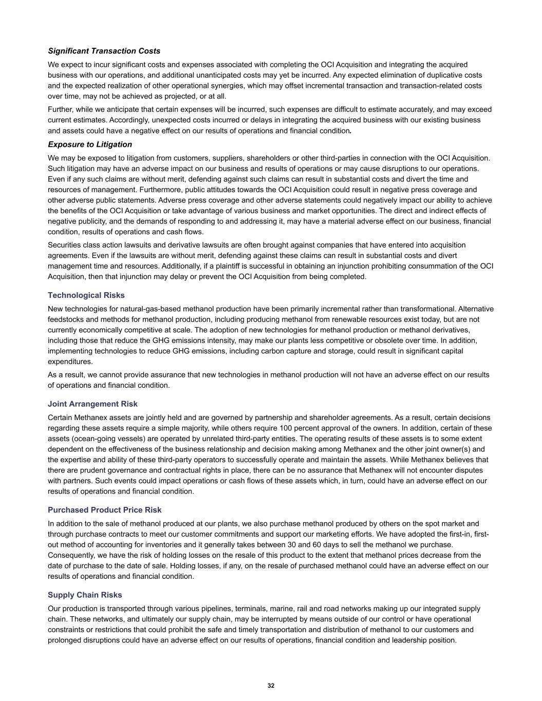 Significant Transaction Costs We expect to incur significant costs and expenses associated with completing the OCI Acquisition and integrating the acquired business with our operations, and additional unanticipated costs may yet be incurred. Any expected elimination of duplicative costs and the expected realization of other operational synergies, which may offset incremental transaction and transaction-related costs over time, may not be achieved as projected, or at all. Further, while we anticipate that certain expenses will be incurred, such expenses are difficult to estimate accurately, and may exceed current estimates. Accordingly, unexpected costs incurred or delays in integrating the acquired business with our existing business and assets could have a negative effect on our results of operations and financial condition. Exposure to Litigation We may be exposed to litigation from customers, suppliers, shareholders or other third-parties in connection with the OCI Acquisition. Such litigation may have an adverse impact on our business and results of operations or may cause disruptions to our operations. Even if any such claims are without merit, defending against such claims can result in substantial costs and divert the time and resources of management. Furthermore, public attitudes towards the OCI Acquisition could result in negative press coverage and other adverse public statements. Adverse press coverage and other adverse statements could negatively impact our ability to achieve the benefits of the OCI Acquisition or take advantage of various business and market opportunities. The direct and indirect effects of negative publicity, and the demands of responding to and addressing it, may have a material adverse effect on our business, financial condition, results of operations and cash flows. Securities class action lawsuits and derivative lawsuits are often brought against companies that have entered into acquisition agreements. Even if the lawsuits are without merit, defending against these claims can result in substantial costs and divert management time and resources. Additionally, if a plaintiff is successful in obtaining an injunction prohibiting consummation of the OCI Acquisition, then that injunction may delay or prevent the OCI Acquisition from being completed. Technological Risks New technologies for natural-gas-based methanol production have been primarily incremental rather than transformational. Alternative feedstocks and methods for methanol production, including producing methanol from renewable resources exist today, but are not currently economically competitive at scale. The adoption of new technologies for methanol production or methanol derivatives, including those that reduce the GHG emissions intensity, may make our plants less competitive or obsolete over time. In addition, implementing technologies to reduce GHG emissions, including carbon capture and storage, could result in significant capital expenditures. As a result, we cannot provide assurance that new technologies in methanol production will not have an adverse effect on our results of operations and financial condition. Joint Arrangement Risk Certain Methanex assets are jointly held and are governed by partnership and shareholder agreements. As a result, certain decisions regarding these assets require a simple majority, while others require 100 percent approval of the owners. In addition, certain of these assets (ocean-going vessels) are operated by unrelated third-party entities. The operating results of these assets is to some extent dependent on the effectiveness of the business relationship and decision making among Methanex and the other joint owner(s) and the expertise and ability of these third-party operators to successfully operate and maintain the assets. While Methanex believes that there are prudent governance and contractual rights in place, there can be no assurance that Methanex will not encounter disputes with partners. Such events could impact operations or cash flows of these assets which, in turn, could have an adverse effect on our results of operations and financial condition. Purchased Product Price Risk In addition to the sale of methanol produced at our plants, we also purchase methanol produced by others on the spot market and through purchase contracts to meet our customer commitments and support our marketing efforts. We have adopted the first-in, first- out method of accounting for inventories and it generally takes between 30 and 60 days to sell the methanol we purchase. Consequently, we have the risk of holding losses on the resale of this product to the extent that methanol prices decrease from the date of purchase to the date of sale. Holding losses, if any, on the resale of purchased methanol could have an adverse effect on our results of operations and financial condition. Supply Chain Risks Our production is transported through various pipelines, terminals, marine, rail and road networks making up our integrated supply chain. These networks, and ultimately our supply chain, may be interrupted by means outside of our control or have operational constraints or restrictions that could prohibit the safe and timely transportation and distribution of methanol to our customers and prolonged disruptions could have an adverse effect on our results of operations, financial condition and leadership position. 32