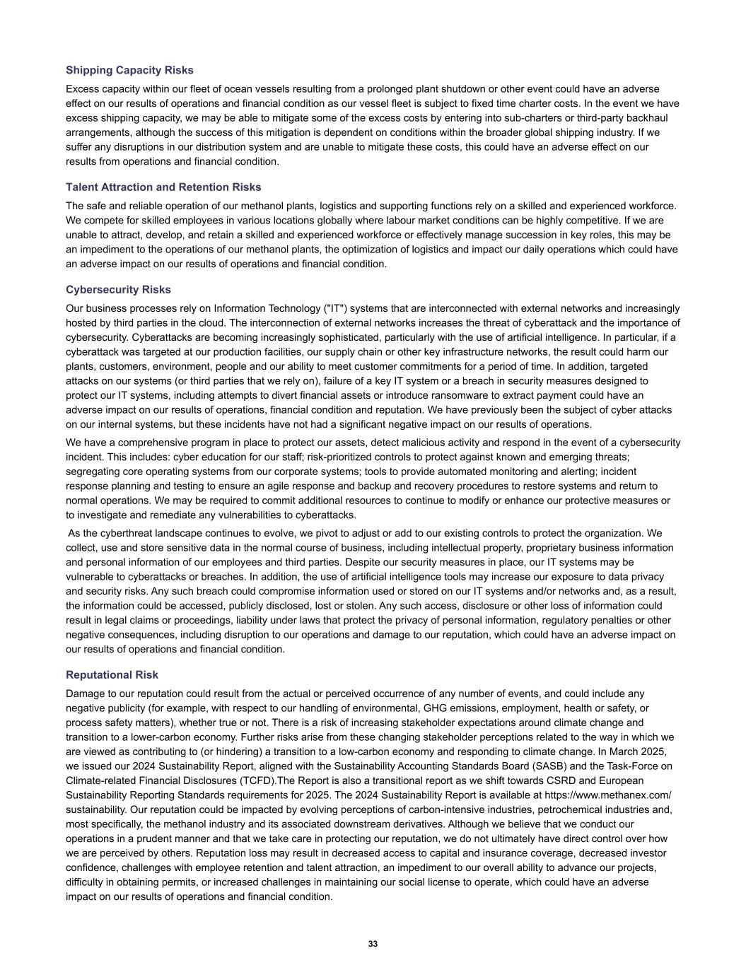 Shipping Capacity Risks Excess capacity within our fleet of ocean vessels resulting from a prolonged plant shutdown or other event could have an adverse effect on our results of operations and financial condition as our vessel fleet is subject to fixed time charter costs. In the event we have excess shipping capacity, we may be able to mitigate some of the excess costs by entering into sub-charters or third-party backhaul arrangements, although the success of this mitigation is dependent on conditions within the broader global shipping industry. If we suffer any disruptions in our distribution system and are unable to mitigate these costs, this could have an adverse effect on our results from operations and financial condition. Talent Attraction and Retention Risks The safe and reliable operation of our methanol plants, logistics and supporting functions rely on a skilled and experienced workforce. We compete for skilled employees in various locations globally where labour market conditions can be highly competitive. If we are unable to attract, develop, and retain a skilled and experienced workforce or effectively manage succession in key roles, this may be an impediment to the operations of our methanol plants, the optimization of logistics and impact our daily operations which could have an adverse impact on our results of operations and financial condition. Cybersecurity Risks Our business processes rely on Information Technology ("IT") systems that are interconnected with external networks and increasingly hosted by third parties in the cloud. The interconnection of external networks increases the threat of cyberattack and the importance of cybersecurity. Cyberattacks are becoming increasingly sophisticated, particularly with the use of artificial intelligence. In particular, if a cyberattack was targeted at our production facilities, our supply chain or other key infrastructure networks, the result could harm our plants, customers, environment, people and our ability to meet customer commitments for a period of time. In addition, targeted attacks on our systems (or third parties that we rely on), failure of a key IT system or a breach in security measures designed to protect our IT systems, including attempts to divert financial assets or introduce ransomware to extract payment could have an adverse impact on our results of operations, financial condition and reputation. We have previously been the subject of cyber attacks on our internal systems, but these incidents have not had a significant negative impact on our results of operations. We have a comprehensive program in place to protect our assets, detect malicious activity and respond in the event of a cybersecurity incident. This includes: cyber education for our staff; risk-prioritized controls to protect against known and emerging threats; segregating core operating systems from our corporate systems; tools to provide automated monitoring and alerting; incident response planning and testing to ensure an agile response and backup and recovery procedures to restore systems and return to normal operations. We may be required to commit additional resources to continue to modify or enhance our protective measures or to investigate and remediate any vulnerabilities to cyberattacks. As the cyberthreat landscape continues to evolve, we pivot to adjust or add to our existing controls to protect the organization. We collect, use and store sensitive data in the normal course of business, including intellectual property, proprietary business information and personal information of our employees and third parties. Despite our security measures in place, our IT systems may be vulnerable to cyberattacks or breaches. In addition, the use of artificial intelligence tools may increase our exposure to data privacy and security risks. Any such breach could compromise information used or stored on our IT systems and/or networks and, as a result, the information could be accessed, publicly disclosed, lost or stolen. Any such access, disclosure or other loss of information could result in legal claims or proceedings, liability under laws that protect the privacy of personal information, regulatory penalties or other negative consequences, including disruption to our operations and damage to our reputation, which could have an adverse impact on our results of operations and financial condition. Reputational Risk Damage to our reputation could result from the actual or perceived occurrence of any number of events, and could include any negative publicity (for example, with respect to our handling of environmental, GHG emissions, employment, health or safety, or process safety matters), whether true or not. There is a risk of increasing stakeholder expectations around climate change and transition to a lower-carbon economy. Further risks arise from these changing stakeholder perceptions related to the way in which we are viewed as contributing to (or hindering) a transition to a low-carbon economy and responding to climate change. In March 2025, we issued our 2024 Sustainability Report, aligned with the Sustainability Accounting Standards Board (SASB) and the Task-Force on Climate-related Financial Disclosures (TCFD).The Report is also a transitional report as we shift towards CSRD and European Sustainability Reporting Standards requirements for 2025. The 2024 Sustainability Report is available at https://www.methanex.com/ sustainability. Our reputation could be impacted by evolving perceptions of carbon-intensive industries, petrochemical industries and, most specifically, the methanol industry and its associated downstream derivatives. Although we believe that we conduct our operations in a prudent manner and that we take care in protecting our reputation, we do not ultimately have direct control over how we are perceived by others. Reputation loss may result in decreased access to capital and insurance coverage, decreased investor confidence, chal