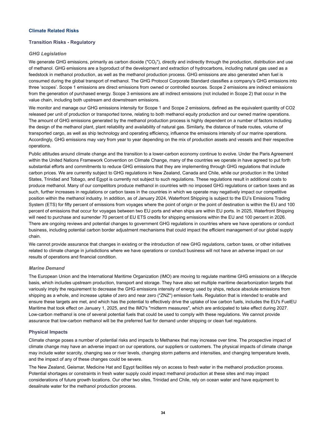 Climate Related Risks Transition Risks - Regulatory GHG Legislation We generate GHG emissions, primarily as carbon dioxide ("CO2"), directly and indirectly through the production, distribution and use of methanol. GHG emissions are a byproduct of the development and extraction of hydrocarbons, including natural gas used as a feedstock in methanol production, as well as the methanol production process. GHG emissions are also generated when fuel is consumed during the global transport of methanol. The GHG Protocol Corporate Standard classifies a company’s GHG emissions into three ‘scopes’. Scope 1 emissions are direct emissions from owned or controlled sources. Scope 2 emissions are indirect emissions from the generation of purchased energy. Scope 3 emissions are all indirect emissions (not included in Scope 2) that occur in the value chain, including both upstream and downstream emissions. We monitor and manage our GHG emissions intensity for Scope 1 and Scope 2 emissions, defined as the equivalent quantity of CO2 released per unit of production or transported tonne, relating to both methanol equity production and our owned marine operations. The amount of GHG emissions generated by the methanol production process is highly dependent on a number of factors including the design of the methanol plant, plant reliability and availability of natural gas. Similarly, the distance of trade routes, volume of transported cargo, as well as ship technology and operating efficiency, influence the emissions intensity of our marine operations. Accordingly, GHG emissions may vary from year to year depending on the mix of production assets and vessels and their respective operations. Public attitudes around climate change and the transition to a lower-carbon economy continue to evolve. Under the Paris Agreement within the United Nations Framework Convention on Climate Change, many of the countries we operate in have agreed to put forth substantial efforts and commitments to reduce GHG emissions that they are implementing through GHG regulations that include carbon prices. We are currently subject to GHG regulations in New Zealand, Canada and Chile, while our production in the United States, Trinidad and Tobago, and Egypt is currently not subject to such regulations. These regulations result in additional costs to produce methanol. Many of our competitors produce methanol in countries with no imposed GHG regulations or carbon taxes and as such, further increases in regulations or carbon taxes in the countries in which we operate may negatively impact our competitive position within the methanol industry. In addition, as of January 2024, Waterfront Shipping is subject to the EU’s Emissions Trading System (ETS) for fifty percent of emissions from voyages where the point of origin or the point of destination is within the EU and 100 percent of emissions that occur for voyages between two EU ports and when ships are within EU ports. In 2025, Waterfront Shipping will need to purchase and surrender 70 percent of EU ETS credits for shipping emissions within the EU and 100 percent in 2026. There are ongoing reviews and potential changes to government GHG regulations in countries where we have operations or conduct business, including potential carbon border adjustment mechanisms that could impact the efficient management of our global supply chain. We cannot provide assurance that changes in existing or the introduction of new GHG regulations, carbon taxes, or other initiatives related to climate change in jurisdictions where we have operations or conduct business will not have an adverse impact on our results of operations and financial condition. Marine Demand The European Union and the International Maritime Organization (IMO) are moving to regulate maritime GHG emissions on a lifecycle basis, which includes upstream production, transport and storage. They have also set multiple maritime decarbonization targets that variously imply the requirement to decrease the GHG emissions intensity of energy used by ships, reduce absolute emissions from shipping as a whole, and increase uptake of zero and near zero ("ZNZ") emission fuels. Regulation that is intended to enable and ensure these targets are met, and which has the potential to effectively drive the uptake of low carbon fuels, includes the EU's FuelEU Maritime that took effect on January 1, 2025, and the IMO's "midterm measures", which are anticipated to take effect during 2027. Low-carbon methanol is one of several potential fuels that could be used to comply with these regulations. We cannot provide assurance that low-carbon methanol will be the preferred fuel for demand under shipping or clean fuel regulations. Physical Impacts Climate change poses a number of potential risks and impacts to Methanex that may increase over time. The prospective impact of climate change may have an adverse impact on our operations, our suppliers or customers. The physical impacts of climate change may include water scarcity, changing sea or river levels, changing storm patterns and intensities, and changing temperature levels, and the impact of any of these changes could be severe. The New Zealand, Geismar, Medicine Hat and Egypt facilities rely on access to fresh water in the methanol production process. Potential shortages or constraints in fresh water supply could impact methanol production at these sites and may impact considerations of future growth locations. Our other two sites, Trinidad and Chile, rely on ocean water and have equipment to desalinate water for the methanol production process. 34