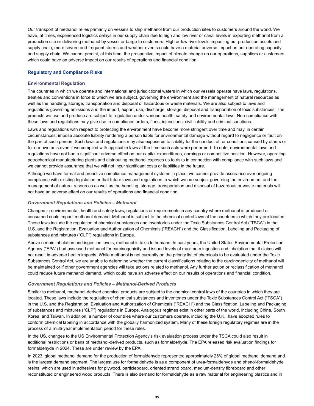 Our transport of methanol relies primarily on vessels to ship methanol from our production sites to customers around the world. We have, at times, experienced logistics delays in our supply chain due to high and low river or canal levels in exporting methanol from a production site or delivering methanol by vessel or barge to customers. High or low river levels impacting our production assets and supply chain, more severe and frequent storms and weather events could have a material adverse impact on our operating capacity and supply chain. We cannot predict, at this time, the prospective impact of climate change on our operations, suppliers or customers, which could have an adverse impact on our results of operations and financial condition. Regulatory and Compliance Risks Environmental Regulation The countries in which we operate and international and jurisdictional waters in which our vessels operate have laws, regulations, treaties and conventions in force to which we are subject, governing the environment and the management of natural resources as well as the handling, storage, transportation and disposal of hazardous or waste materials. We are also subject to laws and regulations governing emissions and the import, export, use, discharge, storage, disposal and transportation of toxic substances. The products we use and produce are subject to regulation under various health, safety and environmental laws. Non-compliance with these laws and regulations may give rise to compliance orders, fines, injunctions, civil liability and criminal sanctions. Laws and regulations with respect to protecting the environment have become more stringent over time and may, in certain circumstances, impose absolute liability rendering a person liable for environmental damage without regard to negligence or fault on the part of such person. Such laws and regulations may also expose us to liability for the conduct of, or conditions caused by others or for our own acts even if we complied with applicable laws at the time such acts were performed. To date, environmental laws and regulations have not had a significant adverse effect on our capital expenditures, earnings or competitive position. However, operating petrochemical manufacturing plants and distributing methanol exposes us to risks in connection with compliance with such laws and we cannot provide assurance that we will not incur significant costs or liabilities in the future. Although we have formal and proactive compliance management systems in place, we cannot provide assurance over ongoing compliance with existing legislation or that future laws and regulations to which we are subject governing the environment and the management of natural resources as well as the handling, storage, transportation and disposal of hazardous or waste materials will not have an adverse effect on our results of operations and financial condition. Government Regulations and Policies – Methanol Changes in environmental, health and safety laws, regulations or requirements in any country where methanol is produced or consumed could impact methanol demand. Methanol is subject to the chemical control laws of the countries in which they are located. These laws include the regulation of chemical substances and inventories under the Toxic Substances Control Act (“TSCA”) in the U.S. and the Registration, Evaluation and Authorization of Chemicals (“REACH”) and the Classification, Labeling and Packaging of substances and mixtures (“CLP”) regulations in Europe. Above certain inhalation and ingestion levels, methanol is toxic to humans. In past years, the United States Environmental Protection Agency ("EPA") had assessed methanol for carcinogenicity and issued levels of maximum ingestion and inhalation that it claims will not result in adverse health impacts. While methanol is not currently on the priority list of chemicals to be evaluated under the Toxic Substances Control Act, we are unable to determine whether the current classifications relating to the carcinogenicity of methanol will be maintained or if other government agencies will take actions related to methanol. Any further action or reclassification of methanol could reduce future methanol demand, which could have an adverse effect on our results of operations and financial condition. Government Regulations and Policies – Methanol-Derived Products Similar to methanol, methanol-derived chemical products are subject to the chemical control laws of the countries in which they are located. These laws include the regulation of chemical substances and inventories under the Toxic Substances Control Act (“TSCA”) in the U.S. and the Registration, Evaluation and Authorization of Chemicals (“REACH”) and the Classification, Labeling and Packaging of substances and mixtures (“CLP”) regulations in Europe. Analogous regimes exist in other parts of the world, including China, South Korea, and Taiwan. In addition, a number of countries where our customers operate, including the U.K., have adopted rules to conform chemical labeling in accordance with the globally harmonized system. Many of these foreign regulatory regimes are in the process of a multi-year implementation period for these rules. In the US, changes to the US Environmental Protection Agency's risk evaluation process under the TSCA could also result in additional restrictions or bans of methanol-derived products, such as formaldehyde. The EPA released risk evaluation findings for formaldehyde in 2024. These are under review by the EPA. In 2023, global methanol demand for the production of formaldehyde represented approximately 25% of global methanol demand and is the largest demand segment. The largest use for formaldehyde is as a component of urea-formaldehyde and phenol-formaldehyde resins, which are used in adhesives for plywood, particleboard, oriented strand board, medium-density fibreboard and other reconstituted or engineered wood product