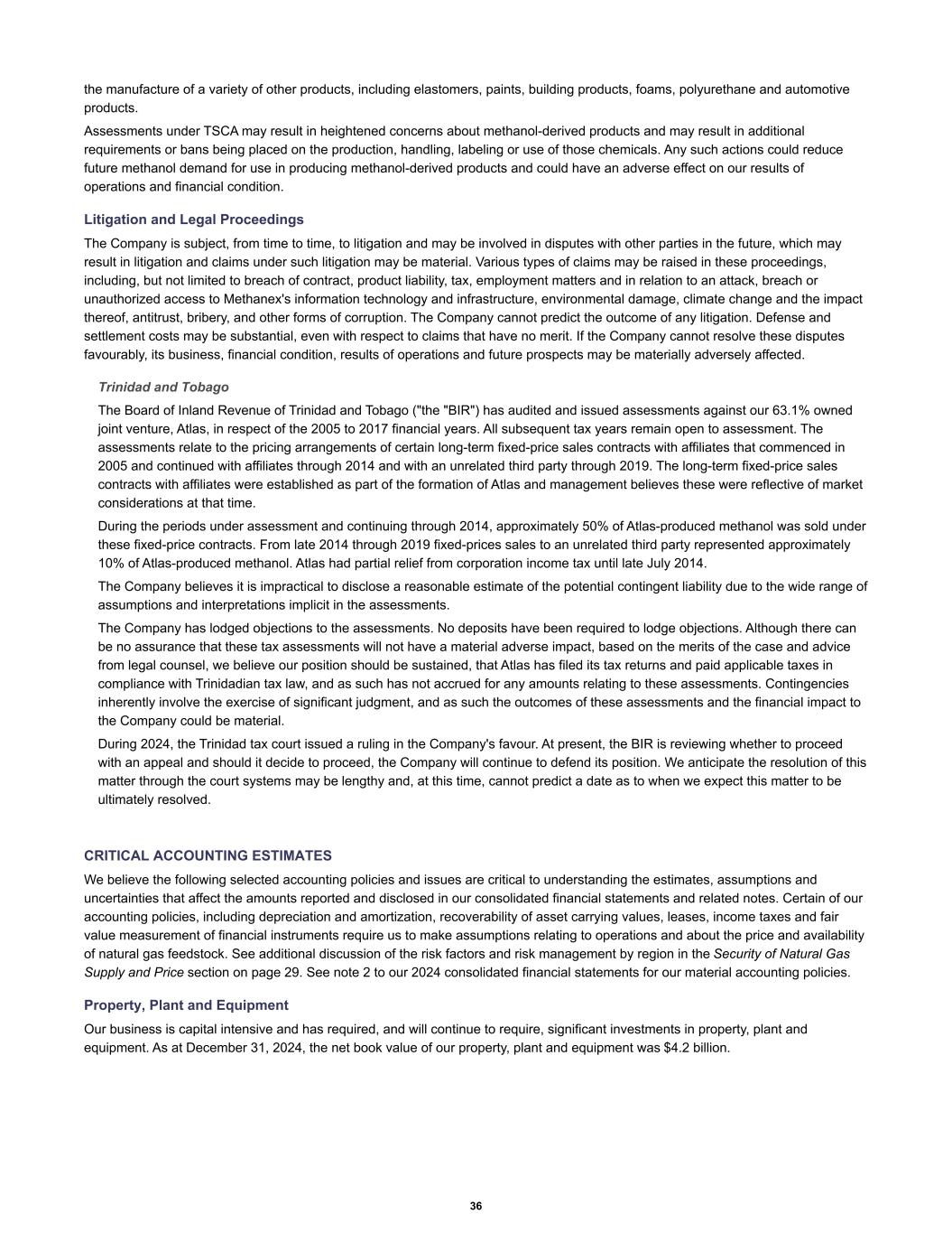 the manufacture of a variety of other products, including elastomers, paints, building products, foams, polyurethane and automotive products. Assessments under TSCA may result in heightened concerns about methanol-derived products and may result in additional requirements or bans being placed on the production, handling, labeling or use of those chemicals. Any such actions could reduce future methanol demand for use in producing methanol-derived products and could have an adverse effect on our results of operations and financial condition. Litigation and Legal Proceedings The Company is subject, from time to time, to litigation and may be involved in disputes with other parties in the future, which may result in litigation and claims under such litigation may be material. Various types of claims may be raised in these proceedings, including, but not limited to breach of contract, product liability, tax, employment matters and in relation to an attack, breach or unauthorized access to Methanex's information technology and infrastructure, environmental damage, climate change and the impact thereof, antitrust, bribery, and other forms of corruption. The Company cannot predict the outcome of any litigation. Defense and settlement costs may be substantial, even with respect to claims that have no merit. If the Company cannot resolve these disputes favourably, its business, financial condition, results of operations and future prospects may be materially adversely affected. Trinidad and Tobago The Board of Inland Revenue of Trinidad and Tobago ("the "BIR") has audited and issued assessments against our 63.1% owned joint venture, Atlas, in respect of the 2005 to 2017 financial years. All subsequent tax years remain open to assessment. The assessments relate to the pricing arrangements of certain long-term fixed-price sales contracts with affiliates that commenced in 2005 and continued with affiliates through 2014 and with an unrelated third party through 2019. The long-term fixed-price sales contracts with affiliates were established as part of the formation of Atlas and management believes these were reflective of market considerations at that time. During the periods under assessment and continuing through 2014, approximately 50% of Atlas-produced methanol was sold under these fixed-price contracts. From late 2014 through 2019 fixed-prices sales to an unrelated third party represented approximately 10% of Atlas-produced methanol. Atlas had partial relief from corporation income tax until late July 2014. The Company believes it is impractical to disclose a reasonable estimate of the potential contingent liability due to the wide range of assumptions and interpretations implicit in the assessments. The Company has lodged objections to the assessments. No deposits have been required to lodge objections. Although there can be no assurance that these tax assessments will not have a material adverse impact, based on the merits of the case and advice from legal counsel, we believe our position should be sustained, that Atlas has filed its tax returns and paid applicable taxes in compliance with Trinidadian tax law, and as such has not accrued for any amounts relating to these assessments. Contingencies inherently involve the exercise of significant judgment, and as such the outcomes of these assessments and the financial impact to the Company could be material. During 2024, the Trinidad tax court issued a ruling in the Company's favour. At present, the BIR is reviewing whether to proceed with an appeal and should it decide to proceed, the Company will continue to defend its position. We anticipate the resolution of this matter through the court systems may be lengthy and, at this time, cannot predict a date as to when we expect this matter to be ultimately resolved. CRITICAL ACCOUNTING ESTIMATES We believe the following selected accounting policies and issues are critical to understanding the estimates, assumptions and uncertainties that affect the amounts reported and disclosed in our consolidated financial statements and related notes. Certain of our accounting policies, including depreciation and amortization, recoverability of asset carrying values, leases, income taxes and fair value measurement of financial instruments require us to make assumptions relating to operations and about the price and availability of natural gas feedstock. See additional discussion of the risk factors and risk management by region in the Security of Natural Gas Supply and Price section on page 29. See note 2 to our 2024 consolidated financial statements for our material accounting policies. Property, Plant and Equipment Our business is capital intensive and has required, and will continue to require, significant investments in property, plant and equipment. As at December 31, 2024, the net book value of our property, plant and equipment was $4.2 billion. 36