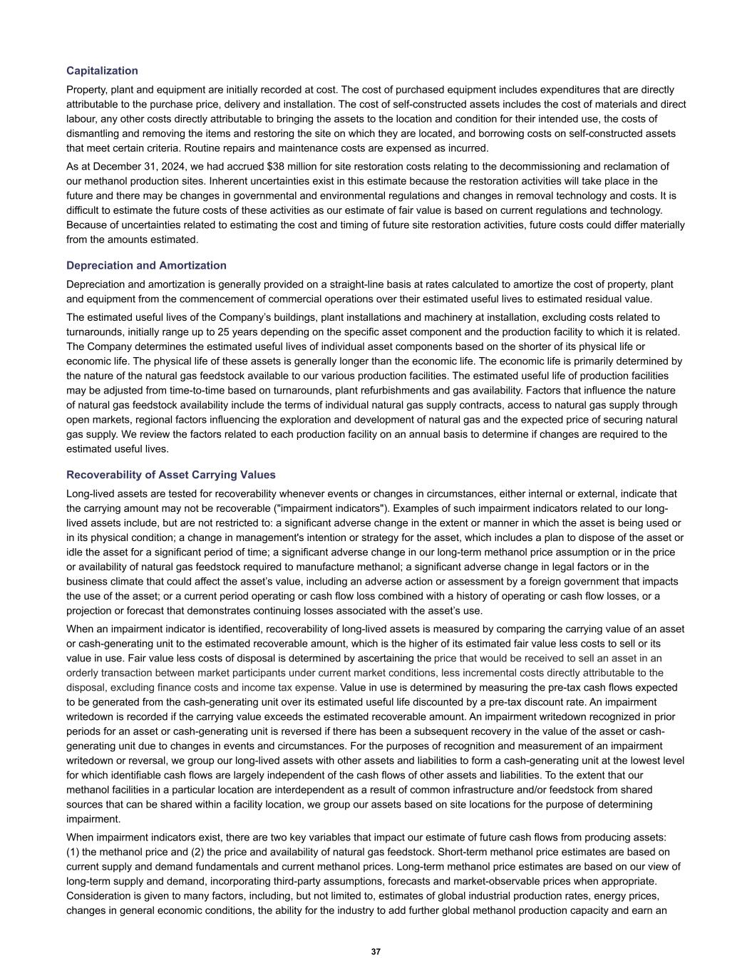 Capitalization Property, plant and equipment are initially recorded at cost. The cost of purchased equipment includes expenditures that are directly attributable to the purchase price, delivery and installation. The cost of self-constructed assets includes the cost of materials and direct labour, any other costs directly attributable to bringing the assets to the location and condition for their intended use, the costs of dismantling and removing the items and restoring the site on which they are located, and borrowing costs on self-constructed assets that meet certain criteria. Routine repairs and maintenance costs are expensed as incurred. As at December 31, 2024, we had accrued $38 million for site restoration costs relating to the decommissioning and reclamation of our methanol production sites. Inherent uncertainties exist in this estimate because the restoration activities will take place in the future and there may be changes in governmental and environmental regulations and changes in removal technology and costs. It is difficult to estimate the future costs of these activities as our estimate of fair value is based on current regulations and technology. Because of uncertainties related to estimating the cost and timing of future site restoration activities, future costs could differ materially from the amounts estimated. Depreciation and Amortization Depreciation and amortization is generally provided on a straight-line basis at rates calculated to amortize the cost of property, plant and equipment from the commencement of commercial operations over their estimated useful lives to estimated residual value. The estimated useful lives of the Company’s buildings, plant installations and machinery at installation, excluding costs related to turnarounds, initially range up to 25 years depending on the specific asset component and the production facility to which it is related. The Company determines the estimated useful lives of individual asset components based on the shorter of its physical life or economic life. The physical life of these assets is generally longer than the economic life. The economic life is primarily determined by the nature of the natural gas feedstock available to our various production facilities. The estimated useful life of production facilities may be adjusted from time-to-time based on turnarounds, plant refurbishments and gas availability. Factors that influence the nature of natural gas feedstock availability include the terms of individual natural gas supply contracts, access to natural gas supply through open markets, regional factors influencing the exploration and development of natural gas and the expected price of securing natural gas supply. We review the factors related to each production facility on an annual basis to determine if changes are required to the estimated useful lives. Recoverability of Asset Carrying Values Long-lived assets are tested for recoverability whenever events or changes in circumstances, either internal or external, indicate that the carrying amount may not be recoverable ("impairment indicators"). Examples of such impairment indicators related to our long- lived assets include, but are not restricted to: a significant adverse change in the extent or manner in which the asset is being used or in its physical condition; a change in management's intention or strategy for the asset, which includes a plan to dispose of the asset or idle the asset for a significant period of time; a significant adverse change in our long-term methanol price assumption or in the price or availability of natural gas feedstock required to manufacture methanol; a significant adverse change in legal factors or in the business climate that could affect the asset’s value, including an adverse action or assessment by a foreign government that impacts the use of the asset; or a current period operating or cash flow loss combined with a history of operating or cash flow losses, or a projection or forecast that demonstrates continuing losses associated with the asset’s use. When an impairment indicator is identified, recoverability of long-lived assets is measured by comparing the carrying value of an asset or cash-generating unit to the estimated recoverable amount, which is the higher of its estimated fair value less costs to sell or its value in use. Fair value less costs of disposal is determined by ascertaining the price that would be received to sell an asset in an orderly transaction between market participants under current market conditions, less incremental costs directly attributable to the disposal, excluding finance costs and income tax expense. Value in use is determined by measuring the pre-tax cash flows expected to be generated from the cash-generating unit over its estimated useful life discounted by a pre-tax discount rate. An impairment writedown is recorded if the carrying value exceeds the estimated recoverable amount. An impairment writedown recognized in prior periods for an asset or cash-generating unit is reversed if there has been a subsequent recovery in the value of the asset or cash- generating unit due to changes in events and circumstances. For the purposes of recognition and measurement of an impairment writedown or reversal, we group our long-lived assets with other assets and liabilities to form a cash-generating unit at the lowest level for which identifiable cash flows are largely independent of the cash flows of other assets and liabilities. To the extent that our methanol facilities in a particular location are interdependent as a result of common infrastructure and/or feedstock from shared sources that can be shared within a facility location, we group our assets based on site locations for the purpose of determining impairment. When impairment indicators exist, there are two key variables that impact our estimate of future cash flows from producing assets: (1) the methanol price and (2) the price and avail