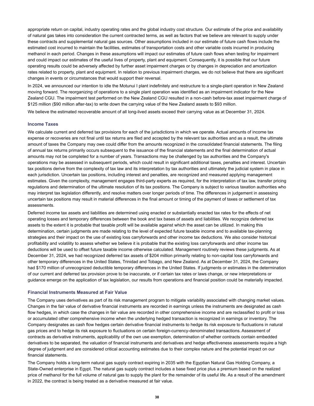 appropriate return on capital, industry operating rates and the global industry cost structure. Our estimate of the price and availability of natural gas takes into consideration the current contracted terms, as well as factors that we believe are relevant to supply under these contracts and supplemental natural gas sources. Other assumptions included in our estimate of future cash flows include the estimated cost incurred to maintain the facilities, estimates of transportation costs and other variable costs incurred in producing methanol in each period. Changes in these assumptions will impact our estimates of future cash flows when testing for impairment and could impact our estimates of the useful lives of property, plant and equipment. Consequently, it is possible that our future operating results could be adversely affected by further asset impairment charges or by changes in depreciation and amortization rates related to property, plant and equipment. In relation to previous impairment charges, we do not believe that there are significant changes in events or circumstances that would support their reversal. In 2024, we announced our intention to idle the Motunui I plant indefinitely and restructure to a single-plant operation in New Zealand moving forward. The reorganizing of operations to a single plant operation was identified as an impairment indicator for the New Zealand CGU. The impairment test performed on the New Zealand CGU resulted in a non-cash before-tax asset impairment charge of $125 million ($90 million after-tax) to write down the carrying value of the New Zealand assets to $93 million. We believe the estimated recoverable amount of all long-lived assets exceed their carrying value as at December 31, 2024. Income Taxes We calculate current and deferred tax provisions for each of the jurisdictions in which we operate. Actual amounts of income tax expense or recoveries are not final until tax returns are filed and accepted by the relevant tax authorities and as a result, the ultimate amount of taxes the Company may owe could differ from the amounts recognized in the consolidated financial statements. The filing of annual tax returns primarily occurs subsequent to the issuance of the financial statements and the final determination of actual amounts may not be completed for a number of years. Transactions may be challenged by tax authorities and the Company's operations may be assessed in subsequent periods, which could result in significant additional taxes, penalties and interest. Uncertain tax positions derive from the complexity of tax law and its interpretation by tax authorities and ultimately the judicial system in place in each jurisdiction. Uncertain tax positions, including interest and penalties, are recognized and measured applying management estimates. Given the complexity, management engages third-party experts as required, for the interpretation of tax law, transfer pricing regulations and determination of the ultimate resolution of its tax positions. The Company is subject to various taxation authorities who may interpret tax legislation differently, and resolve matters over longer periods of time. The differences in judgement in assessing uncertain tax positions may result in material differences in the final amount or timing of the payment of taxes or settlement of tax assessments. Deferred income tax assets and liabilities are determined using enacted or substantially enacted tax rates for the effects of net operating losses and temporary differences between the book and tax bases of assets and liabilities. We recognize deferred tax assets to the extent it is probable that taxable profit will be available against which the asset can be utilized. In making this determination, certain judgments are made relating to the level of expected future taxable income and to available tax-planning strategies and their impact on the use of existing loss carryforwards and other income tax deductions. We also consider historical profitability and volatility to assess whether we believe it is probable that the existing loss carryforwards and other income tax deductions will be used to offset future taxable income otherwise calculated. Management routinely reviews these judgments. As at December 31, 2024, we had recognized deferred tax assets of $204 million primarily relating to non-capital loss carryforwards and other temporary differences in the United States, Trinidad and Tobago, and New Zealand. As at December 31, 2024, the Company had $170 million of unrecognized deductible temporary differences in the United States. If judgments or estimates in the determination of our current and deferred tax provision prove to be inaccurate, or if certain tax rates or laws change, or new interpretations or guidance emerge on the application of tax legislation, our results from operations and financial position could be materially impacted. Financial Instruments Measured at Fair Value The Company uses derivatives as part of its risk management program to mitigate variability associated with changing market values. Changes in the fair value of derivative financial instruments are recorded in earnings unless the instruments are designated as cash flow hedges, in which case the changes in fair value are recorded in other comprehensive income and are reclassified to profit or loss or accumulated other comprehensive income when the underlying hedged transaction is recognized in earnings or inventory. The Company designates as cash flow hedges certain derivative financial instruments to hedge its risk exposure to fluctuations in natural gas prices and to hedge its risk exposure to fluctuations on certain foreign-currency-denominated transactions. Assessment of contracts as derivative instruments, applicability of the own use exemption, determination of whether contracts contain embedded derivatives to be separated, the valuation of financial instruments and derivatives and hedge eff