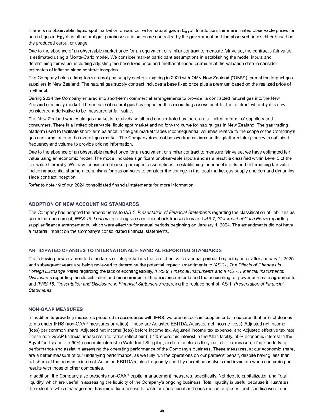 There is no observable, liquid spot market or forward curve for natural gas in Egypt. In addition, there are limited observable prices for natural gas in Egypt as all natural gas purchases and sales are controlled by the government and the observed prices differ based on the produced output or usage. Due to the absence of an observable market price for an equivalent or similar contract to measure fair value, the contract's fair value is estimated using a Monte-Carlo model. We consider market participant assumptions in establishing the model inputs and determining fair value, including adjusting the base fixed price and methanol based premium at the valuation date to consider estimates of inflation since contract inception. The Company holds a long-term natural gas supply contract expiring in 2029 with OMV New Zealand ("OMV"), one of the largest gas suppliers in New Zealand. The natural gas supply contract includes a base fixed price plus a premium based on the realized price of methanol. During 2024 the Company entered into short-term commercial arrangements to provide its contracted natural gas into the New Zealand electricity market. The on-sale of natural gas has impacted the accounting assessment for the contract whereby it is now considered a derivative to be measured at fair value. The New Zealand wholesale gas market is relatively small and concentrated as there are a limited number of suppliers and consumers. There is a limited observable, liquid spot market and no forward curve for natural gas in New Zealand. The gas trading platform used to facilitate short-term balance in the gas market trades inconsequential volumes relative to the scope of the Company’s gas consumption and the overall gas market. The Company does not believe transactions on this platform take place with sufficient frequency and volume to provide pricing information. Due to the absence of an observable market price for an equivalent or similar contract to measure fair value, we have estimated fair value using an economic model. The model includes significant unobservable inputs and as a result is classified within Level 3 of the fair value hierarchy. We have considered market participant assumptions in establishing the model inputs and determining fair value, including potential sharing mechanisms for gas on-sales to consider the change in the local market gas supply and demand dynamics since contract inception. Refer to note 19 of our 2024 consolidated financial statements for more information. ADOPTION OF NEW ACCOUNTING STANDARDS The Company has adopted the amendments to IAS 1, Presentation of Financial Statements regarding the classification of liabilities as current or non-current, IFRS 16, Leases regarding sale-and-leaseback transactions and IAS 7, Statement of Cash Flows regarding supplier finance arrangements, which were effective for annual periods beginning on January 1, 2024. The amendments did not have a material impact on the Company's consolidated financial statements. ANTICIPATED CHANGES TO INTERNATIONAL FINANCIAL REPORTING STANDARDS The following new or amended standards or interpretations that are effective for annual periods beginning on or after January 1, 2025 and subsequent years are being reviewed to determine the potential impact: amendments to IAS 21, The Effects of Changes in Foreign Exchange Rates regarding the lack of exchangeability, IFRS 9, Financial Instruments and IFRS 7, Financial Instruments: Disclosures regarding the classification and measurement of financial instruments and the accounting for power purchase agreements and IFRS 18, Presentation and Disclosure in Financial Statements regarding the replacement of IAS 1, Presentation of Financial Statements. NON-GAAP MEASURES In addition to providing measures prepared in accordance with IFRS, we present certain supplemental measures that are not defined terms under IFRS (non-GAAP measures or ratios). These are Adjusted EBITDA, Adjusted net income (loss), Adjusted net income (loss) per common share, Adjusted net income (loss) before income tax, Adjusted income tax expense, and Adjusted effective tax rate. These non-GAAP financial measures and ratios reflect our 63.1% economic interest in the Atlas facility, 50% economic interest in the Egypt facility and our 60% economic interest in Waterfront Shipping, and are useful as they are a better measure of our underlying performance and assist in assessing the operating performance of the Company’s business. These measures, at our economic share, are a better measure of our underlying performance, as we fully run the operations on our partners' behalf, despite having less than full share of the economic interest. Adjusted EBITDA is also frequently used by securities analysts and investors when comparing our results with those of other companies. In addition, the Company also presents non-GAAP capital management measures, specifically, Net debt to capitalization and Total liquidity, which are useful in assessing the liquidity of the Company’s ongoing business. Total liquidity is useful because it illustrates the extent to which management has immediate access to cash for operational and construction purposes, and is indicative of our 39