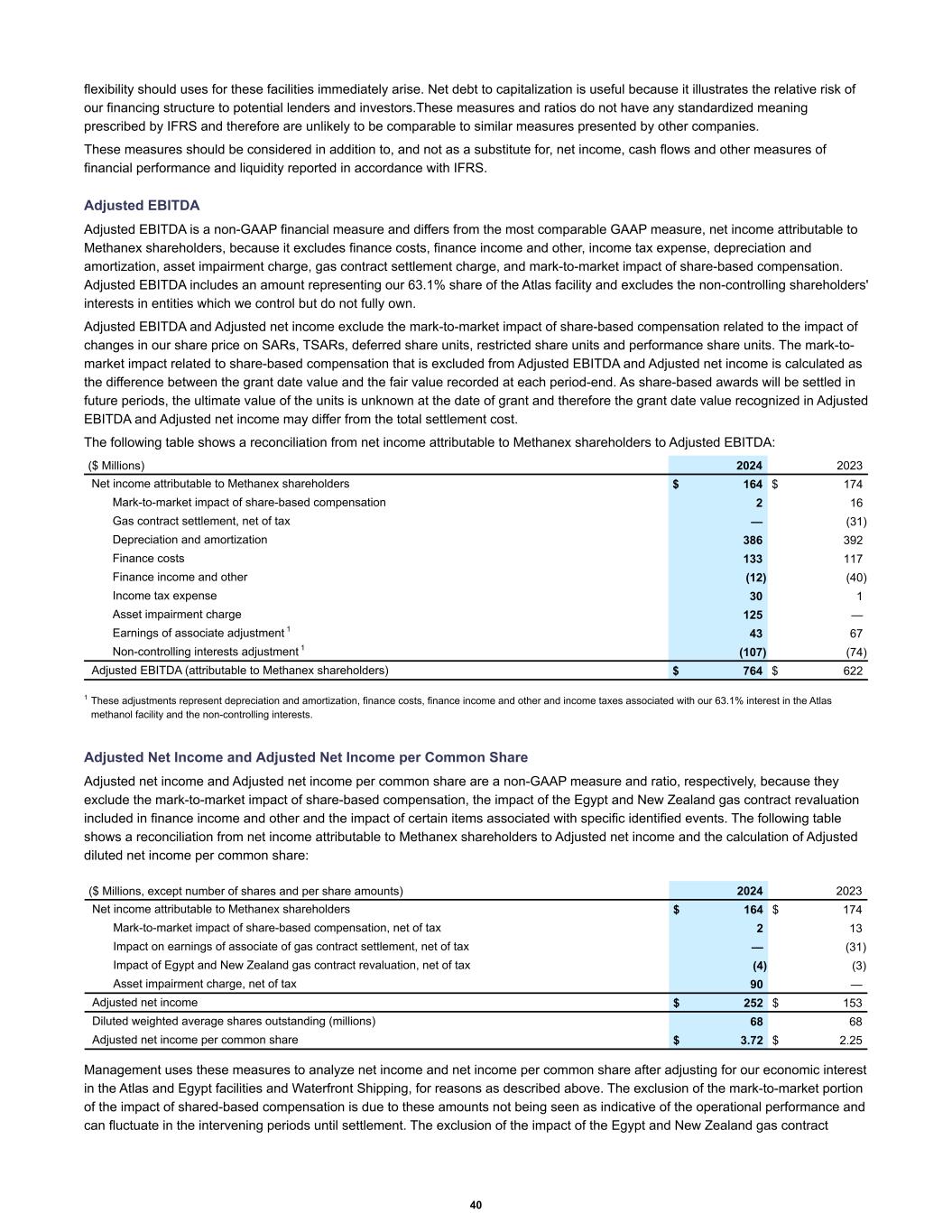 flexibility should uses for these facilities immediately arise. Net debt to capitalization is useful because it illustrates the relative risk of our financing structure to potential lenders and investors.These measures and ratios do not have any standardized meaning prescribed by IFRS and therefore are unlikely to be comparable to similar measures presented by other companies. These measures should be considered in addition to, and not as a substitute for, net income, cash flows and other measures of financial performance and liquidity reported in accordance with IFRS. Adjusted EBITDA Adjusted EBITDA is a non-GAAP financial measure and differs from the most comparable GAAP measure, net income attributable to Methanex shareholders, because it excludes finance costs, finance income and other, income tax expense, depreciation and amortization, asset impairment charge, gas contract settlement charge, and mark-to-market impact of share-based compensation. Adjusted EBITDA includes an amount representing our 63.1% share of the Atlas facility and excludes the non-controlling shareholders' interests in entities which we control but do not fully own. Adjusted EBITDA and Adjusted net income exclude the mark-to-market impact of share-based compensation related to the impact of changes in our share price on SARs, TSARs, deferred share units, restricted share units and performance share units. The mark-to- market impact related to share-based compensation that is excluded from Adjusted EBITDA and Adjusted net income is calculated as the difference between the grant date value and the fair value recorded at each period-end. As share-based awards will be settled in future periods, the ultimate value of the units is unknown at the date of grant and therefore the grant date value recognized in Adjusted EBITDA and Adjusted net income may differ from the total settlement cost. The following table shows a reconciliation from net income attributable to Methanex shareholders to Adjusted EBITDA: Net income attributable to Methanex shareholders $ 164 $ 174 Mark-to-market impact of share-based compensation 2 16 Gas contract settlement, net of tax — (31) Depreciation and amortization 386 392 Finance costs 133 117 Finance income and other (12) (40) Income tax expense 30 1 Asset impairment charge 125 — Earnings of associate adjustment 1 43 67 Non-controlling interests adjustment 1 (107) (74) Adjusted EBITDA (attributable to Methanex shareholders) $ 764 $ 622 ($ Millions) 2024 2023 1 These adjustments represent depreciation and amortization, finance costs, finance income and other and income taxes associated with our 63.1% interest in the Atlas methanol facility and the non-controlling interests. Adjusted Net Income and Adjusted Net Income per Common Share Adjusted net income and Adjusted net income per common share are a non-GAAP measure and ratio, respectively, because they exclude the mark-to-market impact of share-based compensation, the impact of the Egypt and New Zealand gas contract revaluation included in finance income and other and the impact of certain items associated with specific identified events. The following table shows a reconciliation from net income attributable to Methanex shareholders to Adjusted net income and the calculation of Adjusted diluted net income per common share: Net income attributable to Methanex shareholders $ 164 $ 174 Mark-to-market impact of share-based compensation, net of tax 2 13 Impact on earnings of associate of gas contract settlement, net of tax — (31) Impact of Egypt and New Zealand gas contract revaluation, net of tax (4) (3) Asset impairment charge, net of tax 90 — Adjusted net income $ 252 $ 153 Diluted weighted average shares outstanding (millions) 68 68 Adjusted net income per common share $ 3.72 $ 2.25 ($ Millions, except number of shares and per share amounts) 2024 2023 Management uses these measures to analyze net income and net income per common share after adjusting for our economic interest in the Atlas and Egypt facilities and Waterfront Shipping, for reasons as described above. The exclusion of the mark-to-market portion of the impact of shared-based compensation is due to these amounts not being seen as indicative of the operational performance and can fluctuate in the intervening periods until settlement. The exclusion of the impact of the Egypt and New Zealand gas contract 40