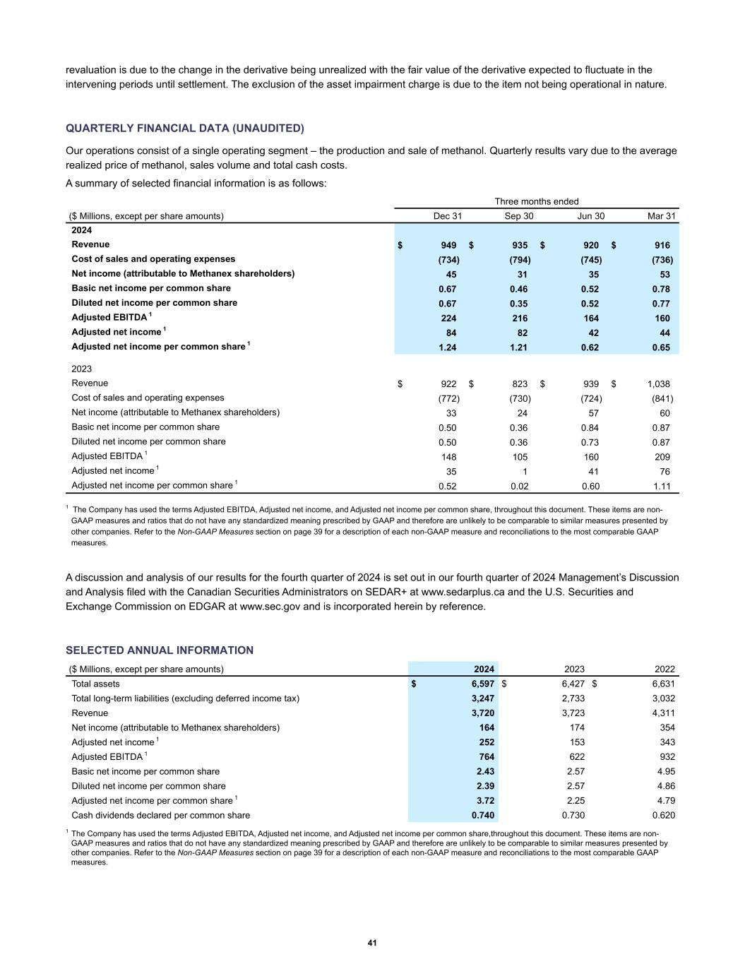 revaluation is due to the change in the derivative being unrealized with the fair value of the derivative expected to fluctuate in the intervening periods until settlement. The exclusion of the asset impairment charge is due to the item not being operational in nature. QUARTERLY FINANCIAL DATA (UNAUDITED) Our operations consist of a single operating segment – the production and sale of methanol. Quarterly results vary due to the average realized price of methanol, sales volume and total cash costs. A summary of selected financial information is as follows: ($ Millions, except per share amounts) Dec 31 Sep 30 Jun 30 Mar 31 2024 Revenue $ 949 $ 935 $ 920 $ 916 Cost of sales and operating expenses (734) (794) (745) (736) Net income (attributable to Methanex shareholders) 45 31 35 53 Basic net income per common share 0.67 0.46 0.52 0.78 Diluted net income per common share 0.67 0.35 0.52 0.77 Adjusted EBITDA 1 224 216 164 160 Adjusted net income 1 84 82 42 44 Adjusted net income per common share 1 1.24 1.21 0.62 0.65 2023 Revenue $ 922 $ 823 $ 939 $ 1,038 Cost of sales and operating expenses (772) (730) (724) (841) Net income (attributable to Methanex shareholders) 33 24 57 60 Basic net income per common share 0.50 0.36 0.84 0.87 Diluted net income per common share 0.50 0.36 0.73 0.87 Adjusted EBITDA 1 148 105 160 209 Adjusted net income 1 35 1 41 76 Adjusted net income per common share 1 0.52 0.02 0.60 1.11 Three months ended 1 The Company has used the terms Adjusted EBITDA, Adjusted net income, and Adjusted net income per common share, throughout this document. These items are non- GAAP measures and ratios that do not have any standardized meaning prescribed by GAAP and therefore are unlikely to be comparable to similar measures presented by other companies. Refer to the Non-GAAP Measures section on page 39 for a description of each non-GAAP measure and reconciliations to the most comparable GAAP measures. A discussion and analysis of our results for the fourth quarter of 2024 is set out in our fourth quarter of 2024 Management’s Discussion and Analysis filed with the Canadian Securities Administrators on SEDAR+ at www.sedarplus.ca and the U.S. Securities and Exchange Commission on EDGAR at www.sec.gov and is incorporated herein by reference. SELECTED ANNUAL INFORMATION Total assets $ 6,597 $ 6,427 $ 6,631 Total long-term liabilities (excluding deferred income tax) 3,247 2,733 3,032 Revenue 3,720 3,723 4,311 Net income (attributable to Methanex shareholders) 164 174 354 Adjusted net income 1 252 153 343 Adjusted EBITDA 1 764 622 932 Basic net income per common share 2.43 2.57 4.95 Diluted net income per common share 2.39 2.57 4.86 Adjusted net income per common share 1 3.72 2.25 4.79 Cash dividends declared per common share 0.740 0.730 0.620 ($ Millions, except per share amounts) 2024 2023 2022 1 The Company has used the terms Adjusted EBITDA, Adjusted net income, and Adjusted net income per common share,throughout this document. These items are non- GAAP measures and ratios that do not have any standardized meaning prescribed by GAAP and therefore are unlikely to be comparable to similar measures presented by other companies. Refer to the Non-GAAP Measures section on page 39 for a description of each non-GAAP measure and reconciliations to the most comparable GAAP measures. 41