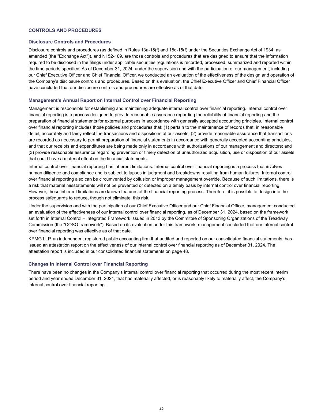 CONTROLS AND PROCEDURES Disclosure Controls and Procedures Disclosure controls and procedures (as defined in Rules 13a-15(f) and 15d-15(f) under the Securities Exchange Act of 1934, as amended (the "Exchange Act")), and NI 52-109, are those controls and procedures that are designed to ensure that the information required to be disclosed in the filings under applicable securities regulations is recorded, processed, summarized and reported within the time periods specified. As of December 31, 2024, under the supervision and with the participation of our management, including our Chief Executive Officer and Chief Financial Officer, we conducted an evaluation of the effectiveness of the design and operation of the Company’s disclosure controls and procedures. Based on this evaluation, the Chief Executive Officer and Chief Financial Officer have concluded that our disclosure controls and procedures are effective as of that date. Management’s Annual Report on Internal Control over Financial Reporting Management is responsible for establishing and maintaining adequate internal control over financial reporting. Internal control over financial reporting is a process designed to provide reasonable assurance regarding the reliability of financial reporting and the preparation of financial statements for external purposes in accordance with generally accepted accounting principles. Internal control over financial reporting includes those policies and procedures that: (1) pertain to the maintenance of records that, in reasonable detail, accurately and fairly reflect the transactions and dispositions of our assets; (2) provide reasonable assurance that transactions are recorded as necessary to permit preparation of financial statements in accordance with generally accepted accounting principles, and that our receipts and expenditures are being made only in accordance with authorizations of our management and directors; and (3) provide reasonable assurance regarding prevention or timely detection of unauthorized acquisition, use or disposition of our assets that could have a material effect on the financial statements. Internal control over financial reporting has inherent limitations. Internal control over financial reporting is a process that involves human diligence and compliance and is subject to lapses in judgment and breakdowns resulting from human failures. Internal control over financial reporting also can be circumvented by collusion or improper management override. Because of such limitations, there is a risk that material misstatements will not be prevented or detected on a timely basis by internal control over financial reporting. However, these inherent limitations are known features of the financial reporting process. Therefore, it is possible to design into the process safeguards to reduce, though not eliminate, this risk. Under the supervision and with the participation of our Chief Executive Officer and our Chief Financial Officer, management conducted an evaluation of the effectiveness of our internal control over financial reporting, as of December 31, 2024, based on the framework set forth in Internal Control – Integrated Framework issued in 2013 by the Committee of Sponsoring Organizations of the Treadway Commission (the "COSO framework"). Based on its evaluation under this framework, management concluded that our internal control over financial reporting was effective as of that date. KPMG LLP, an independent registered public accounting firm that audited and reported on our consolidated financial statements, has issued an attestation report on the effectiveness of our internal control over financial reporting as of December 31, 2024. The attestation report is included in our consolidated financial statements on page 48. Changes in Internal Control over Financial Reporting There have been no changes in the Company’s internal control over financial reporting that occurred during the most recent interim period and year ended December 31, 2024, that has materially affected, or is reasonably likely to materially affect, the Company’s internal control over financial reporting. 42