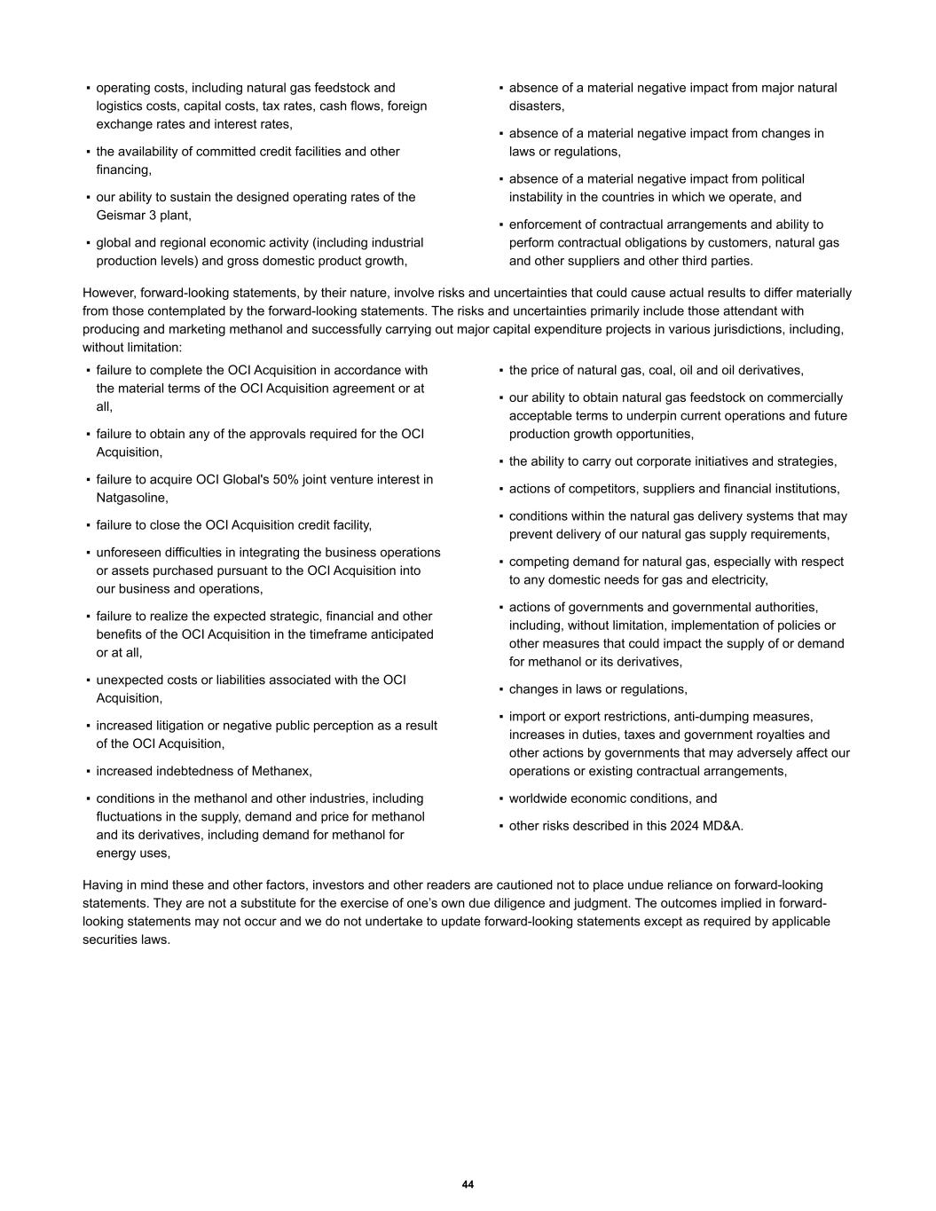 ▪ operating costs, including natural gas feedstock and logistics costs, capital costs, tax rates, cash flows, foreign exchange rates and interest rates, ▪ the availability of committed credit facilities and other financing, ▪ our ability to sustain the designed operating rates of the Geismar 3 plant, ▪ global and regional economic activity (including industrial production levels) and gross domestic product growth, ▪ absence of a material negative impact from major natural disasters, ▪ absence of a material negative impact from changes in laws or regulations, ▪ absence of a material negative impact from political instability in the countries in which we operate, and ▪ enforcement of contractual arrangements and ability to perform contractual obligations by customers, natural gas and other suppliers and other third parties. However, forward-looking statements, by their nature, involve risks and uncertainties that could cause actual results to differ materially from those contemplated by the forward-looking statements. The risks and uncertainties primarily include those attendant with producing and marketing methanol and successfully carrying out major capital expenditure projects in various jurisdictions, including, without limitation: ▪ failure to complete the OCI Acquisition in accordance with the material terms of the OCI Acquisition agreement or at all, ▪ failure to obtain any of the approvals required for the OCI Acquisition, ▪ failure to acquire OCI Global's 50% joint venture interest in Natgasoline, ▪ failure to close the OCI Acquisition credit facility, ▪ unforeseen difficulties in integrating the business operations or assets purchased pursuant to the OCI Acquisition into our business and operations, ▪ failure to realize the expected strategic, financial and other benefits of the OCI Acquisition in the timeframe anticipated or at all, ▪ unexpected costs or liabilities associated with the OCI Acquisition, ▪ increased litigation or negative public perception as a result of the OCI Acquisition, ▪ increased indebtedness of Methanex, ▪ conditions in the methanol and other industries, including fluctuations in the supply, demand and price for methanol and its derivatives, including demand for methanol for energy uses, ▪ the price of natural gas, coal, oil and oil derivatives, ▪ our ability to obtain natural gas feedstock on commercially acceptable terms to underpin current operations and future production growth opportunities, ▪ the ability to carry out corporate initiatives and strategies, ▪ actions of competitors, suppliers and financial institutions, ▪ conditions within the natural gas delivery systems that may prevent delivery of our natural gas supply requirements, ▪ competing demand for natural gas, especially with respect to any domestic needs for gas and electricity, ▪ actions of governments and governmental authorities, including, without limitation, implementation of policies or other measures that could impact the supply of or demand for methanol or its derivatives, ▪ changes in laws or regulations, ▪ import or export restrictions, anti-dumping measures, increases in duties, taxes and government royalties and other actions by governments that may adversely affect our operations or existing contractual arrangements, ▪ worldwide economic conditions, and ▪ other risks described in this 2024 MD&A. Having in mind these and other factors, investors and other readers are cautioned not to place undue reliance on forward-looking statements. They are not a substitute for the exercise of one’s own due diligence and judgment. The outcomes implied in forward- looking statements may not occur and we do not undertake to update forward-looking statements except as required by applicable securities laws. 44