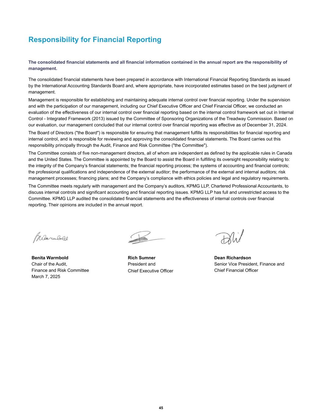 Exhibit 99.3 Responsibility for Financial Reporting The consolidated financial statements and all financial information contained in the annual report are the responsibility of management. The consolidated financial statements have been prepared in accordance with International Financial Reporting Standards as issued by the International Accounting Standards Board and, where appropriate, have incorporated estimates based on the best judgment of management. Management is responsible for establishing and maintaining adequate internal control over financial reporting. Under the supervision and with the participation of our management, including our Chief Executive Officer and Chief Financial Officer, we conducted an evaluation of the effectiveness of our internal control over financial reporting based on the internal control framework set out in Internal Control - Integrated Framework (2013) issued by the Committee of Sponsoring Organizations of the Treadway Commission. Based on our evaluation, our management concluded that our internal control over financial reporting was effective as of December 31, 2024. The Board of Directors ("the Board") is responsible for ensuring that management fulfills its responsibilities for financial reporting and internal control, and is responsible for reviewing and approving the consolidated financial statements. The Board carries out this responsibility principally through the Audit, Finance and Risk Committee ("the Committee"). The Committee consists of five non-management directors, all of whom are independent as defined by the applicable rules in Canada and the United States. The Committee is appointed by the Board to assist the Board in fulfilling its oversight responsibility relating to: the integrity of the Company’s financial statements; the financial reporting process; the systems of accounting and financial controls; the professional qualifications and independence of the external auditor; the performance of the external and internal auditors; risk management processes; financing plans; and the Company’s compliance with ethics policies and legal and regulatory requirements. The Committee meets regularly with management and the Company’s auditors, KPMG LLP, Chartered Professional Accountants, to discuss internal controls and significant accounting and financial reporting issues. KPMG LLP has full and unrestricted access to the Committee. KPMG LLP audited the consolidated financial statements and the effectiveness of internal controls over financial reporting. Their opinions are included in the annual report. Benita Warmbold Chair of the Audit, Finance and Risk Committee March 7, 2025 Rich Sumner President and Chief Executive Officer Dean Richardson Senior Vice President, Finance and Chief Financial Officer 45