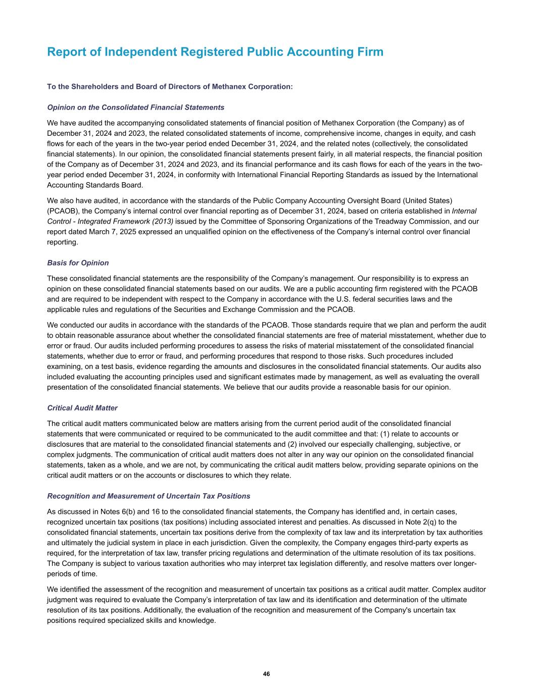 Report of Independent Registered Public Accounting Firm To the Shareholders and Board of Directors of Methanex Corporation: Opinion on the Consolidated Financial Statements We have audited the accompanying consolidated statements of financial position of Methanex Corporation (the Company) as of December 31, 2024 and 2023, the related consolidated statements of income, comprehensive income, changes in equity, and cash flows for each of the years in the two-year period ended December 31, 2024, and the related notes (collectively, the consolidated financial statements). In our opinion, the consolidated financial statements present fairly, in all material respects, the financial position of the Company as of December 31, 2024 and 2023, and its financial performance and its cash flows for each of the years in the two- year period ended December 31, 2024, in conformity with International Financial Reporting Standards as issued by the International Accounting Standards Board. We also have audited, in accordance with the standards of the Public Company Accounting Oversight Board (United States) (PCAOB), the Company’s internal control over financial reporting as of December 31, 2024, based on criteria established in Internal Control - Integrated Framework (2013) issued by the Committee of Sponsoring Organizations of the Treadway Commission, and our report dated March 7, 2025 expressed an unqualified opinion on the effectiveness of the Company’s internal control over financial reporting. Basis for Opinion These consolidated financial statements are the responsibility of the Company’s management. Our responsibility is to express an opinion on these consolidated financial statements based on our audits. We are a public accounting firm registered with the PCAOB and are required to be independent with respect to the Company in accordance with the U.S. federal securities laws and the applicable rules and regulations of the Securities and Exchange Commission and the PCAOB. We conducted our audits in accordance with the standards of the PCAOB. Those standards require that we plan and perform the audit to obtain reasonable assurance about whether the consolidated financial statements are free of material misstatement, whether due to error or fraud. Our audits included performing procedures to assess the risks of material misstatement of the consolidated financial statements, whether due to error or fraud, and performing procedures that respond to those risks. Such procedures included examining, on a test basis, evidence regarding the amounts and disclosures in the consolidated financial statements. Our audits also included evaluating the accounting principles used and significant estimates made by management, as well as evaluating the overall presentation of the consolidated financial statements. We believe that our audits provide a reasonable basis for our opinion. Critical Audit Matter The critical audit matters communicated below are matters arising from the current period audit of the consolidated financial statements that were communicated or required to be communicated to the audit committee and that: (1) relate to accounts or disclosures that are material to the consolidated financial statements and (2) involved our especially challenging, subjective, or complex judgments. The communication of critical audit matters does not alter in any way our opinion on the consolidated financial statements, taken as a whole, and we are not, by communicating the critical audit matters below, providing separate opinions on the critical audit matters or on the accounts or disclosures to which they relate. Recognition and Measurement of Uncertain Tax Positions As discussed in Notes 6(b) and 16 to the consolidated financial statements, the Company has identified and, in certain cases, recognized uncertain tax positions (tax positions) including associated interest and penalties. As discussed in Note 2(q) to the consolidated financial statements, uncertain tax positions derive from the complexity of tax law and its interpretation by tax authorities and ultimately the judicial system in place in each jurisdiction. Given the complexity, the Company engages third-party experts as required, for the interpretation of tax law, transfer pricing regulations and determination of the ultimate resolution of its tax positions. The Company is subject to various taxation authorities who may interpret tax legislation differently, and resolve matters over longer- periods of time. We identified the assessment of the recognition and measurement of uncertain tax positions as a critical audit matter. Complex auditor judgment was required to evaluate the Company’s interpretation of tax law and its identification and determination of the ultimate resolution of its tax positions. Additionally, the evaluation of the recognition and measurement of the Company's uncertain tax positions required specialized skills and knowledge. 46