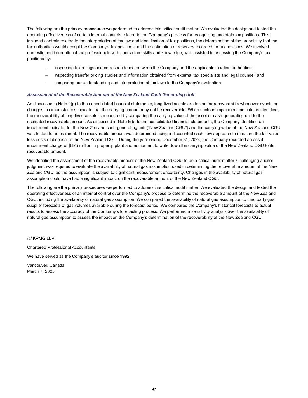 The following are the primary procedures we performed to address this critical audit matter. We evaluated the design and tested the operating effectiveness of certain internal controls related to the Company's process for recognizing uncertain tax positions. This included controls related to the interpretation of tax law and identification of tax positions, the determination of the probability that the tax authorities would accept the Company's tax positions, and the estimation of reserves recorded for tax positions. We involved domestic and international tax professionals with specialized skills and knowledge, who assisted in assessing the Company's tax positions by: – inspecting tax rulings and correspondence between the Company and the applicable taxation authorities; – inspecting transfer pricing studies and information obtained from external tax specialists and legal counsel; and – comparing our understanding and interpretation of tax laws to the Company's evaluation. Assessment of the Recoverable Amount of the New Zealand Cash Generating Unit As discussed in Note 2(g) to the consolidated financial statements, long-lived assets are tested for recoverability whenever events or changes in circumstances indicate that the carrying amount may not be recoverable. When such an impairment indicator is identified, the recoverability of long-lived assets is measured by comparing the carrying value of the asset or cash-generating unit to the estimated recoverable amount. As discussed in Note 5(b) to the consolidated financial statements, the Company identified an impairment indicator for the New Zealand cash-generating unit (“New Zealand CGU”) and the carrying value of the New Zealand CGU was tested for impairment. The recoverable amount was determined using a discounted cash flow approach to measure the fair value less costs of disposal of the New Zealand CGU. During the year ended December 31, 2024, the Company recorded an asset impairment charge of $125 million in property, plant and equipment to write down the carrying value of the New Zealand CGU to its recoverable amount. We identified the assessment of the recoverable amount of the New Zealand CGU to be a critical audit matter. Challenging auditor judgment was required to evaluate the availability of natural gas assumption used in determining the recoverable amount of the New Zealand CGU, as the assumption is subject to significant measurement uncertainty. Changes in the availability of natural gas assumption could have had a significant impact on the recoverable amount of the New Zealand CGU. The following are the primary procedures we performed to address this critical audit matter. We evaluated the design and tested the operating effectiveness of an internal control over the Company's process to determine the recoverable amount of the New Zealand CGU, including the availability of natural gas assumption. We compared the availability of natural gas assumption to third party gas supplier forecasts of gas volumes available during the forecast period. We compared the Company’s historical forecasts to actual results to assess the accuracy of the Company’s forecasting process. We performed a sensitivity analysis over the availability of natural gas assumption to assess the impact on the Company’s determination of the recoverability of the New Zealand CGU. /s/ KPMG LLP Chartered Professional Accountants We have served as the Company's auditor since 1992. Vancouver, Canada March 7, 2025 47