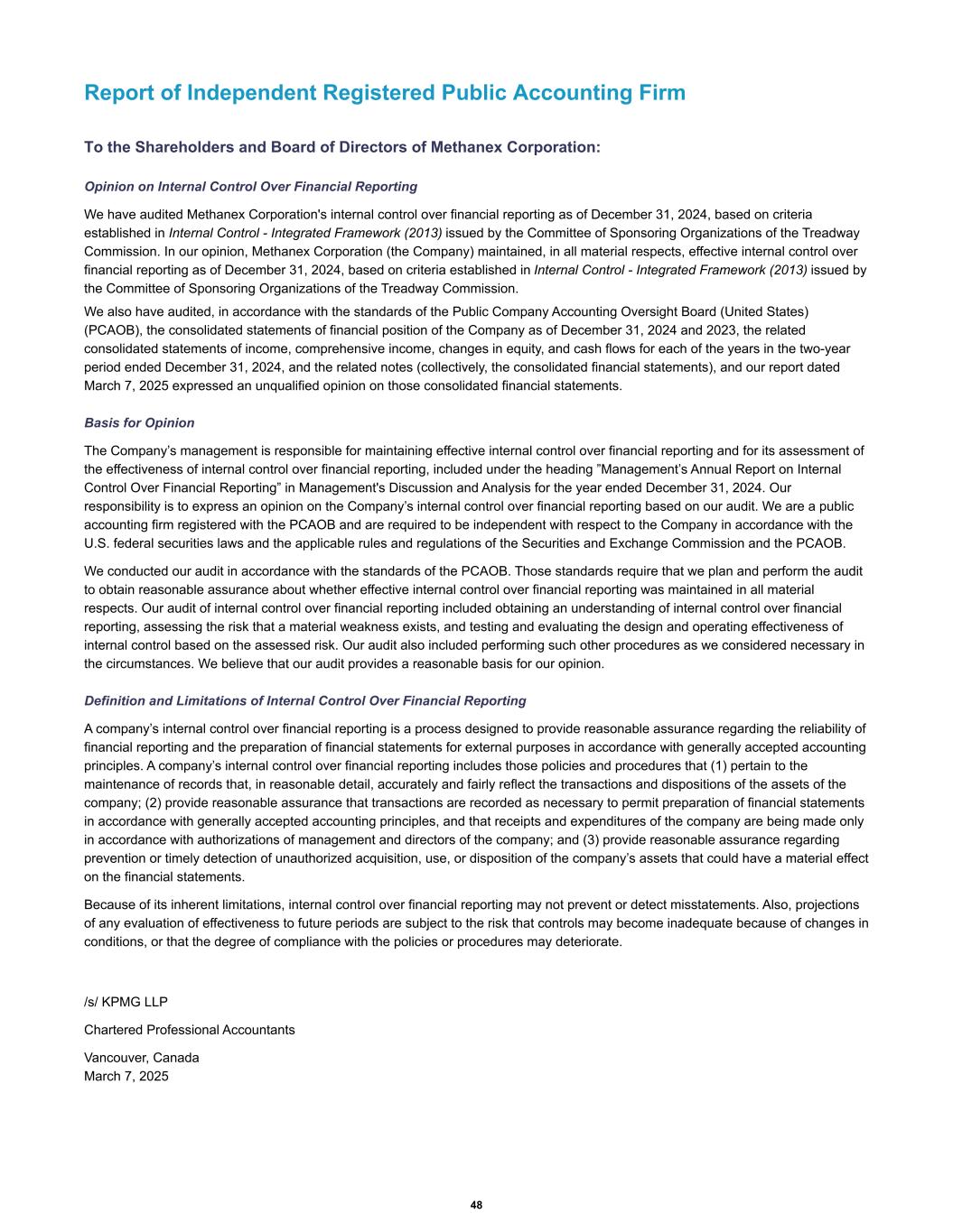Report of Independent Registered Public Accounting Firm To the Shareholders and Board of Directors of Methanex Corporation: Opinion on Internal Control Over Financial Reporting We have audited Methanex Corporation's internal control over financial reporting as of December 31, 2024, based on criteria established in Internal Control - Integrated Framework (2013) issued by the Committee of Sponsoring Organizations of the Treadway Commission. In our opinion, Methanex Corporation (the Company) maintained, in all material respects, effective internal control over financial reporting as of December 31, 2024, based on criteria established in Internal Control - Integrated Framework (2013) issued by the Committee of Sponsoring Organizations of the Treadway Commission. We also have audited, in accordance with the standards of the Public Company Accounting Oversight Board (United States) (PCAOB), the consolidated statements of financial position of the Company as of December 31, 2024 and 2023, the related consolidated statements of income, comprehensive income, changes in equity, and cash flows for each of the years in the two-year period ended December 31, 2024, and the related notes (collectively, the consolidated financial statements), and our report dated March 7, 2025 expressed an unqualified opinion on those consolidated financial statements. Basis for Opinion The Company’s management is responsible for maintaining effective internal control over financial reporting and for its assessment of the effectiveness of internal control over financial reporting, included under the heading ”Management’s Annual Report on Internal Control Over Financial Reporting” in Management's Discussion and Analysis for the year ended December 31, 2024. Our responsibility is to express an opinion on the Company’s internal control over financial reporting based on our audit. We are a public accounting firm registered with the PCAOB and are required to be independent with respect to the Company in accordance with the U.S. federal securities laws and the applicable rules and regulations of the Securities and Exchange Commission and the PCAOB. We conducted our audit in accordance with the standards of the PCAOB. Those standards require that we plan and perform the audit to obtain reasonable assurance about whether effective internal control over financial reporting was maintained in all material respects. Our audit of internal control over financial reporting included obtaining an understanding of internal control over financial reporting, assessing the risk that a material weakness exists, and testing and evaluating the design and operating effectiveness of internal control based on the assessed risk. Our audit also included performing such other procedures as we considered necessary in the circumstances. We believe that our audit provides a reasonable basis for our opinion. Definition and Limitations of Internal Control Over Financial Reporting A company’s internal control over financial reporting is a process designed to provide reasonable assurance regarding the reliability of financial reporting and the preparation of financial statements for external purposes in accordance with generally accepted accounting principles. A company’s internal control over financial reporting includes those policies and procedures that (1) pertain to the maintenance of records that, in reasonable detail, accurately and fairly reflect the transactions and dispositions of the assets of the company; (2) provide reasonable assurance that transactions are recorded as necessary to permit preparation of financial statements in accordance with generally accepted accounting principles, and that receipts and expenditures of the company are being made only in accordance with authorizations of management and directors of the company; and (3) provide reasonable assurance regarding prevention or timely detection of unauthorized acquisition, use, or disposition of the company’s assets that could have a material effect on the financial statements. Because of its inherent limitations, internal control over financial reporting may not prevent or detect misstatements. Also, projections of any evaluation of effectiveness to future periods are subject to the risk that controls may become inadequate because of changes in conditions, or that the degree of compliance with the policies or procedures may deteriorate. /s/ KPMG LLP Chartered Professional Accountants Vancouver, Canada March 7, 2025 48