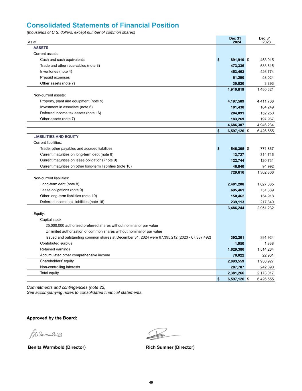 Consolidated Statements of Financial Position (thousands of U.S. dollars, except number of common shares) ASSETS Current assets: Cash and cash equivalents $ 891,910 $ 458,015 Trade and other receivables (note 3) 473,336 533,615 Inventories (note 4) 453,463 426,774 Prepaid expenses 61,290 58,024 Other assets (note 7) 30,820 3,893 1,910,819 1,480,321 Non-current assets: Property, plant and equipment (note 5) 4,197,509 4,411,768 Investment in associate (note 6) 101,438 184,249 Deferred income tax assets (note 16) 204,091 152,250 Other assets (note 7) 183,269 197,967 4,686,307 4,946,234 $ 6,597,126 $ 6,426,555 LIABILITIES AND EQUITY Current liabilities: Trade, other payables and accrued liabilities $ 546,305 $ 771,867 Current maturities on long-term debt (note 8) 13,727 314,716 Current maturities on lease obligations (note 9) 122,744 120,731 Current maturities on other long-term liabilities (note 10) 46,840 94,992 729,616 1,302,306 Non-current liabilities: Long-term debt (note 8) 2,401,208 1,827,085 Lease obligations (note 9) 695,461 751,389 Other long-term liabilities (note 10) 150,462 154,918 Deferred income tax liabilities (note 16) 239,113 217,840 3,486,244 2,951,232 Equity: Capital stock 25,000,000 authorized preferred shares without nominal or par value Unlimited authorization of common shares without nominal or par value Issued and outstanding common shares at December 31, 2024 were 67,395,212 (2023 - 67,387,492) 392,201 391,924 Contributed surplus 1,950 1,838 Retained earnings 1,629,386 1,514,264 Accumulated other comprehensive income 70,022 22,901 Shareholders’ equity 2,093,559 1,930,927 Non-controlling interests 287,707 242,090 Total equity 2,381,266 2,173,017 $ 6,597,126 $ 6,426,555 As at Dec 31 2024 Dec 31 2023 Commitments and contingencies (note 22) See accompanying notes to consolidated financial statements. Approved by the Board: Benita Warmbold (Director) Rich Sumner (Director) 49