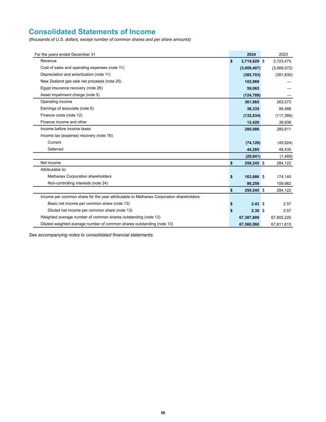 Consolidated Statements of Income (thousands of U.S. dollars, except number of common shares and per share amounts) Revenue $ 3,719,829 $ 3,723,475 Cost of sales and operating expenses (note 11) (3,009,407) (3,068,072) Depreciation and amortization (note 11) (385,703) (391,830) New Zealand gas sale net proceeds (note 25) 102,969 — Egypt insurance recovery (note 26) 59,065 — Asset impairment charge (note 5) (124,788) — Operating income 361,965 263,573 Earnings of associate (note 6) 38,335 99,466 Finance costs (note 12) (132,634) (117,366) Finance income and other 12,420 39,938 Income before income taxes 280,086 285,611 Income tax (expense) recovery (note 16): Current (74,126) (49,924) Deferred 44,285 48,435 (29,841) (1,489) Net income $ 250,245 $ 284,122 Attributable to: Methanex Corporation shareholders $ 163,986 $ 174,140 Non-controlling interests (note 24) 86,259 109,982 $ 250,245 $ 284,122 Income per common share for the year attributable to Methanex Corporation shareholders: Basic net income per common share (note 13) $ 2.43 $ 2.57 Diluted net income per common share (note 13) $ 2.39 $ 2.57 Weighted average number of common shares outstanding (note 13) 67,387,809 67,805,220 Diluted weighted average number of common shares outstanding (note 13) 67,560,060 67,811,615 For the years ended December 31 2024 2023 See accompanying notes to consolidated financial statements. 50