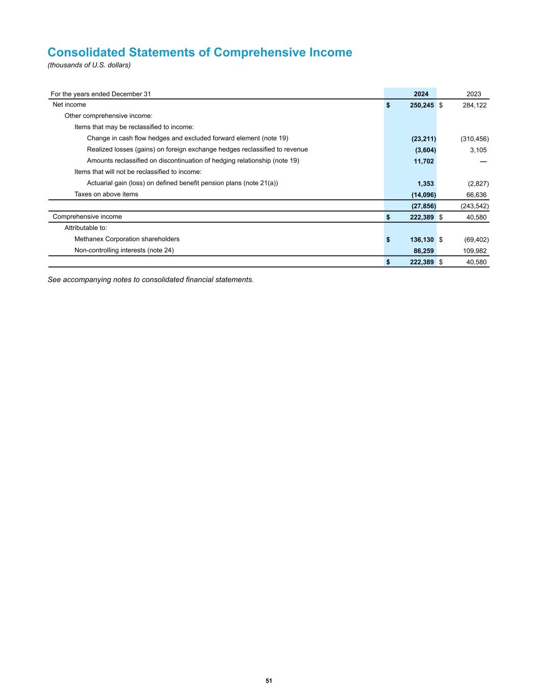 Consolidated Statements of Comprehensive Income (thousands of U.S. dollars) Net income $ 250,245 $ 284,122 Other comprehensive income: Items that may be reclassified to income: Change in cash flow hedges and excluded forward element (note 19) (23,211) (310,456) Realized losses (gains) on foreign exchange hedges reclassified to revenue (3,604) 3,105 Amounts reclassified on discontinuation of hedging relationship (note 19) 11,702 — Items that will not be reclassified to income: Actuarial gain (loss) on defined benefit pension plans (note 21(a)) 1,353 (2,827) Taxes on above items (14,096) 66,636 (27,856) (243,542) Comprehensive income $ 222,389 $ 40,580 Attributable to: Methanex Corporation shareholders $ 136,130 $ (69,402) Non-controlling interests (note 24) 86,259 109,982 $ 222,389 $ 40,580 For the years ended December 31 2024 2023 See accompanying notes to consolidated financial statements. 51