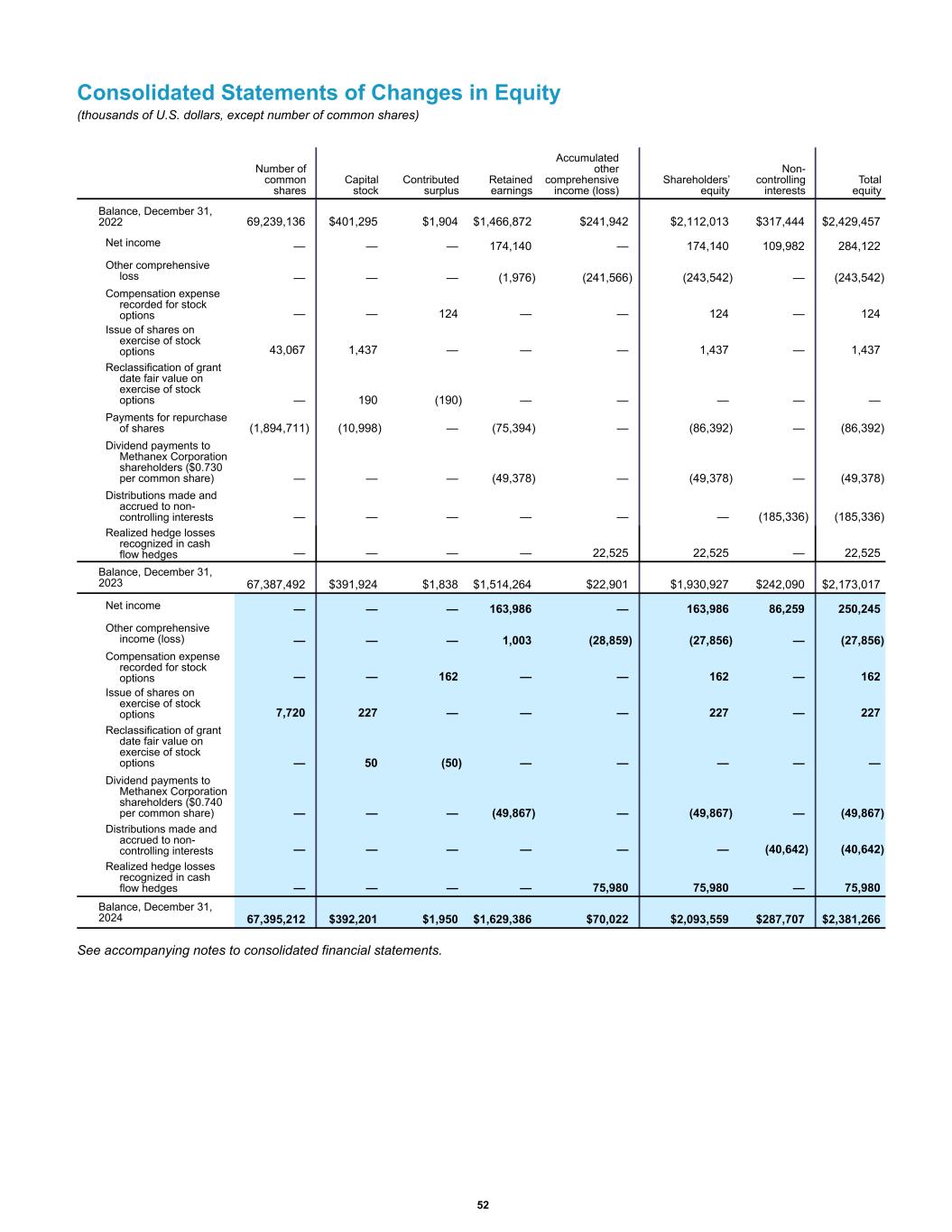 Consolidated Statements of Changes in Equity (thousands of U.S. dollars, except number of common shares) Balance, December 31, 2022 69,239,136 $401,295 $1,904 $1,466,872 $241,942 $2,112,013 $317,444 $2,429,457 Net income — — — 174,140 — 174,140 109,982 284,122 Other comprehensive loss — — — (1,976) (241,566) (243,542) — (243,542) Compensation expense recorded for stock options — — 124 — — 124 — 124 Issue of shares on exercise of stock options 43,067 1,437 — — — 1,437 — 1,437 Reclassification of grant date fair value on exercise of stock options — 190 (190) — — — — — Payments for repurchase of shares (1,894,711) (10,998) — (75,394) — (86,392) — (86,392) Dividend payments to Methanex Corporation shareholders ($0.730 per common share) — — — (49,378) — (49,378) — (49,378) Distributions made and accrued to non- controlling interests — — — — — — (185,336) (185,336) Realized hedge losses recognized in cash flow hedges — — — — 22,525 22,525 — 22,525 Balance, December 31, 2023 67,387,492 $391,924 $1,838 $1,514,264 $22,901 $1,930,927 $242,090 $2,173,017 Net income — — — 163,986 — 163,986 86,259 250,245 Other comprehensive income (loss) — — — 1,003 (28,859) (27,856) — (27,856) Compensation expense recorded for stock options — — 162 — — 162 — 162 Issue of shares on exercise of stock options 7,720 227 — — — 227 — 227 Reclassification of grant date fair value on exercise of stock options — 50 (50) — — — — — Dividend payments to Methanex Corporation shareholders ($0.740 per common share) — — — (49,867) — (49,867) — (49,867) Distributions made and accrued to non- controlling interests — — — — — — (40,642) (40,642) Realized hedge losses recognized in cash flow hedges — — — — 75,980 75,980 — 75,980 Balance, December 31, 2024 67,395,212 $392,201 $1,950 $1,629,386 $70,022 $2,093,559 $287,707 $2,381,266 Number of common shares Capital stock Contributed surplus Retained earnings Accumulated other comprehensive income (loss) Shareholders’ equity Non- controlling interests Total equity See accompanying notes to consolidated financial statements. 52