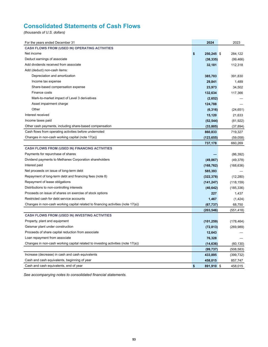 Consolidated Statements of Cash Flows (thousands of U.S. dollars) CASH FLOWS FROM (USED IN) OPERATING ACTIVITIES Net income $ 250,245 $ 284,122 Deduct earnings of associate (38,335) (99,466) Add dividends received from associate 32,181 112,318 Add (deduct) non-cash items: Depreciation and amortization 385,703 391,830 Income tax expense 29,841 1,489 Share-based compensation expense 23,973 34,502 Finance costs 132,634 117,366 Mark-to-market impact of Level 3 derivatives (2,652) — Asset impairment charge 124,788 — Other (6,316) (24,651) Interest received 15,120 21,633 Income taxes paid (52,544) (81,922) Other cash payments, including share-based compensation (33,805) (37,894) Cash flows from operating activities before undernoted 860,833 719,327 Changes in non-cash working capital (note 17(a)) (123,655) (59,058) 737,178 660,269 CASH FLOWS FROM (USED IN) FINANCING ACTIVITIES Payments for repurchase of shares — (86,392) Dividend payments to Methanex Corporation shareholders (49,867) (49,378) Interest paid (168,762) (168,636) Net proceeds on issue of long-term debt 585,393 — Repayment of long-term debt and financing fees (note 8) (322,378) (12,280) Repayment of lease obligations (141,247) (118,159) Distributions to non-controlling interests (40,642) (185,336) Proceeds on issue of shares on exercise of stock options 227 1,437 Restricted cash for debt service accounts 1,467 (1,424) Changes in non-cash working capital related to financing activities (note 17(a)) (67,737) 68,750 (203,546) (551,418) CASH FLOWS FROM (USED IN) INVESTING ACTIVITIES Property, plant and equipment (101,259) (178,464) Geismar plant under construction (72,813) (269,989) Proceeds of share capital reduction from associate 12,643 — Loan repayment from associate 76,328 — Changes in non-cash working capital related to investing activities (note 17(a)) (14,636) (60,130) (99,737) (508,583) Increase (decrease) in cash and cash equivalents 433,895 (399,732) Cash and cash equivalents, beginning of year 458,015 857,747 Cash and cash equivalents, end of year $ 891,910 $ 458,015 For the years ended December 31 2024 2023 See accompanying notes to consolidated financial statements. 53