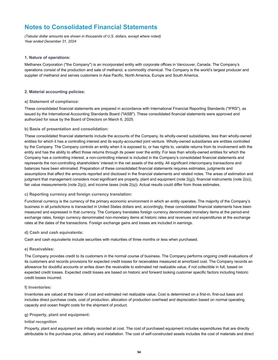 Notes to Consolidated Financial Statements (Tabular dollar amounts are shown in thousands of U.S. dollars, except where noted) Year ended December 31, 2024 1. Nature of operations: Methanex Corporation ("the Company") is an incorporated entity with corporate offices in Vancouver, Canada. The Company’s operations consist of the production and sale of methanol, a commodity chemical. The Company is the world’s largest producer and supplier of methanol and serves customers in Asia Pacific, North America, Europe and South America. 2. Material accounting policies: a) Statement of compliance: These consolidated financial statements are prepared in accordance with International Financial Reporting Standards ("IFRS"), as issued by the International Accounting Standards Board ("IASB"). These consolidated financial statements were approved and authorized for issue by the Board of Directors on March 6, 2025. b) Basis of presentation and consolidation: These consolidated financial statements include the accounts of the Company, its wholly-owned subsidiaries, less than wholly-owned entities for which it has a controlling interest and its equity-accounted joint venture. Wholly-owned subsidiaries are entities controlled by the Company. The Company controls an entity when it is exposed to, or has rights to, variable returns from its involvement with the entity and has the ability to affect those returns through its power over the entity. For less than wholly-owned entities for which the Company has a controlling interest, a non-controlling interest is included in the Company’s consolidated financial statements and represents the non-controlling shareholders’ interest in the net assets of the entity. All significant intercompany transactions and balances have been eliminated. Preparation of these consolidated financial statements requires estimates, judgments and assumptions that affect the amounts reported and disclosed in the financial statements and related notes. The areas of estimation and judgment that management considers most significant are property, plant and equipment (note 2(g)), financial instruments (note 2(o)), fair value measurements (note 2(p)), and income taxes (note 2(q)). Actual results could differ from those estimates. c) Reporting currency and foreign currency translation: Functional currency is the currency of the primary economic environment in which an entity operates. The majority of the Company’s business in all jurisdictions is transacted in United States dollars and, accordingly, these consolidated financial statements have been measured and expressed in that currency. The Company translates foreign currency denominated monetary items at the period-end exchange rates, foreign currency denominated non-monetary items at historic rates and revenues and expenditures at the exchange rates at the dates of the transactions. Foreign exchange gains and losses are included in earnings. d) Cash and cash equivalents: Cash and cash equivalents include securities with maturities of three months or less when purchased. e) Receivables: The Company provides credit to its customers in the normal course of business. The Company performs ongoing credit evaluations of its customers and records provisions for expected credit losses for receivables measured at amortized cost. The Company records an allowance for doubtful accounts or writes down the receivable to estimated net realizable value, if not collectible in full, based on expected credit losses. Expected credit losses are based on historic and forward looking customer specific factors including historic credit losses incurred. f) Inventories: Inventories are valued at the lower of cost and estimated net realizable value. Cost is determined on a first-in, first-out basis and includes direct purchase costs, cost of production, allocation of production overhead and depreciation based on normal operating capacity and ocean freight costs for the shipment of product. g) Property, plant and equipment: Initial recognition Property, plant and equipment are initially recorded at cost. The cost of purchased equipment includes expenditures that are directly attributable to the purchase price, delivery and installation. The cost of self-constructed assets includes the cost of materials and direct 54