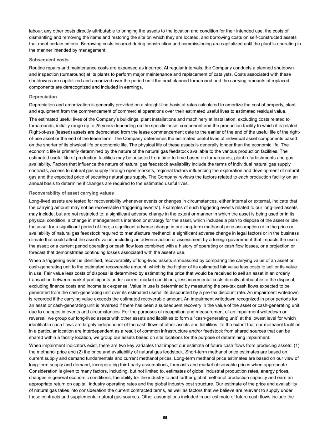 labour, any other costs directly attributable to bringing the assets to the location and condition for their intended use, the costs of dismantling and removing the items and restoring the site on which they are located, and borrowing costs on self-constructed assets that meet certain criteria. Borrowing costs incurred during construction and commissioning are capitalized until the plant is operating in the manner intended by management. Subsequent costs Routine repairs and maintenance costs are expensed as incurred. At regular intervals, the Company conducts a planned shutdown and inspection (turnaround) at its plants to perform major maintenance and replacement of catalysts. Costs associated with these shutdowns are capitalized and amortized over the period until the next planned turnaround and the carrying amounts of replaced components are derecognized and included in earnings. Depreciation Depreciation and amortization is generally provided on a straight-line basis at rates calculated to amortize the cost of property, plant and equipment from the commencement of commercial operations over their estimated useful lives to estimated residual value. The estimated useful lives of the Company’s buildings, plant installations and machinery at installation, excluding costs related to turnarounds, initially range up to 25 years depending on the specific asset component and the production facility to which it is related. Right-of-use (leased) assets are depreciated from the lease commencement date to the earlier of the end of the useful life of the right- of-use asset or the end of the lease term. The Company determines the estimated useful lives of individual asset components based on the shorter of its physical life or economic life. The physical life of these assets is generally longer than the economic life. The economic life is primarily determined by the nature of the natural gas feedstock available to the various production facilities. The estimated useful life of production facilities may be adjusted from time-to-time based on turnarounds, plant refurbishments and gas availability. Factors that influence the nature of natural gas feedstock availability include the terms of individual natural gas supply contracts, access to natural gas supply through open markets, regional factors influencing the exploration and development of natural gas and the expected price of securing natural gas supply. The Company reviews the factors related to each production facility on an annual basis to determine if changes are required to the estimated useful lives. Recoverability of asset carrying values Long-lived assets are tested for recoverability whenever events or changes in circumstances, either internal or external, indicate that the carrying amount may not be recoverable (“triggering events”). Examples of such triggering events related to our long-lived assets may include, but are not restricted to: a significant adverse change in the extent or manner in which the asset is being used or in its physical condition; a change in management’s intention or strategy for the asset, which includes a plan to dispose of the asset or idle the asset for a significant period of time; a significant adverse change in our long-term methanol price assumption or in the price or availability of natural gas feedstock required to manufacture methanol; a significant adverse change in legal factors or in the business climate that could affect the asset’s value, including an adverse action or assessment by a foreign government that impacts the use of the asset; or a current period operating or cash flow loss combined with a history of operating or cash flow losses, or a projection or forecast that demonstrates continuing losses associated with the asset’s use. When a triggering event is identified, recoverability of long-lived assets is measured by comparing the carrying value of an asset or cash-generating unit to the estimated recoverable amount, which is the higher of its estimated fair value less costs to sell or its value in use. Fair value less costs of disposal is determined by estimating the price that would be received to sell an asset in an orderly transaction between market participants under current market conditions, less incremental costs directly attributable to the disposal, excluding finance costs and income tax expense. Value in use is determined by measuring the pre-tax cash flows expected to be generated from the cash-generating unit over its estimated useful life discounted by a pre-tax discount rate. An impairment writedown is recorded if the carrying value exceeds the estimated recoverable amount. An impairment writedown recognized in prior periods for an asset or cash-generating unit is reversed if there has been a subsequent recovery in the value of the asset or cash-generating unit due to changes in events and circumstances. For the purposes of recognition and measurement of an impairment writedown or reversal, we group our long-lived assets with other assets and liabilities to form a “cash-generating unit” at the lowest level for which identifiable cash flows are largely independent of the cash flows of other assets and liabilities. To the extent that our methanol facilities in a particular location are interdependent as a result of common infrastructure and/or feedstock from shared sources that can be shared within a facility location, we group our assets based on site locations for the purpose of determining impairment. When impairment indicators exist, there are two key variables that impact our estimate of future cash flows from producing assets: (1) the methanol price and (2) the price and availability of natural gas feedstock. Short-term methanol price estimates are based on current supply and demand fundamentals and current methanol prices. Long-term methanol price estimates are based on our view of long-term supply and demand, incorporating third-party assumptions, foreca