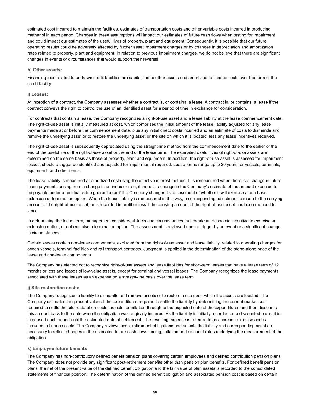 estimated cost incurred to maintain the facilities, estimates of transportation costs and other variable costs incurred in producing methanol in each period. Changes in these assumptions will impact our estimates of future cash flows when testing for impairment and could impact our estimates of the useful lives of property, plant and equipment. Consequently, it is possible that our future operating results could be adversely affected by further asset impairment charges or by changes in depreciation and amortization rates related to property, plant and equipment. In relation to previous impairment charges, we do not believe that there are significant changes in events or circumstances that would support their reversal. h) Other assets: Financing fees related to undrawn credit facilities are capitalized to other assets and amortized to finance costs over the term of the credit facility. i) Leases: At inception of a contract, the Company assesses whether a contract is, or contains, a lease. A contract is, or contains, a lease if the contract conveys the right to control the use of an identified asset for a period of time in exchange for consideration. For contracts that contain a lease, the Company recognizes a right-of-use asset and a lease liability at the lease commencement date. The right-of-use asset is initially measured at cost, which comprises the initial amount of the lease liability adjusted for any lease payments made at or before the commencement date, plus any initial direct costs incurred and an estimate of costs to dismantle and remove the underlying asset or to restore the underlying asset or the site on which it is located, less any lease incentives received. The right-of-use asset is subsequently depreciated using the straight-line method from the commencement date to the earlier of the end of the useful life of the right-of-use asset or the end of the lease term. The estimated useful lives of right-of-use assets are determined on the same basis as those of property, plant and equipment. In addition, the right-of-use asset is assessed for impairment losses, should a trigger be identified and adjusted for impairment if required. Lease terms range up to 20 years for vessels, terminals, equipment, and other items. The lease liability is measured at amortized cost using the effective interest method. It is remeasured when there is a change in future lease payments arising from a change in an index or rate, if there is a change in the Company’s estimate of the amount expected to be payable under a residual value guarantee or if the Company changes its assessment of whether it will exercise a purchase, extension or termination option. When the lease liability is remeasured in this way, a corresponding adjustment is made to the carrying amount of the right-of-use asset, or is recorded in profit or loss if the carrying amount of the right-of-use asset has been reduced to zero. In determining the lease term, management considers all facts and circumstances that create an economic incentive to exercise an extension option, or not exercise a termination option. The assessment is reviewed upon a trigger by an event or a significant change in circumstances. Certain leases contain non-lease components, excluded from the right-of-use asset and lease liability, related to operating charges for ocean vessels, terminal facilities and rail transport contracts. Judgment is applied in the determination of the stand-alone price of the lease and non-lease components. The Company has elected not to recognize right-of-use assets and lease liabilities for short-term leases that have a lease term of 12 months or less and leases of low-value assets, except for terminal and vessel leases. The Company recognizes the lease payments associated with these leases as an expense on a straight-line basis over the lease term. j) Site restoration costs: The Company recognizes a liability to dismantle and remove assets or to restore a site upon which the assets are located. The Company estimates the present value of the expenditures required to settle the liability by determining the current market cost required to settle the site restoration costs, adjusts for inflation through to the expected date of the expenditures and then discounts this amount back to the date when the obligation was originally incurred. As the liability is initially recorded on a discounted basis, it is increased each period until the estimated date of settlement. The resulting expense is referred to as accretion expense and is included in finance costs. The Company reviews asset retirement obligations and adjusts the liability and corresponding asset as necessary to reflect changes in the estimated future cash flows, timing, inflation and discount rates underlying the measurement of the obligation. k) Employee future benefits: The Company has non-contributory defined benefit pension plans covering certain employees and defined contribution pension plans. The Company does not provide any significant post-retirement benefits other than pension plan benefits. For defined benefit pension plans, the net of the present value of the defined benefit obligation and the fair value of plan assets is recorded to the consolidated statements of financial position. The determination of the defined benefit obligation and associated pension cost is based on certain 56