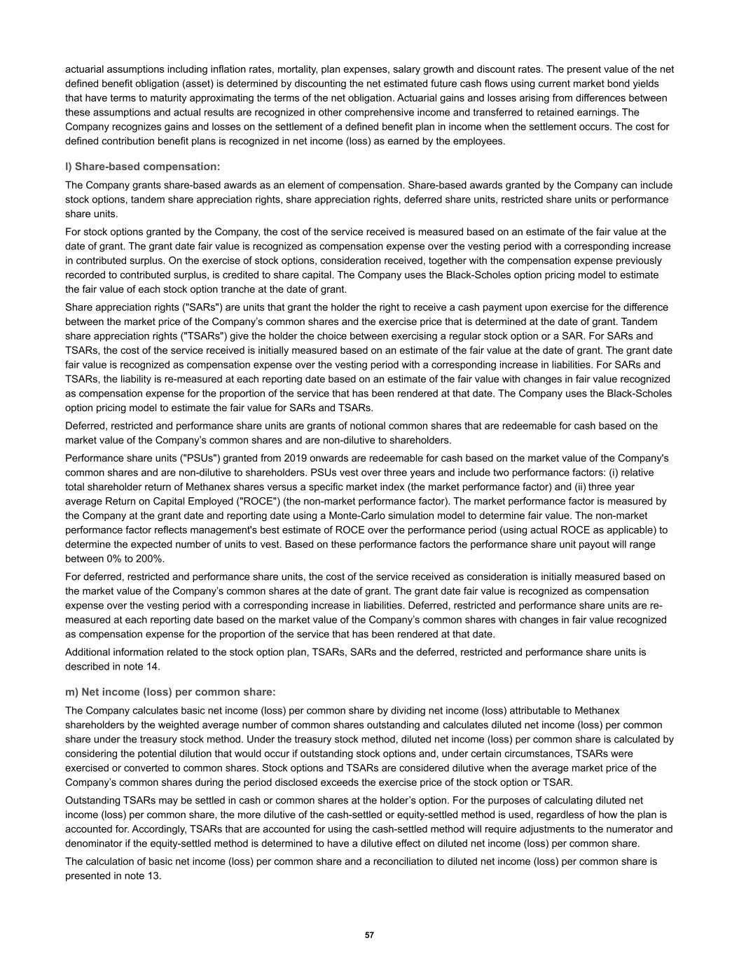 actuarial assumptions including inflation rates, mortality, plan expenses, salary growth and discount rates. The present value of the net defined benefit obligation (asset) is determined by discounting the net estimated future cash flows using current market bond yields that have terms to maturity approximating the terms of the net obligation. Actuarial gains and losses arising from differences between these assumptions and actual results are recognized in other comprehensive income and transferred to retained earnings. The Company recognizes gains and losses on the settlement of a defined benefit plan in income when the settlement occurs. The cost for defined contribution benefit plans is recognized in net income (loss) as earned by the employees. l) Share-based compensation: The Company grants share-based awards as an element of compensation. Share-based awards granted by the Company can include stock options, tandem share appreciation rights, share appreciation rights, deferred share units, restricted share units or performance share units. For stock options granted by the Company, the cost of the service received is measured based on an estimate of the fair value at the date of grant. The grant date fair value is recognized as compensation expense over the vesting period with a corresponding increase in contributed surplus. On the exercise of stock options, consideration received, together with the compensation expense previously recorded to contributed surplus, is credited to share capital. The Company uses the Black-Scholes option pricing model to estimate the fair value of each stock option tranche at the date of grant. Share appreciation rights ("SARs") are units that grant the holder the right to receive a cash payment upon exercise for the difference between the market price of the Company’s common shares and the exercise price that is determined at the date of grant. Tandem share appreciation rights ("TSARs") give the holder the choice between exercising a regular stock option or a SAR. For SARs and TSARs, the cost of the service received is initially measured based on an estimate of the fair value at the date of grant. The grant date fair value is recognized as compensation expense over the vesting period with a corresponding increase in liabilities. For SARs and TSARs, the liability is re-measured at each reporting date based on an estimate of the fair value with changes in fair value recognized as compensation expense for the proportion of the service that has been rendered at that date. The Company uses the Black-Scholes option pricing model to estimate the fair value for SARs and TSARs. Deferred, restricted and performance share units are grants of notional common shares that are redeemable for cash based on the market value of the Company’s common shares and are non-dilutive to shareholders. Performance share units ("PSUs") granted from 2019 onwards are redeemable for cash based on the market value of the Company's common shares and are non-dilutive to shareholders. PSUs vest over three years and include two performance factors: (i) relative total shareholder return of Methanex shares versus a specific market index (the market performance factor) and (ii) three year average Return on Capital Employed ("ROCE") (the non-market performance factor). The market performance factor is measured by the Company at the grant date and reporting date using a Monte-Carlo simulation model to determine fair value. The non-market performance factor reflects management's best estimate of ROCE over the performance period (using actual ROCE as applicable) to determine the expected number of units to vest. Based on these performance factors the performance share unit payout will range between 0% to 200%. For deferred, restricted and performance share units, the cost of the service received as consideration is initially measured based on the market value of the Company’s common shares at the date of grant. The grant date fair value is recognized as compensation expense over the vesting period with a corresponding increase in liabilities. Deferred, restricted and performance share units are re- measured at each reporting date based on the market value of the Company’s common shares with changes in fair value recognized as compensation expense for the proportion of the service that has been rendered at that date. Additional information related to the stock option plan, TSARs, SARs and the deferred, restricted and performance share units is described in note 14. m) Net income (loss) per common share: The Company calculates basic net income (loss) per common share by dividing net income (loss) attributable to Methanex shareholders by the weighted average number of common shares outstanding and calculates diluted net income (loss) per common share under the treasury stock method. Under the treasury stock method, diluted net income (loss) per common share is calculated by considering the potential dilution that would occur if outstanding stock options and, under certain circumstances, TSARs were exercised or converted to common shares. Stock options and TSARs are considered dilutive when the average market price of the Company’s common shares during the period disclosed exceeds the exercise price of the stock option or TSAR. Outstanding TSARs may be settled in cash or common shares at the holder’s option. For the purposes of calculating diluted net income (loss) per common share, the more dilutive of the cash-settled or equity-settled method is used, regardless of how the plan is accounted for. Accordingly, TSARs that are accounted for using the cash-settled method will require adjustments to the numerator and denominator if the equity-settled method is determined to have a dilutive effect on diluted net income (loss) per common share. The calculation of basic net income (loss) per common share and a reconciliation to diluted net income (loss) per common share is presented in note 13. 5
