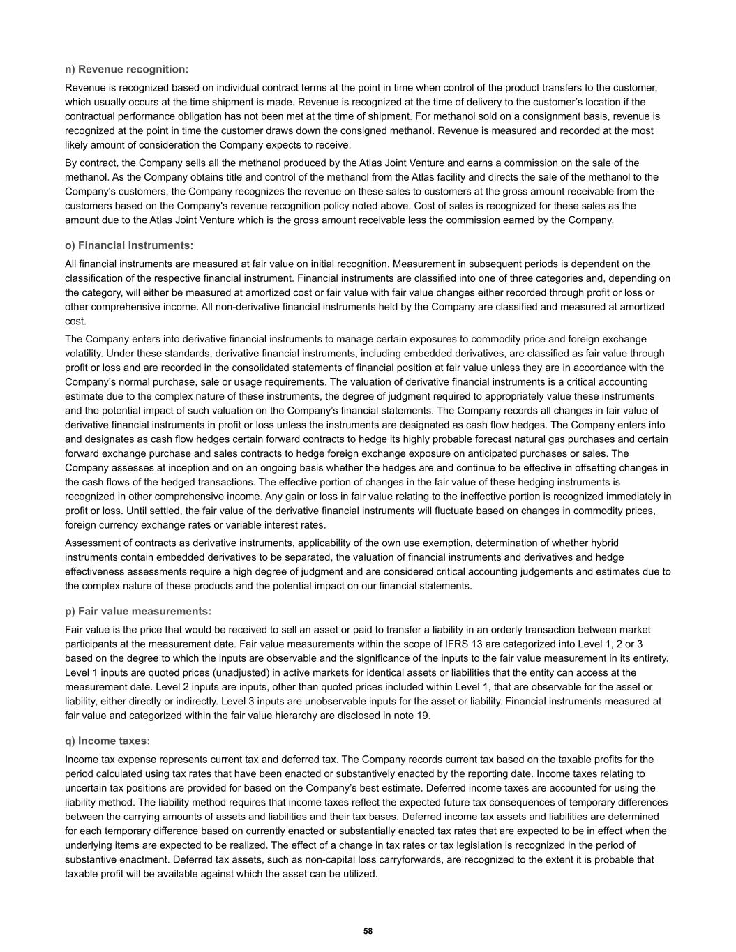 n) Revenue recognition: Revenue is recognized based on individual contract terms at the point in time when control of the product transfers to the customer, which usually occurs at the time shipment is made. Revenue is recognized at the time of delivery to the customer’s location if the contractual performance obligation has not been met at the time of shipment. For methanol sold on a consignment basis, revenue is recognized at the point in time the customer draws down the consigned methanol. Revenue is measured and recorded at the most likely amount of consideration the Company expects to receive. By contract, the Company sells all the methanol produced by the Atlas Joint Venture and earns a commission on the sale of the methanol. As the Company obtains title and control of the methanol from the Atlas facility and directs the sale of the methanol to the Company's customers, the Company recognizes the revenue on these sales to customers at the gross amount receivable from the customers based on the Company's revenue recognition policy noted above. Cost of sales is recognized for these sales as the amount due to the Atlas Joint Venture which is the gross amount receivable less the commission earned by the Company. o) Financial instruments: All financial instruments are measured at fair value on initial recognition. Measurement in subsequent periods is dependent on the classification of the respective financial instrument. Financial instruments are classified into one of three categories and, depending on the category, will either be measured at amortized cost or fair value with fair value changes either recorded through profit or loss or other comprehensive income. All non-derivative financial instruments held by the Company are classified and measured at amortized cost. The Company enters into derivative financial instruments to manage certain exposures to commodity price and foreign exchange volatility. Under these standards, derivative financial instruments, including embedded derivatives, are classified as fair value through profit or loss and are recorded in the consolidated statements of financial position at fair value unless they are in accordance with the Company’s normal purchase, sale or usage requirements. The valuation of derivative financial instruments is a critical accounting estimate due to the complex nature of these instruments, the degree of judgment required to appropriately value these instruments and the potential impact of such valuation on the Company’s financial statements. The Company records all changes in fair value of derivative financial instruments in profit or loss unless the instruments are designated as cash flow hedges. The Company enters into and designates as cash flow hedges certain forward contracts to hedge its highly probable forecast natural gas purchases and certain forward exchange purchase and sales contracts to hedge foreign exchange exposure on anticipated purchases or sales. The Company assesses at inception and on an ongoing basis whether the hedges are and continue to be effective in offsetting changes in the cash flows of the hedged transactions. The effective portion of changes in the fair value of these hedging instruments is recognized in other comprehensive income. Any gain or loss in fair value relating to the ineffective portion is recognized immediately in profit or loss. Until settled, the fair value of the derivative financial instruments will fluctuate based on changes in commodity prices, foreign currency exchange rates or variable interest rates. Assessment of contracts as derivative instruments, applicability of the own use exemption, determination of whether hybrid instruments contain embedded derivatives to be separated, the valuation of financial instruments and derivatives and hedge effectiveness assessments require a high degree of judgment and are considered critical accounting judgements and estimates due to the complex nature of these products and the potential impact on our financial statements. p) Fair value measurements: Fair value is the price that would be received to sell an asset or paid to transfer a liability in an orderly transaction between market participants at the measurement date. Fair value measurements within the scope of IFRS 13 are categorized into Level 1, 2 or 3 based on the degree to which the inputs are observable and the significance of the inputs to the fair value measurement in its entirety. Level 1 inputs are quoted prices (unadjusted) in active markets for identical assets or liabilities that the entity can access at the measurement date. Level 2 inputs are inputs, other than quoted prices included within Level 1, that are observable for the asset or liability, either directly or indirectly. Level 3 inputs are unobservable inputs for the asset or liability. Financial instruments measured at fair value and categorized within the fair value hierarchy are disclosed in note 19. q) Income taxes: Income tax expense represents current tax and deferred tax. The Company records current tax based on the taxable profits for the period calculated using tax rates that have been enacted or substantively enacted by the reporting date. Income taxes relating to uncertain tax positions are provided for based on the Company’s best estimate. Deferred income taxes are accounted for using the liability method. The liability method requires that income taxes reflect the expected future tax consequences of temporary differences between the carrying amounts of assets and liabilities and their tax bases. Deferred income tax assets and liabilities are determined for each temporary difference based on currently enacted or substantially enacted tax rates that are expected to be in effect when the underlying items are expected to be realized. The effect of a change in tax rates or tax legislation is recognized in the period of substantive enactment. Deferred tax assets, such as non-capital loss carryforwards, a