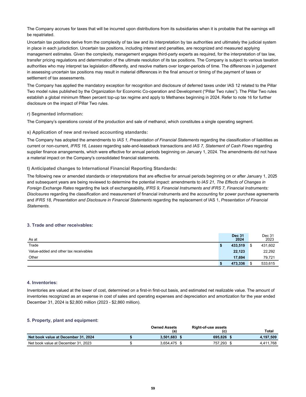 The Company accrues for taxes that will be incurred upon distributions from its subsidiaries when it is probable that the earnings will be repatriated. Uncertain tax positions derive from the complexity of tax law and its interpretation by tax authorities and ultimately the judicial system in place in each jurisdiction. Uncertain tax positions, including interest and penalties, are recognized and measured applying management estimates. Given the complexity, management engages third-party experts as required, for the interpretation of tax law, transfer pricing regulations and determination of the ultimate resolution of its tax positions. The Company is subject to various taxation authorities who may interpret tax legislation differently, and resolve matters over longer-periods of time. The differences in judgement in assessing uncertain tax positions may result in material differences in the final amount or timing of the payment of taxes or settlement of tax assessments. The Company has applied the mandatory exception for recognition and disclosure of deferred taxes under IAS 12 related to the Pillar Two model rules published by the Organization for Economic Co-operation and Development (“Pillar Two rules”). The Pillar Two rules establish a global minimum fifteen percent top-up tax regime and apply to Methanex beginning in 2024. Refer to note 16 for further disclosure on the impact of Pillar Two rules. r) Segmented information: The Company’s operations consist of the production and sale of methanol, which constitutes a single operating segment. s) Application of new and revised accounting standards: The Company has adopted the amendments to IAS 1, Presentation of Financial Statements regarding the classification of liabilities as current or non-current, IFRS 16, Leases regarding sale-and-leaseback transactions and IAS 7, Statement of Cash Flows regarding supplier finance arrangements, which were effective for annual periods beginning on January 1, 2024. The amendments did not have a material impact on the Company's consolidated financial statements. t) Anticipated changes to International Financial Reporting Standards: The following new or amended standards or interpretations that are effective for annual periods beginning on or after January 1, 2025 and subsequent years are being reviewed to determine the potential impact: amendments to IAS 21, The Effects of Changes in Foreign Exchange Rates regarding the lack of exchangeability, IFRS 9, Financial Instruments and IFRS 7, Financial Instruments: Disclosures regarding the classification and measurement of financial instruments and the accounting for power purchase agreements and IFRS 18, Presentation and Disclosure in Financial Statements regarding the replacement of IAS 1, Presentation of Financial Statements. 3. Trade and other receivables: Trade $ 433,519 $ 431,602 Value-added and other tax receivables 22,123 22,292 Other 17,694 79,721 $ 473,336 $ 533,615 As at Dec 31 2024 Dec 31 2023 4. Inventories: Inventories are valued at the lower of cost, determined on a first-in first-out basis, and estimated net realizable value. The amount of inventories recognized as an expense in cost of sales and operating expenses and depreciation and amortization for the year ended December 31, 2024 is $2,800 million (2023 - $2,860 million). 5. Property, plant and equipment: Net book value at December 31, 2024 $ 3,501,683 $ 695,826 $ 4,197,509 Net book value at December 31, 2023 $ 3,654,475 $ 757,293 $ 4,411,768 Owned Assets (a) Right-of-use assets (c) Total 59