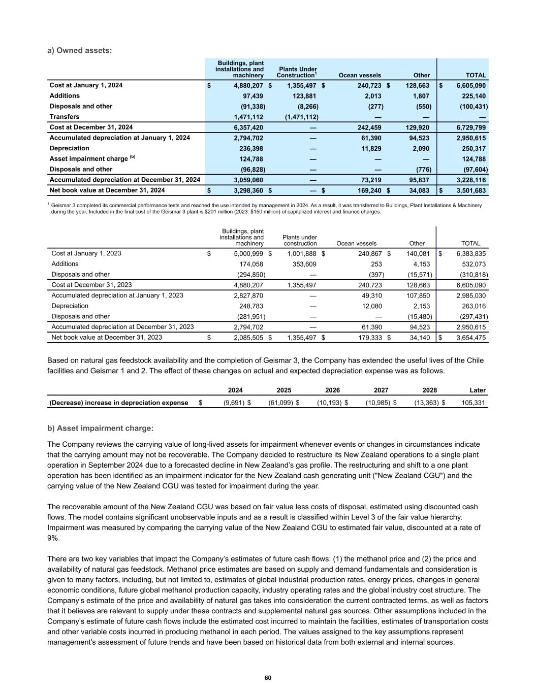 a) Owned assets: Cost at January 1, 2024 $ 4,880,207 $ 1,355,497 $ 240,723 $ 128,663 $ 6,605,090 Additions 97,439 123,881 2,013 1,807 225,140 Disposals and other (91,338) (8,266) (277) (550) (100,431) Transfers 1,471,112 (1,471,112) — — — Cost at December 31, 2024 6,357,420 — 242,459 129,920 6,729,799 Accumulated depreciation at January 1, 2024 2,794,702 — 61,390 94,523 2,950,615 Depreciation 236,398 — 11,829 2,090 250,317 Asset impairment charge (b) 124,788 — — — 124,788 Disposals and other (96,828) — — (776) (97,604) Accumulated depreciation at December 31, 2024 3,059,060 — 73,219 95,837 3,228,116 Net book value at December 31, 2024 $ 3,298,360 $ — $ 169,240 $ 34,083 $ 3,501,683 Buildings, plant installations and machinery Plants Under Construction1 Ocean vessels Other TOTAL 1 Geismar 3 completed its commercial performance tests and reached the use intended by management in 2024. As a result, it was transferred to Buildings, Plant Installations & Machinery during the year. Included in the final cost of the Geismar 3 plant is $201 million (2023: $150 million) of capitalized interest and finance charges. Cost at January 1, 2023 $ 5,000,999 $ 1,001,888 $ 240,867 $ 140,081 $ 6,383,835 Additions 174,058 353,609 253 4,153 532,073 Disposals and other (294,850) — (397) (15,571) (310,818) Cost at December 31, 2023 4,880,207 1,355,497 240,723 128,663 6,605,090 Accumulated depreciation at January 1, 2023 2,827,870 — 49,310 107,850 2,985,030 Depreciation 248,783 — 12,080 2,153 263,016 Disposals and other (281,951) — — (15,480) (297,431) Accumulated depreciation at December 31, 2023 2,794,702 — 61,390 94,523 2,950,615 Net book value at December 31, 2023 $ 2,085,505 $ 1,355,497 $ 179,333 $ 34,140 $ 3,654,475 Buildings, plant installations and machinery Plants under construction Ocean vessels Other TOTAL Based on natural gas feedstock availability and the completion of Geismar 3, the Company has extended the useful lives of the Chile facilities and Geismar 1 and 2. The effect of these changes on actual and expected depreciation expense was as follows. 2024 2025 2026 2027 2028 Later (Decrease) increase in depreciation expense $ (9,691) $ (61,099) $ (10,193) $ (10,985) $ (13,363) $ 105,331 b) Asset impairment charge: The Company reviews the carrying value of long-lived assets for impairment whenever events or changes in circumstances indicate that the carrying amount may not be recoverable. The Company decided to restructure its New Zealand operations to a single plant operation in September 2024 due to a forecasted decline in New Zealand’s gas profile. The restructuring and shift to a one plant operation has been identified as an impairment indicator for the New Zealand cash generating unit ("New Zealand CGU") and the carrying value of the New Zealand CGU was tested for impairment during the year. The recoverable amount of the New Zealand CGU was based on fair value less costs of disposal, estimated using discounted cash flows. The model contains significant unobservable inputs and as a result is classified within Level 3 of the fair value hierarchy. Impairment was measured by comparing the carrying value of the New Zealand CGU to estimated fair value, discounted at a rate of 9%. There are two key variables that impact the Company’s estimates of future cash flows: (1) the methanol price and (2) the price and availability of natural gas feedstock. Methanol price estimates are based on supply and demand fundamentals and consideration is given to many factors, including, but not limited to, estimates of global industrial production rates, energy prices, changes in general economic conditions, future global methanol production capacity, industry operating rates and the global industry cost structure. The Company’s estimate of the price and availability of natural gas takes into consideration the current contracted terms, as well as factors that it believes are relevant to supply under these contracts and supplemental natural gas sources. Other assumptions included in the Company’s estimate of future cash flows include the estimated cost incurred to maintain the facilities, estimates of transportation costs and other variable costs incurred in producing methanol in each period. The values assigned to the key assumptions represent management's assessment of future trends and have been based on historical data from both external and internal sources. 60