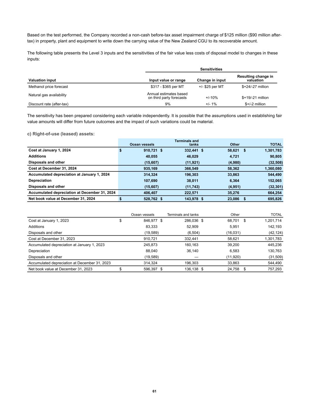 Based on the test performed, the Company recorded a non-cash before-tax asset impairment charge of $125 million ($90 million after- tax) in property, plant and equipment to write down the carrying value of the New Zealand CGU to its recoverable amount. The following table presents the Level 3 inputs and the sensitivities of the fair value less costs of disposal model to changes in these inputs: Sensitivities Valuation input Input value or range Change in input Resulting change in valuation Methanol price forecast $317 - $365 per MT +/- $25 per MT $+24/-27 million Natural gas availability Annual estimates based on third party forecasts +/-10% $+19/-21 million Discount rate (after-tax) 9% +/- 1% $+/-2 million The sensitivity has been prepared considering each variable independently. It is possible that the assumptions used in establishing fair value amounts will differ from future outcomes and the impact of such variations could be material. c) Right-of-use (leased) assets: Cost at January 1, 2024 $ 910,721 $ 332,441 $ 58,621 $ 1,301,783 Additions 40,055 46,029 4,721 90,805 Disposals and other (15,607) (11,921) (4,980) (32,508) Cost at December 31, 2024 935,169 366,549 58,362 1,360,080 Accumulated depreciation at January 1, 2024 314,324 196,303 33,863 544,490 Depreciation 107,690 38,011 6,364 152,065 Disposals and other (15,607) (11,743) (4,951) (32,301) Accumulated depreciation at December 31, 2024 406,407 222,571 35,276 664,254 Net book value at December 31, 2024 $ 528,762 $ 143,978 $ 23,086 $ 695,826 Ocean vessels Terminals and tanks Other TOTAL Ocean vessels Terminals and tanks Other TOTAL Cost at January 1, 2023 $ 846,977 $ 286,036 $ 68,701 $ 1,201,714 Additions 83,333 52,909 5,951 142,193 Disposals and other (19,589) (6,504) (16,031) (42,124) Cost at December 31, 2023 910,721 332,441 58,621 1,301,783 Accumulated depreciation at January 1, 2023 245,873 160,163 39,200 445,236 Depreciation 88,040 36,140 6,583 130,763 Disposals and other (19,589) — (11,920) (31,509) Accumulated depreciation at December 31, 2023 314,324 196,303 33,863 544,490 Net book value at December 31, 2023 $ 596,397 $ 136,138 $ 24,758 $ 757,293 61
