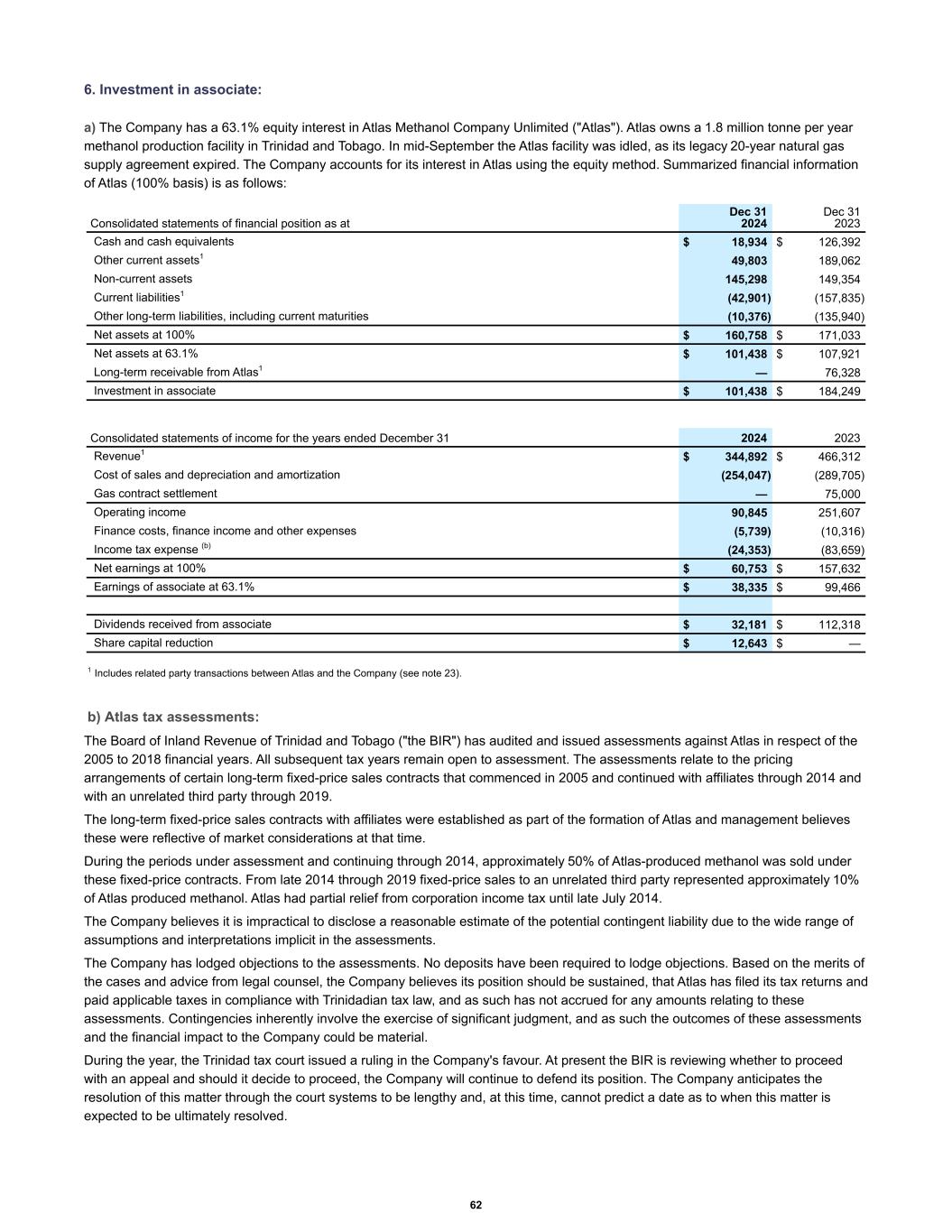 6. Investment in associate: a) The Company has a 63.1% equity interest in Atlas Methanol Company Unlimited ("Atlas"). Atlas owns a 1.8 million tonne per year methanol production facility in Trinidad and Tobago. In mid-September the Atlas facility was idled, as its legacy 20-year natural gas supply agreement expired. The Company accounts for its interest in Atlas using the equity method. Summarized financial information of Atlas (100% basis) is as follows: Cash and cash equivalents $ 18,934 $ 126,392 Other current assets1 49,803 189,062 Non-current assets 145,298 149,354 Current liabilities1 (42,901) (157,835) Other long-term liabilities, including current maturities (10,376) (135,940) Net assets at 100% $ 160,758 $ 171,033 Net assets at 63.1% $ 101,438 $ 107,921 Long-term receivable from Atlas1 — 76,328 Investment in associate $ 101,438 $ 184,249 Consolidated statements of financial position as at Dec 31 2024 Dec 31 2023 Revenue1 $ 344,892 $ 466,312 Cost of sales and depreciation and amortization (254,047) (289,705) Gas contract settlement — 75,000 Operating income 90,845 251,607 Finance costs, finance income and other expenses (5,739) (10,316) Income tax expense (b) (24,353) (83,659) Net earnings at 100% $ 60,753 $ 157,632 Earnings of associate at 63.1% $ 38,335 $ 99,466 Dividends received from associate $ 32,181 $ 112,318 Share capital reduction $ 12,643 $ — Consolidated statements of income for the years ended December 31 2024 2023 1 Includes related party transactions between Atlas and the Company (see note 23). b) Atlas tax assessments: The Board of Inland Revenue of Trinidad and Tobago ("the BIR") has audited and issued assessments against Atlas in respect of the 2005 to 2018 financial years. All subsequent tax years remain open to assessment. The assessments relate to the pricing arrangements of certain long-term fixed-price sales contracts that commenced in 2005 and continued with affiliates through 2014 and with an unrelated third party through 2019. The long-term fixed-price sales contracts with affiliates were established as part of the formation of Atlas and management believes these were reflective of market considerations at that time. During the periods under assessment and continuing through 2014, approximately 50% of Atlas-produced methanol was sold under these fixed-price contracts. From late 2014 through 2019 fixed-price sales to an unrelated third party represented approximately 10% of Atlas produced methanol. Atlas had partial relief from corporation income tax until late July 2014. The Company believes it is impractical to disclose a reasonable estimate of the potential contingent liability due to the wide range of assumptions and interpretations implicit in the assessments. The Company has lodged objections to the assessments. No deposits have been required to lodge objections. Based on the merits of the cases and advice from legal counsel, the Company believes its position should be sustained, that Atlas has filed its tax returns and paid applicable taxes in compliance with Trinidadian tax law, and as such has not accrued for any amounts relating to these assessments. Contingencies inherently involve the exercise of significant judgment, and as such the outcomes of these assessments and the financial impact to the Company could be material. During the year, the Trinidad tax court issued a ruling in the Company's favour. At present the BIR is reviewing whether to proceed with an appeal and should it decide to proceed, the Company will continue to defend its position. The Company anticipates the resolution of this matter through the court systems to be lengthy and, at this time, cannot predict a date as to when this matter is expected to be ultimately resolved. 62