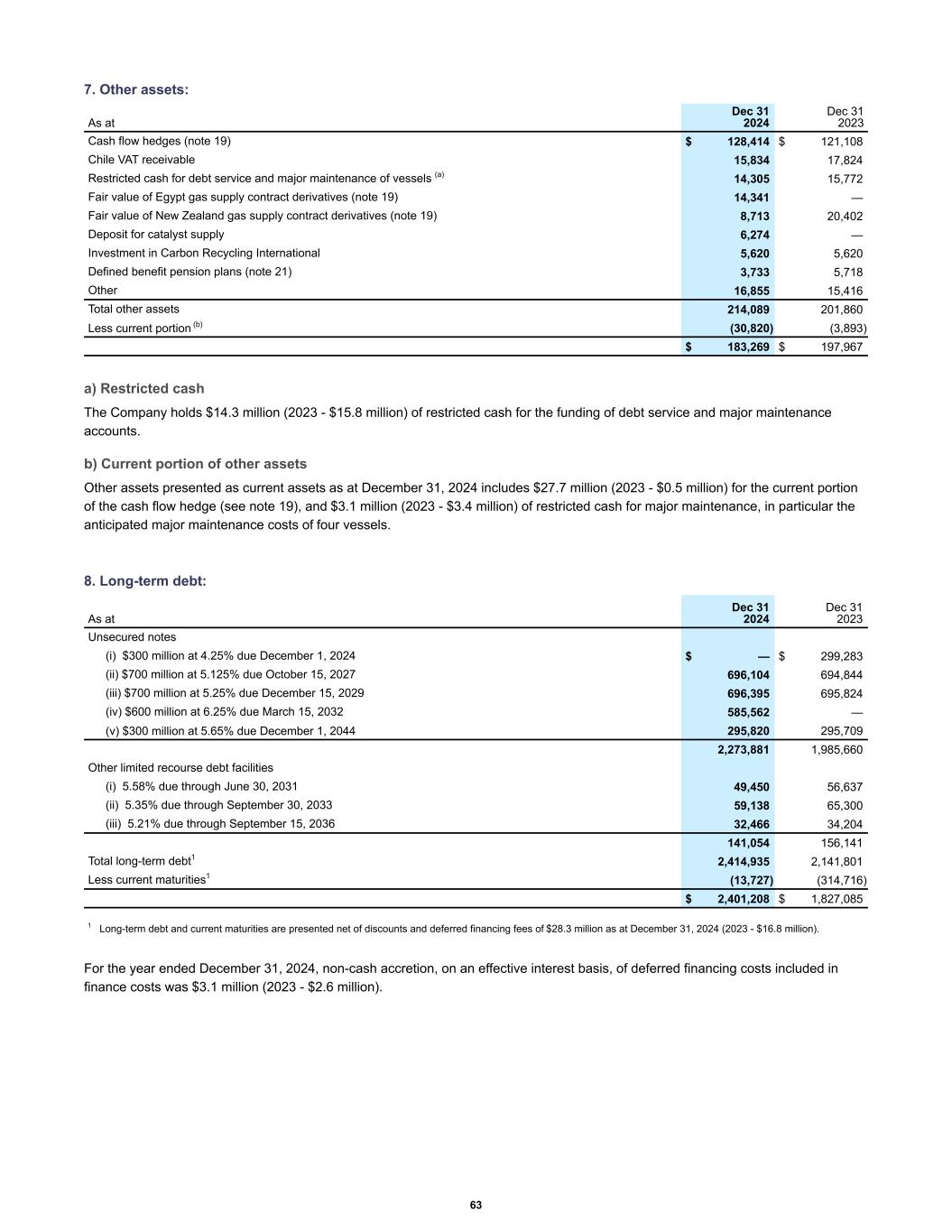 7. Other assets: Cash flow hedges (note 19) $ 128,414 $ 121,108 Chile VAT receivable 15,834 17,824 Restricted cash for debt service and major maintenance of vessels (a) 14,305 15,772 Fair value of Egypt gas supply contract derivatives (note 19) 14,341 — Fair value of New Zealand gas supply contract derivatives (note 19) 8,713 20,402 Deposit for catalyst supply 6,274 — Investment in Carbon Recycling International 5,620 5,620 Defined benefit pension plans (note 21) 3,733 5,718 Other 16,855 15,416 Total other assets 214,089 201,860 Less current portion (b) (30,820) (3,893) $ 183,269 $ 197,967 As at Dec 31 2024 Dec 31 2023 a) Restricted cash The Company holds $14.3 million (2023 - $15.8 million) of restricted cash for the funding of debt service and major maintenance accounts. b) Current portion of other assets Other assets presented as current assets as at December 31, 2024 includes $27.7 million (2023 - $0.5 million) for the current portion of the cash flow hedge (see note 19), and $3.1 million (2023 - $3.4 million) of restricted cash for major maintenance, in particular the anticipated major maintenance costs of four vessels. 8. Long-term debt: Unsecured notes (i) $300 million at 4.25% due December 1, 2024 $ — $ 299,283 (ii) $700 million at 5.125% due October 15, 2027 696,104 694,844 (iii) $700 million at 5.25% due December 15, 2029 696,395 695,824 (iv) $600 million at 6.25% due March 15, 2032 585,562 — (v) $300 million at 5.65% due December 1, 2044 295,820 295,709 2,273,881 1,985,660 Other limited recourse debt facilities (i) 5.58% due through June 30, 2031 49,450 56,637 (ii) 5.35% due through September 30, 2033 59,138 65,300 (iii) 5.21% due through September 15, 2036 32,466 34,204 141,054 156,141 Total long-term debt1 2,414,935 2,141,801 Less current maturities1 (13,727) (314,716) $ 2,401,208 $ 1,827,085 As at Dec 31 2024 Dec 31 2023 1 Long-term debt and current maturities are presented net of discounts and deferred financing fees of $28.3 million as at December 31, 2024 (2023 - $16.8 million). For the year ended December 31, 2024, non-cash accretion, on an effective interest basis, of deferred financing costs included in finance costs was $3.1 million (2023 - $2.6 million). 63